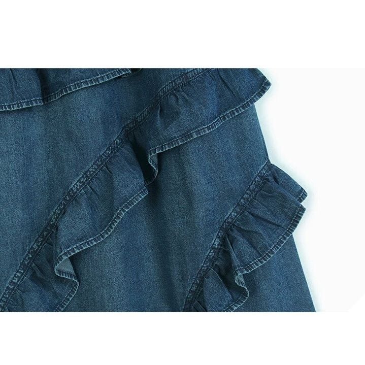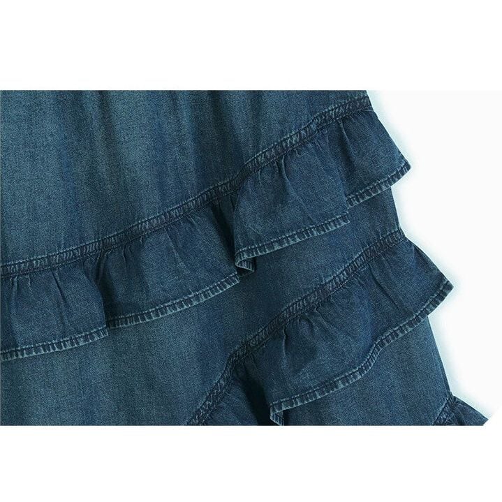 フリルリボンのライン飾りがキュートな、Aライン・ロング丈のデニムスカートです。ウエストはゴムなので、着脱が簡単で履き心地が良いです。どんなトップスとも合わせやすい、ガーリーな印象のカジュアルアイテムです。色は3色から選べます。