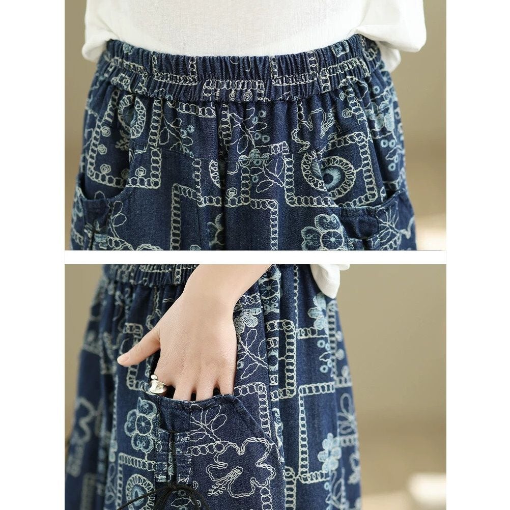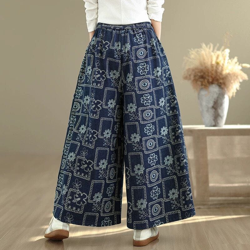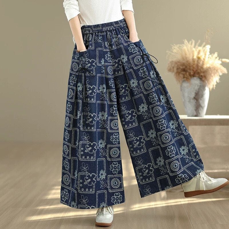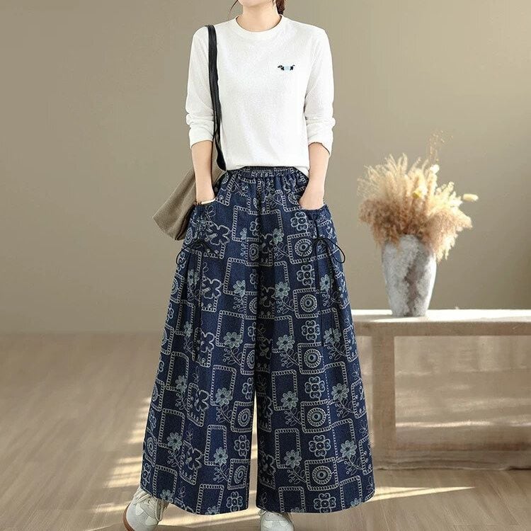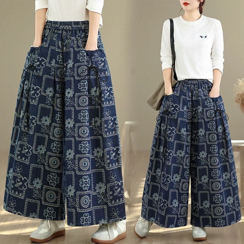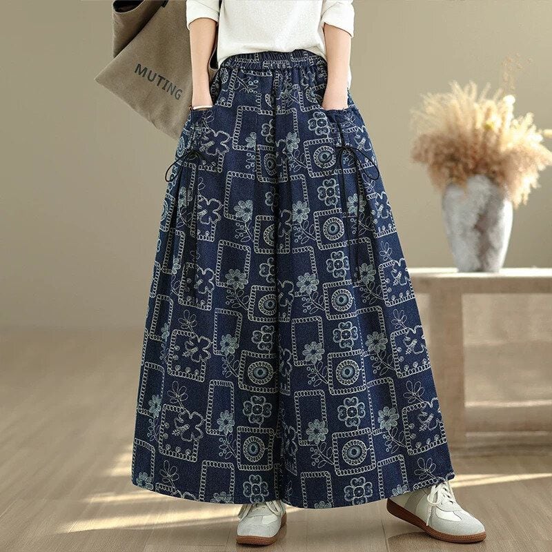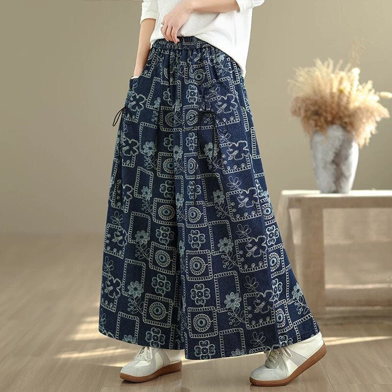 RETRO PRINT ELASTIC WAIST A-LINE WIDE LEG DENIM PANTS 1color M-16002