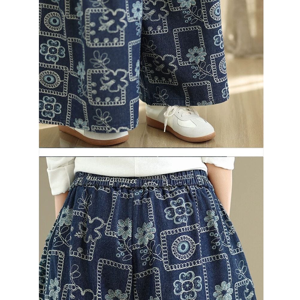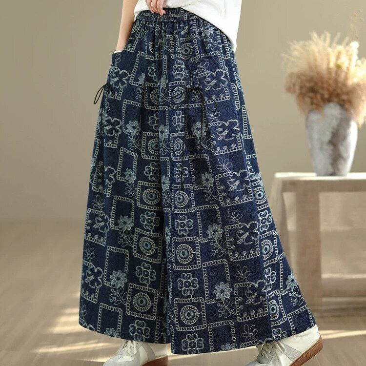 レトロな刺繍のようなプリントがお洒落な、Aラインのワイドレッグ・デニムパンツです。ウエストはゴムなので、着脱が簡単で履き心地が良いです。紐で結ばれたボックスプリーツのポケットがキュートな、コーディネートのアクセントになるカジュアルアイテムです。