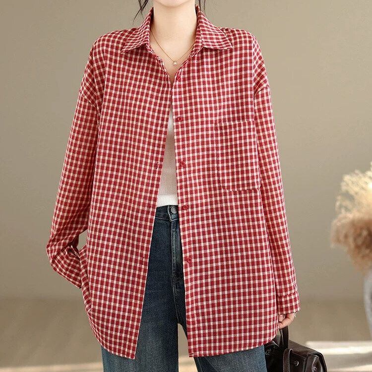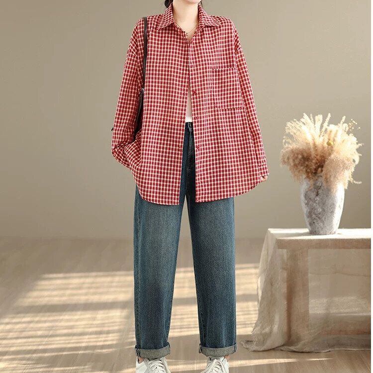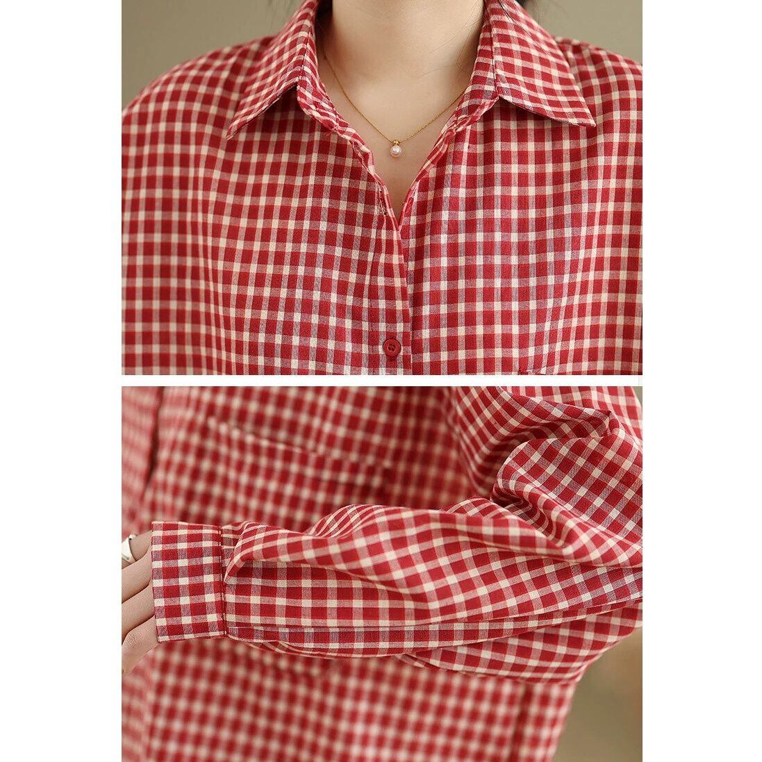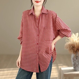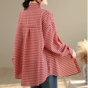 レトロなチェック柄の生地でできた、ポロ襟・長袖・ラウンドカットのカジュアルシャツです。ゆったりとしたシルエットで、羽織りものとしても活躍するコーディネートのアクセントになるアイテムです。色はブラックとレッドの2色から選べます。