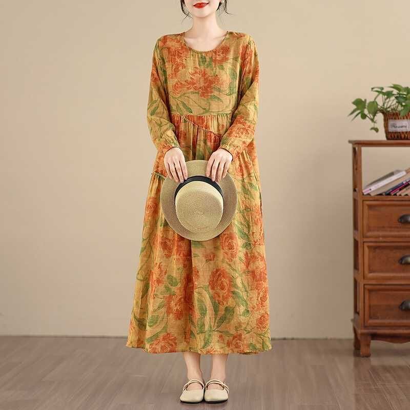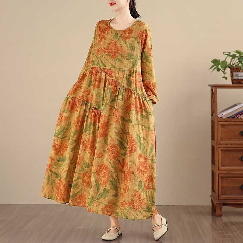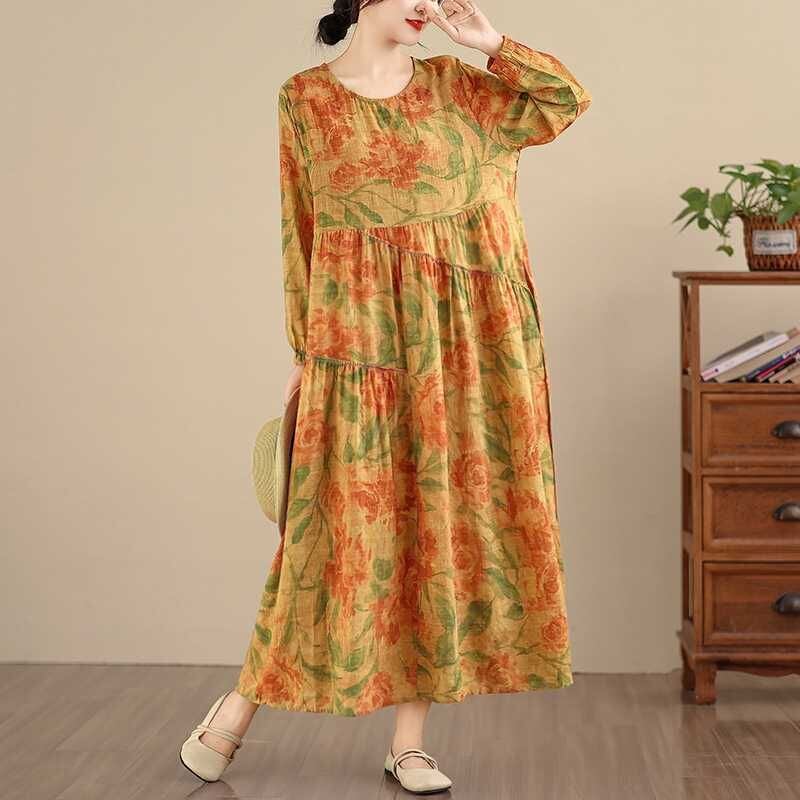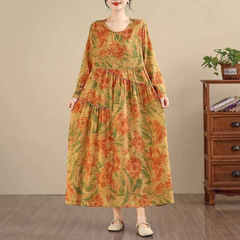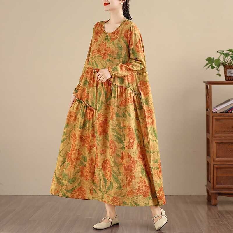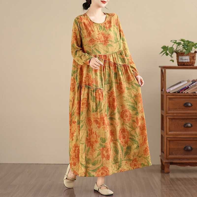 YELLOW FLOWER PRINT BOAT NECK A-LINE LONG PULLOVER DRESS 1color M-16026