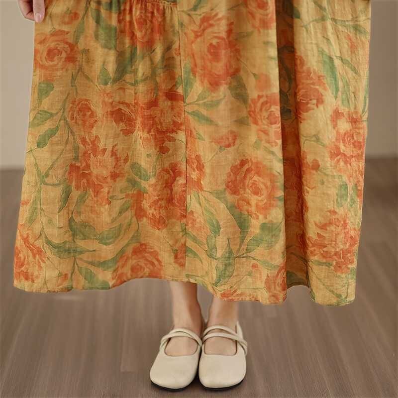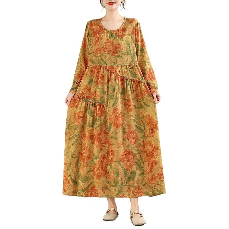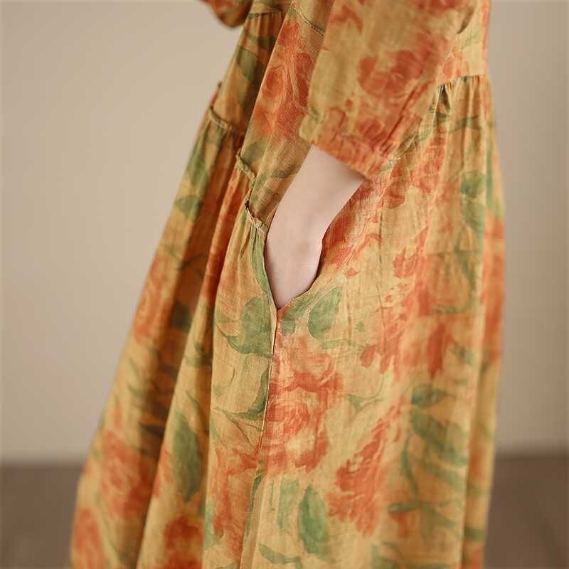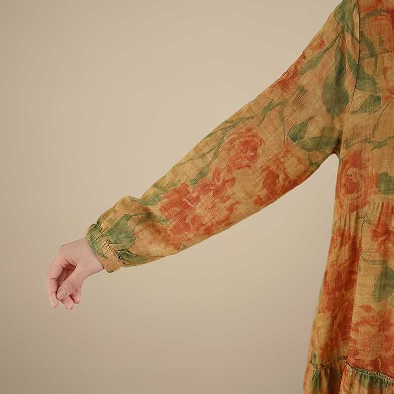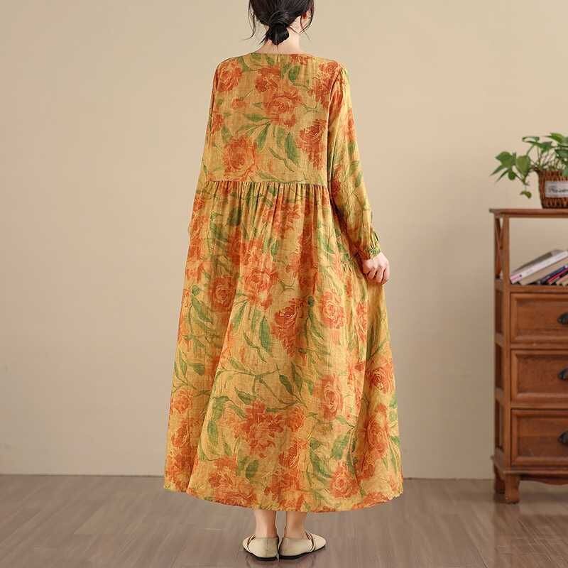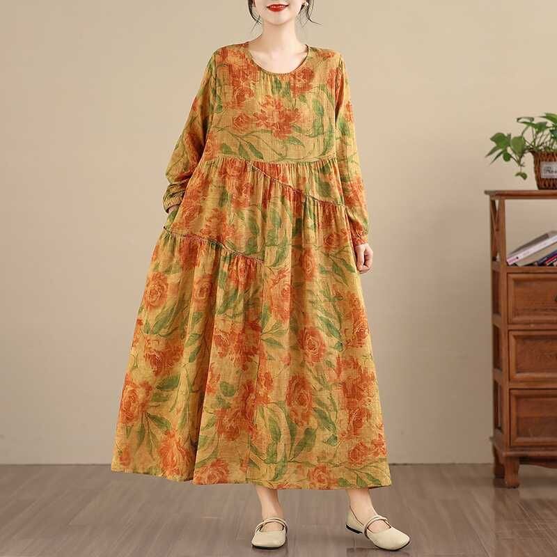 YELLOW FLOWER PRINT BOAT NECK A-LINE LONG PULLOVER DRESS 1color M-16026