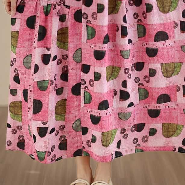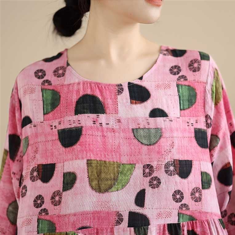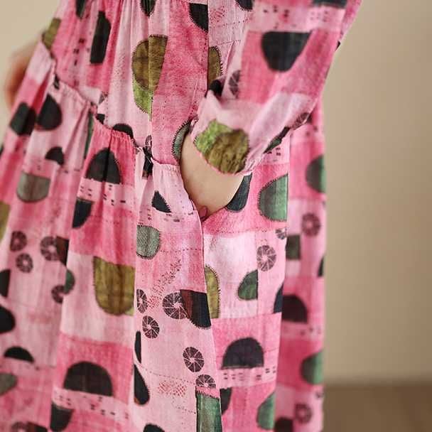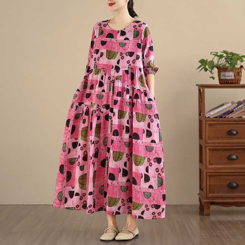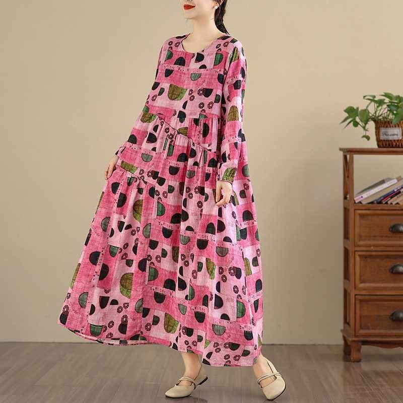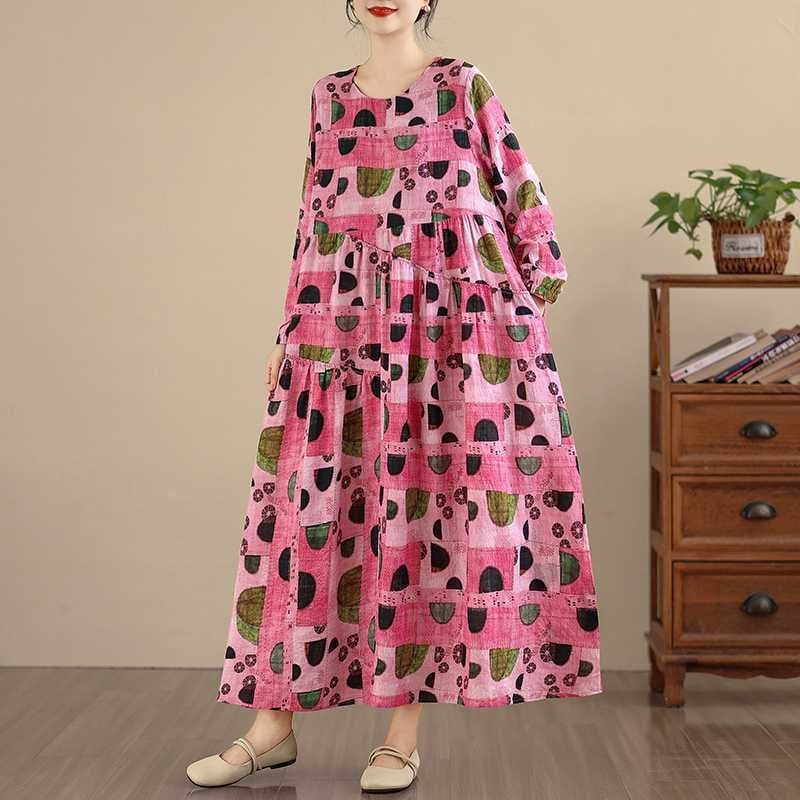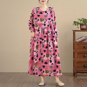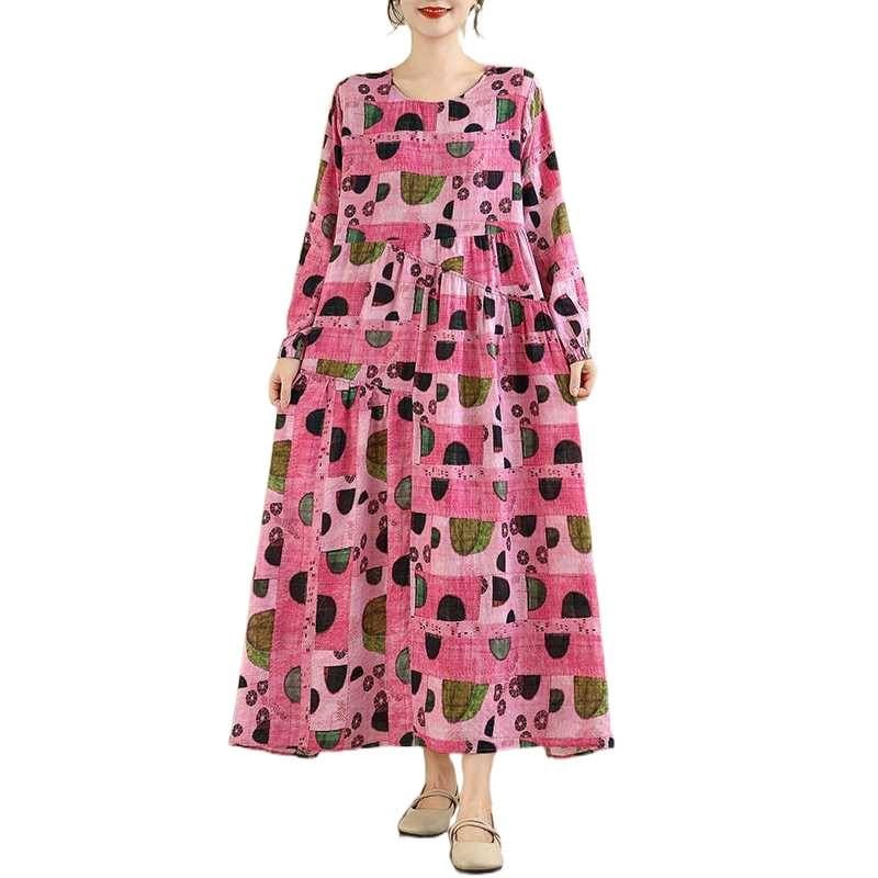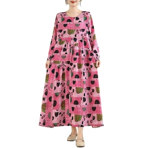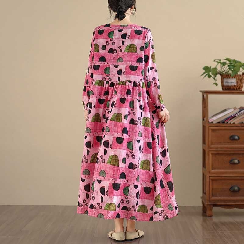 PINK PRINT BOAT NECK A-LINE LONG PULLOVER DRESS 1color M-16027