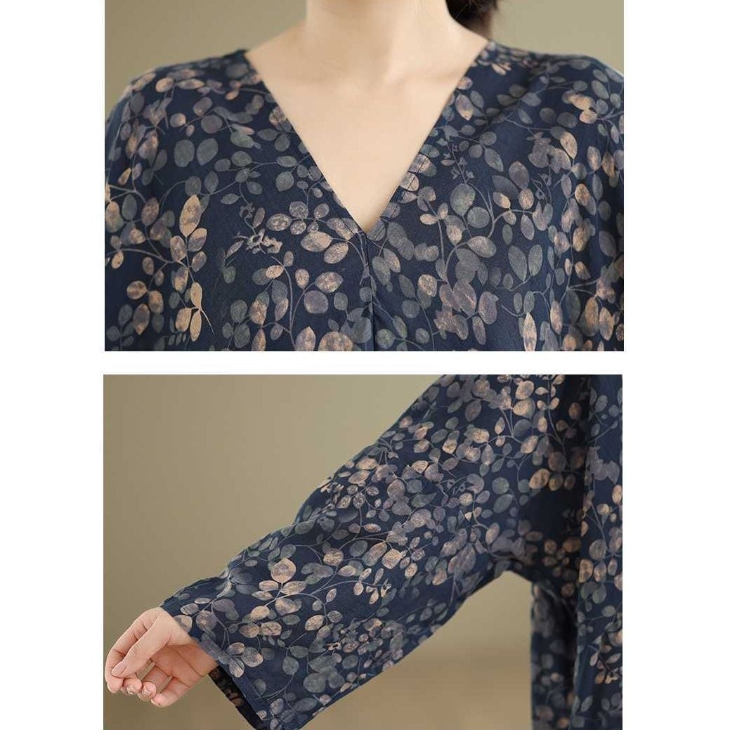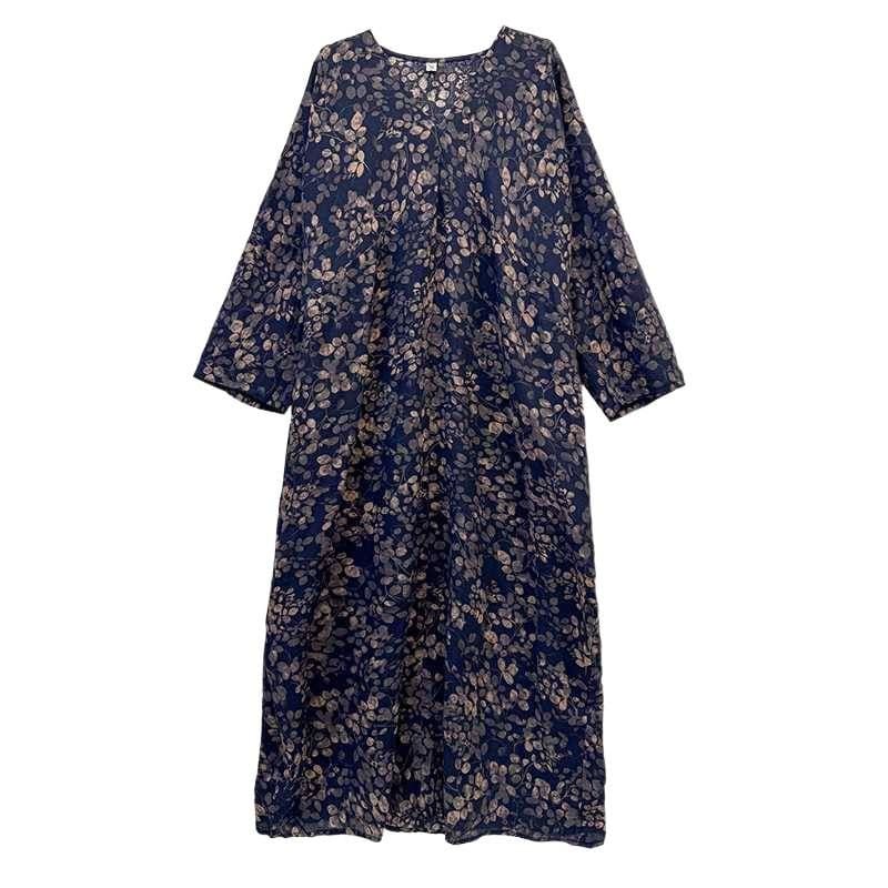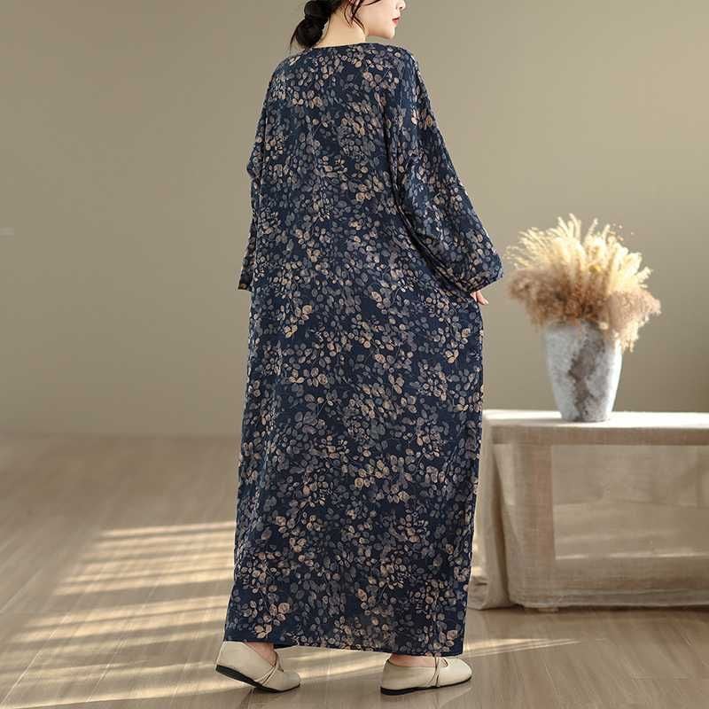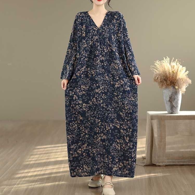 紺地にアーティスティックなボタニカル柄がお洒落な、Vネック・長袖・マキシ丈のプルオーバーワンピースです。ゆったりとしたワイド幅のシルエットが魅力的な、リラックスした印象のカジュアルアイテムです。