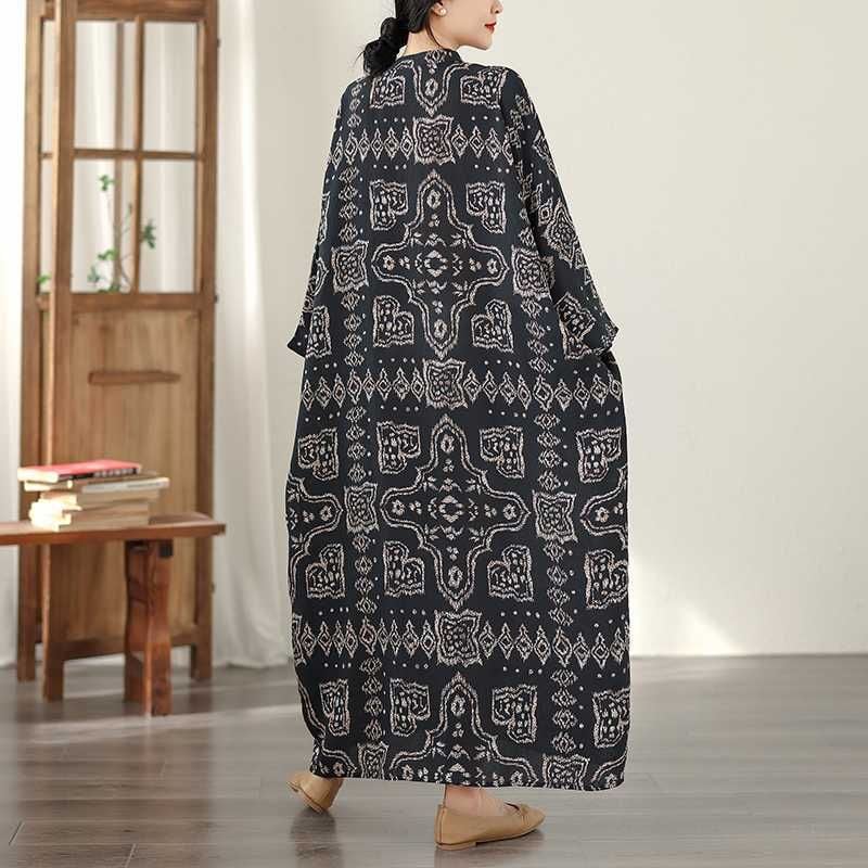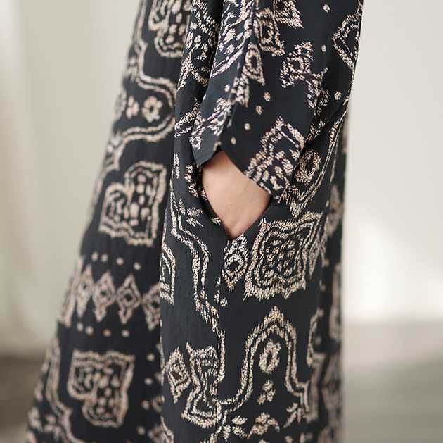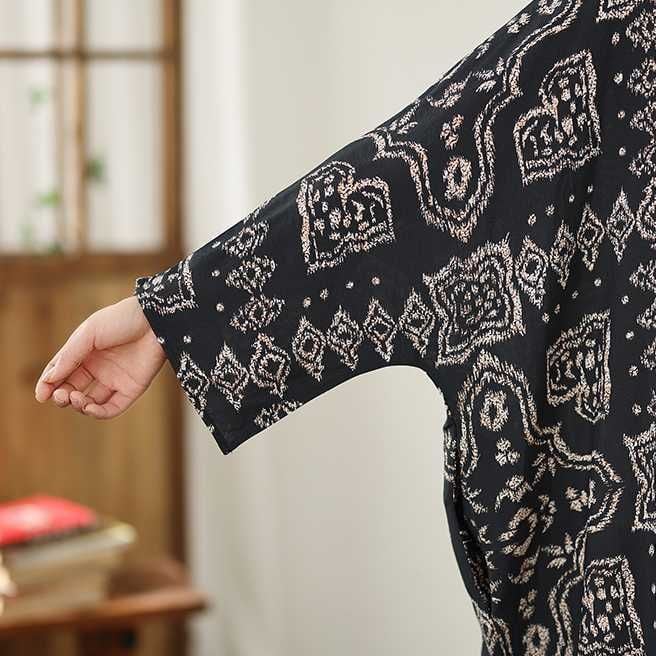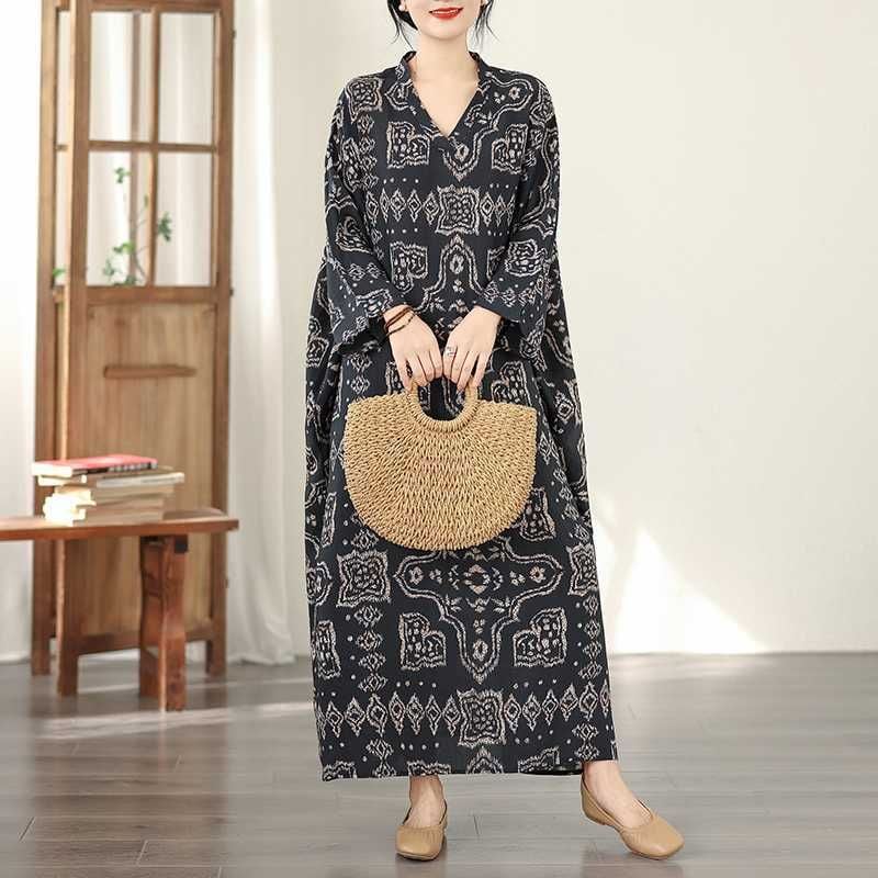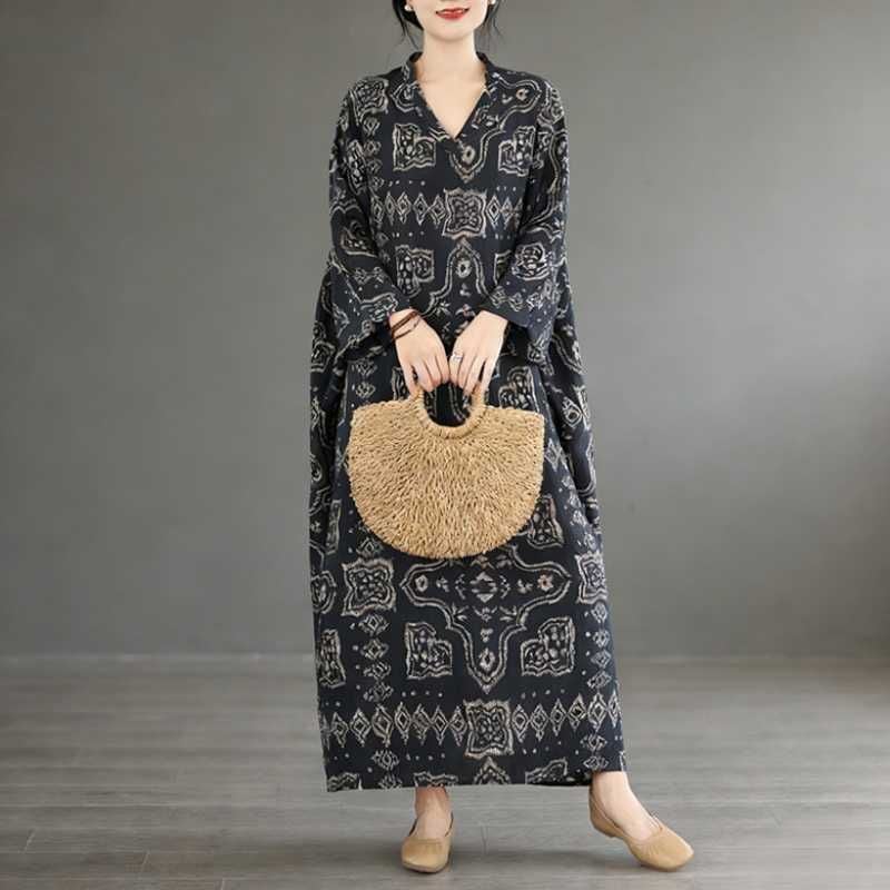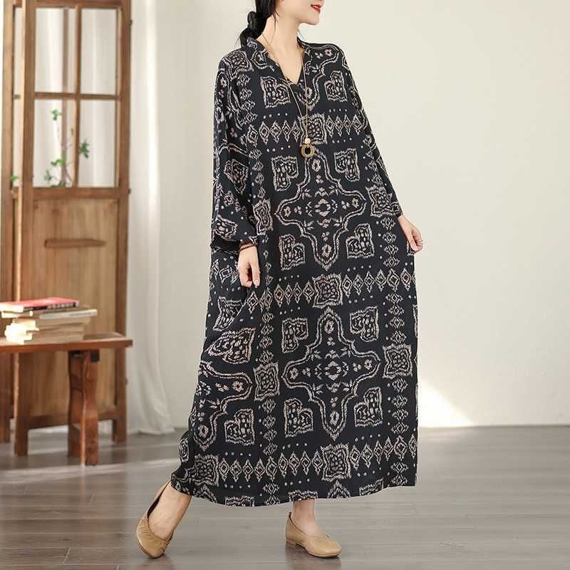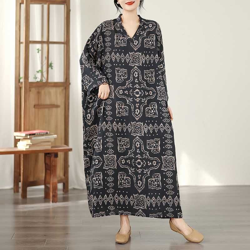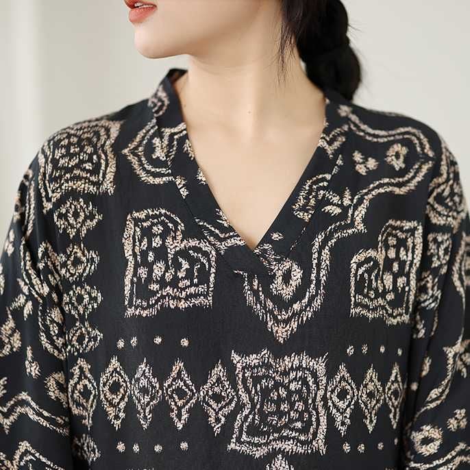 BLACK ETHNIC PRINT V-NECK MAXI PULLOVER DRESS 1color M-16031