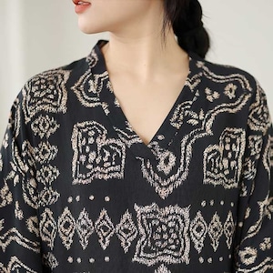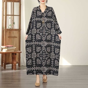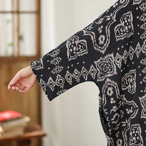 モノトーンカラーのエスニックな柄がクールな、Vネック・長袖・マキシ丈のプルオーバーワンピースです。ゆったりとしたワイド幅のシルエットが魅力的な、リラックスした印象のカジュアルアイテムです。