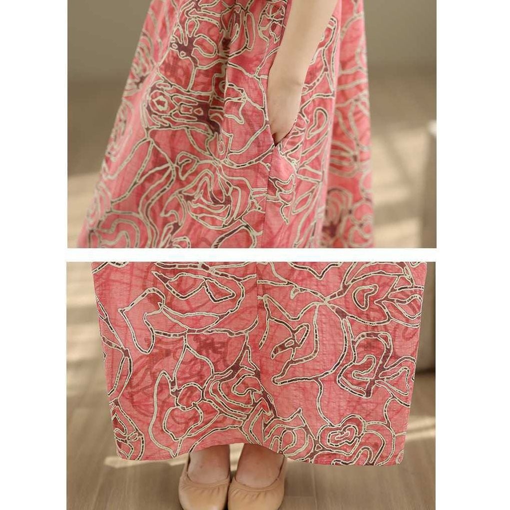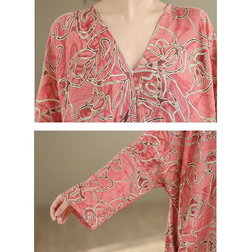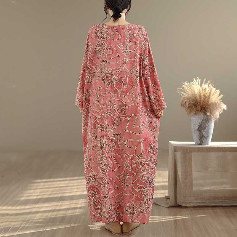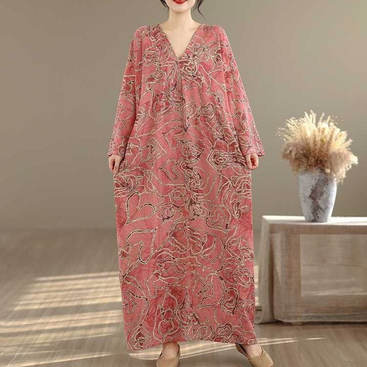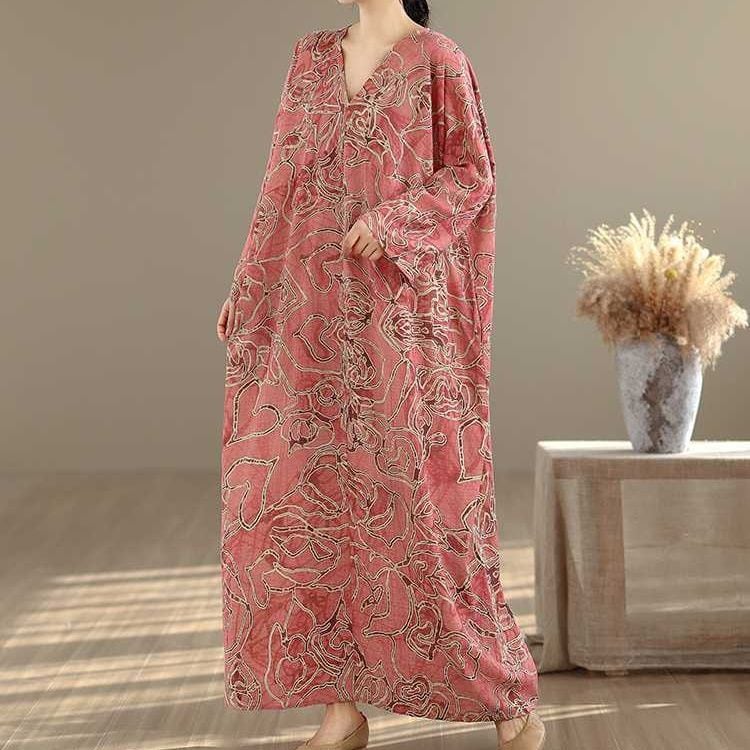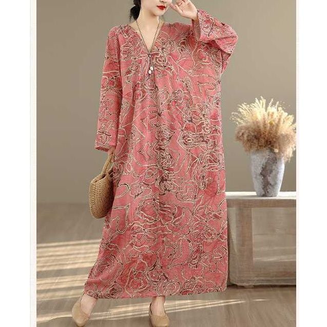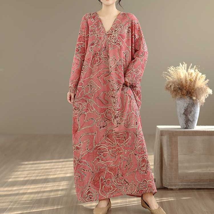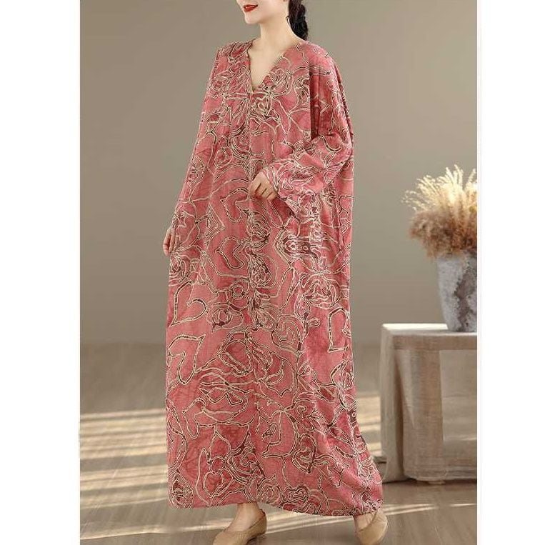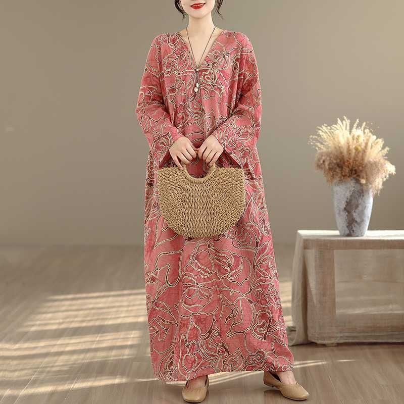 PINK ETHNIC PRINT V-NECK MAXI PULLOVER DRESS 1color M-16036