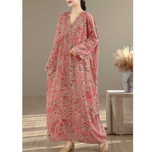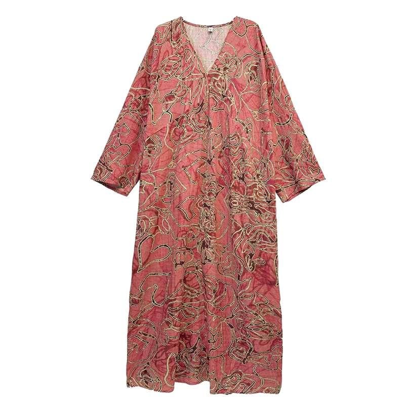 サーモンピンクの絞り染めのようなベースにアーティスティックな柄がクールな、Vネック・長袖・マキシ丈のプルオーバーワンピースです。ゆったりとしたワイド幅のシルエットが魅力的な、リラックスした印象のカジュアルアイテムです。