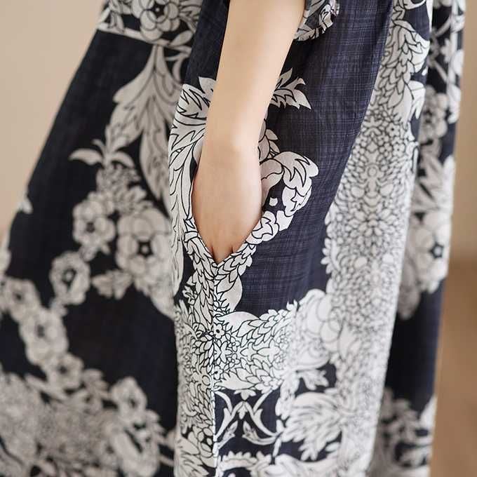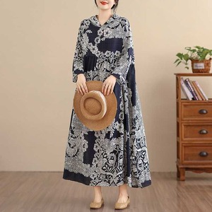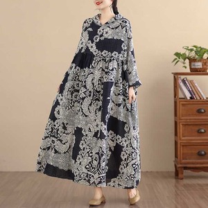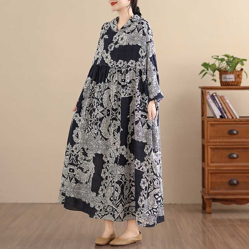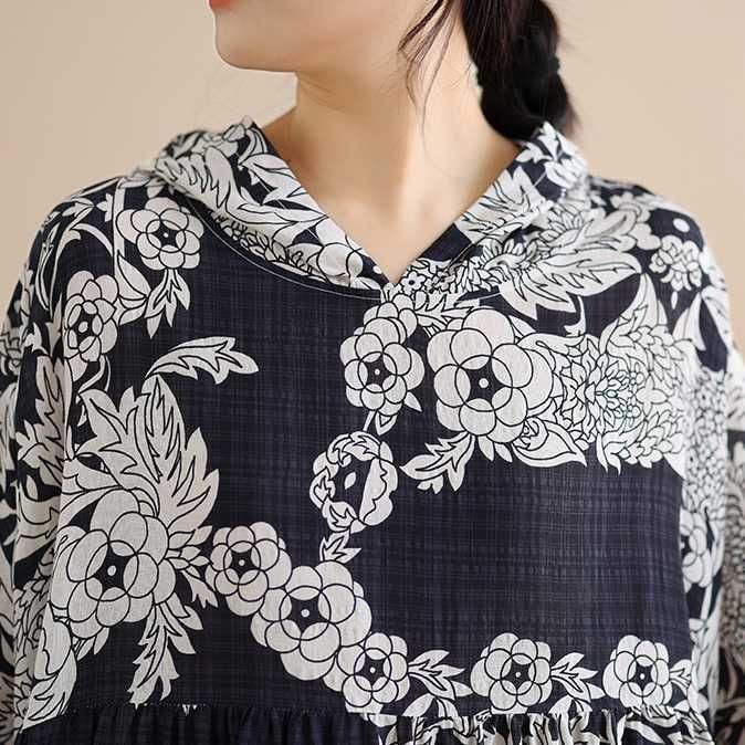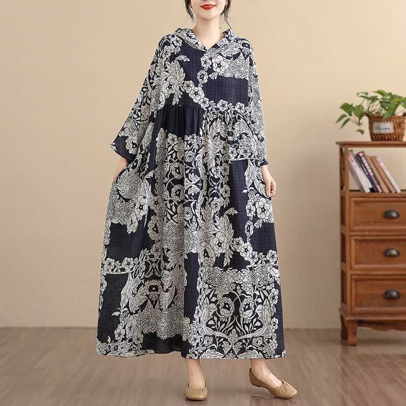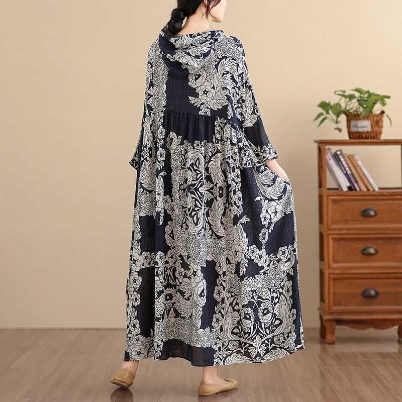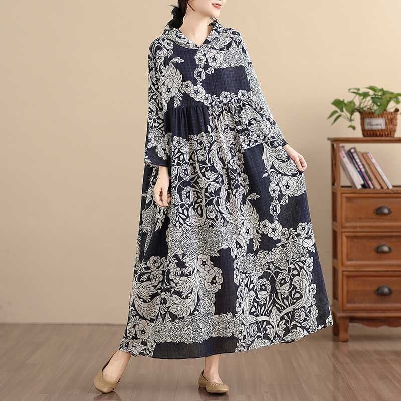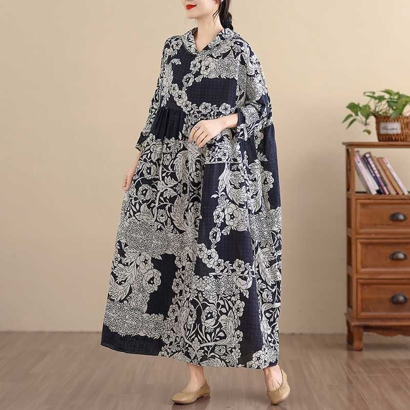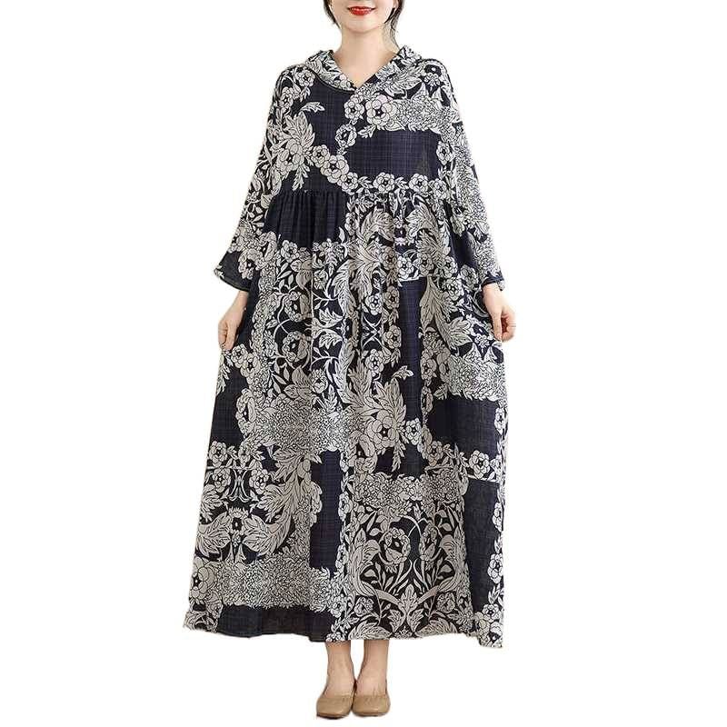 BOTANICAL PRINT HOODED A-LINE LONG PULLOVER DRESS 1color M-16038
