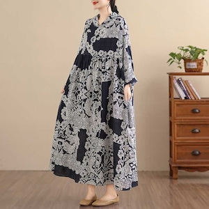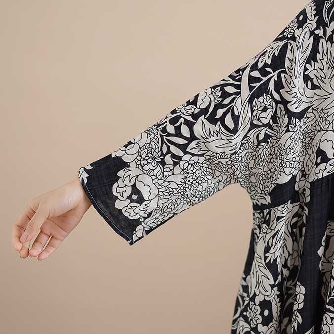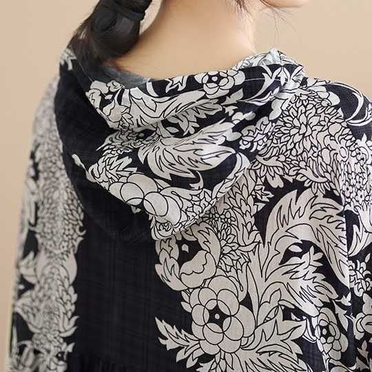 ブラック地に白のアーティスティックなボタニカル柄が美しい、フード付き・長袖・ロング丈のプルオーバーワンピースです。ウエストの切り返しにギャザーの入った、ワイド幅のA ラインシルエットが魅力的なカジュアルアイテムです。