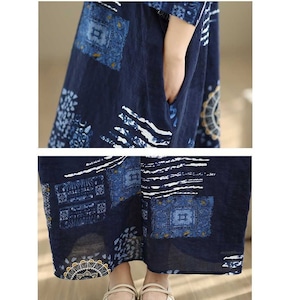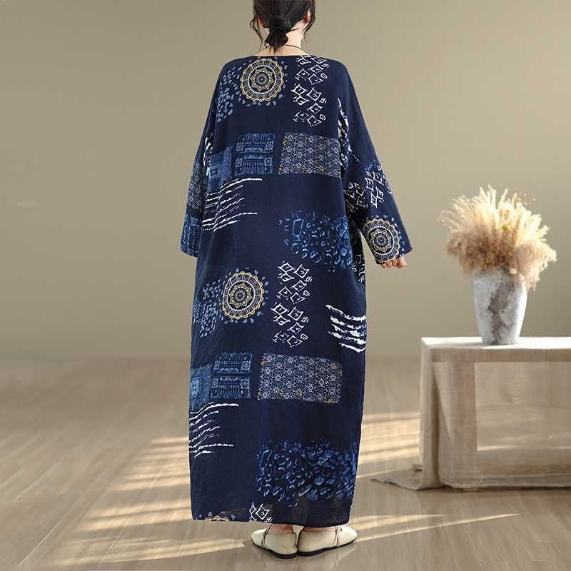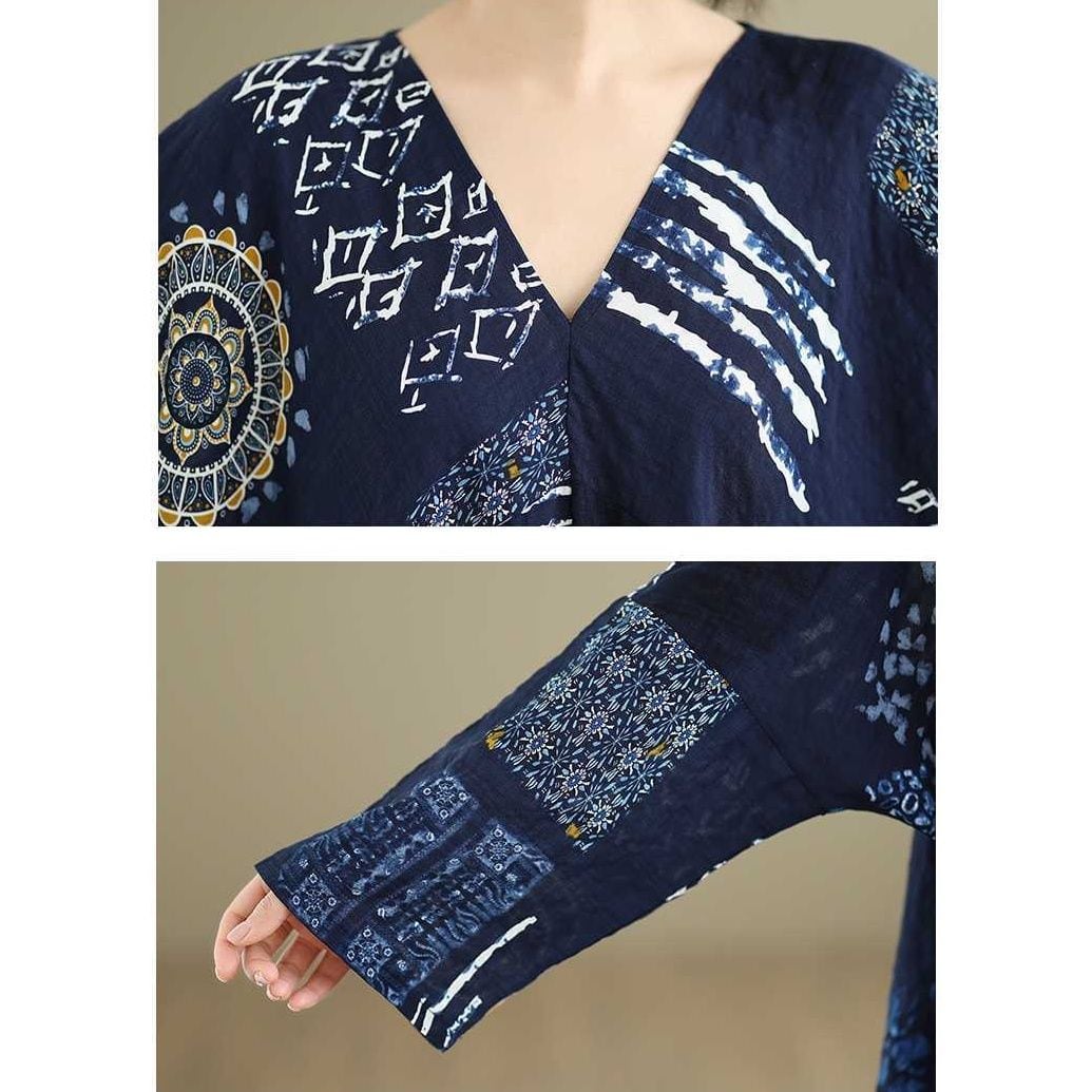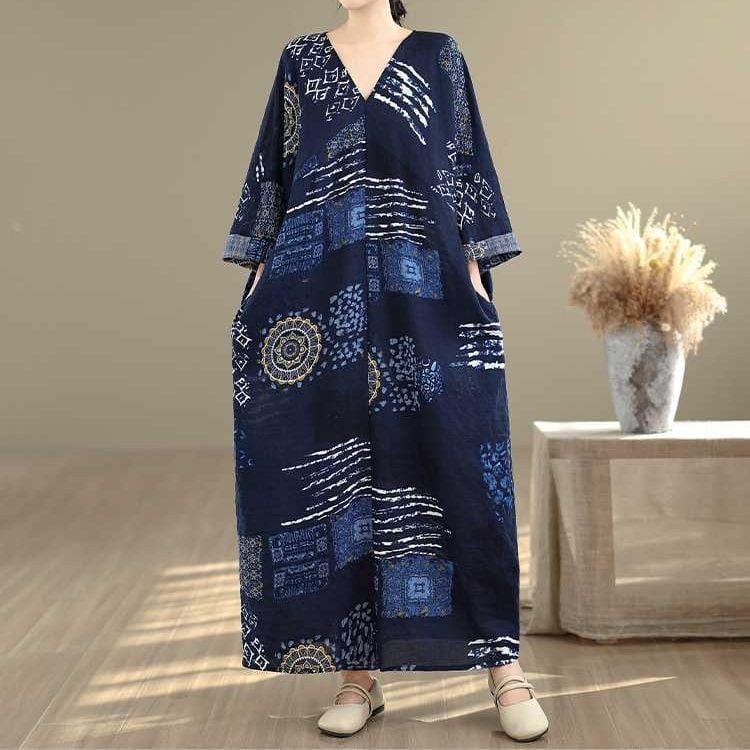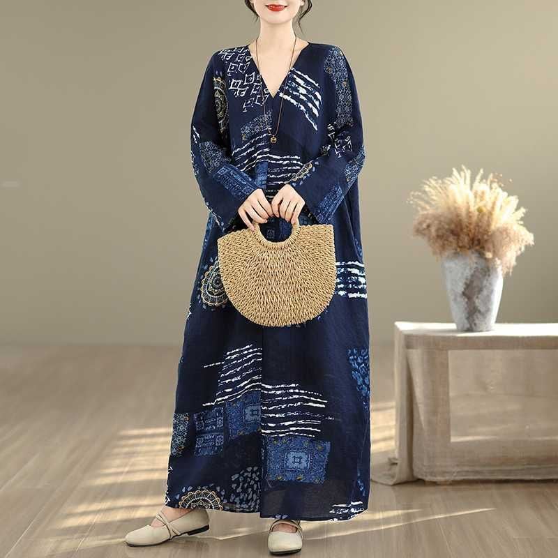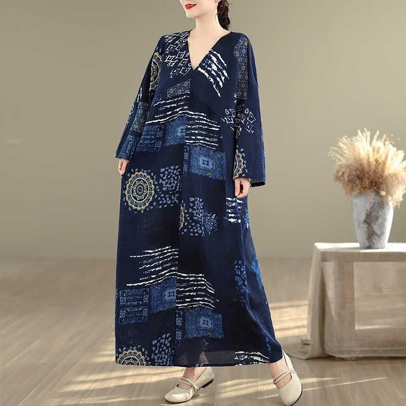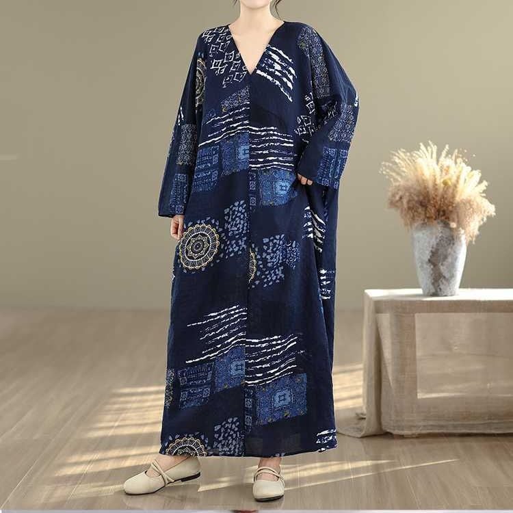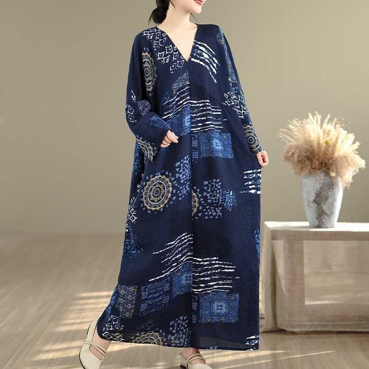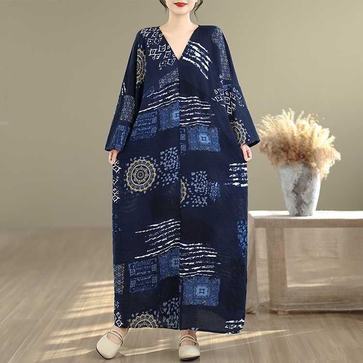 紺地にアーティスティックな柄がお洒落な、Vネック・長袖・マキシ丈のプルオーバーワンピースです。ワイド幅のゆったりとしたシルエットが、エレガントでリラックスした印象のアイテムです。