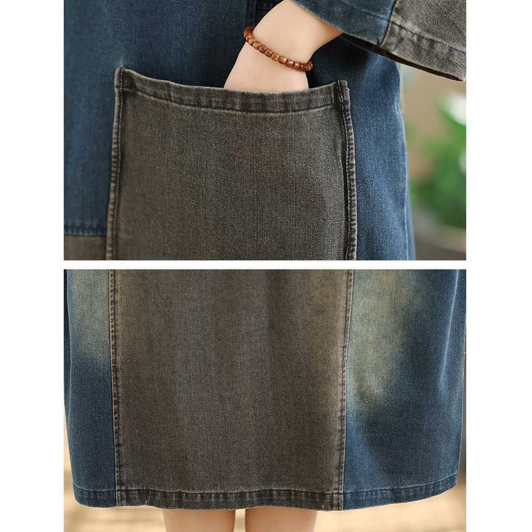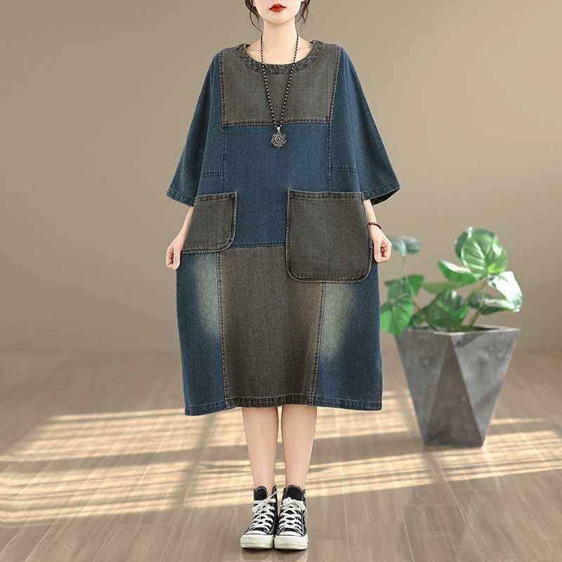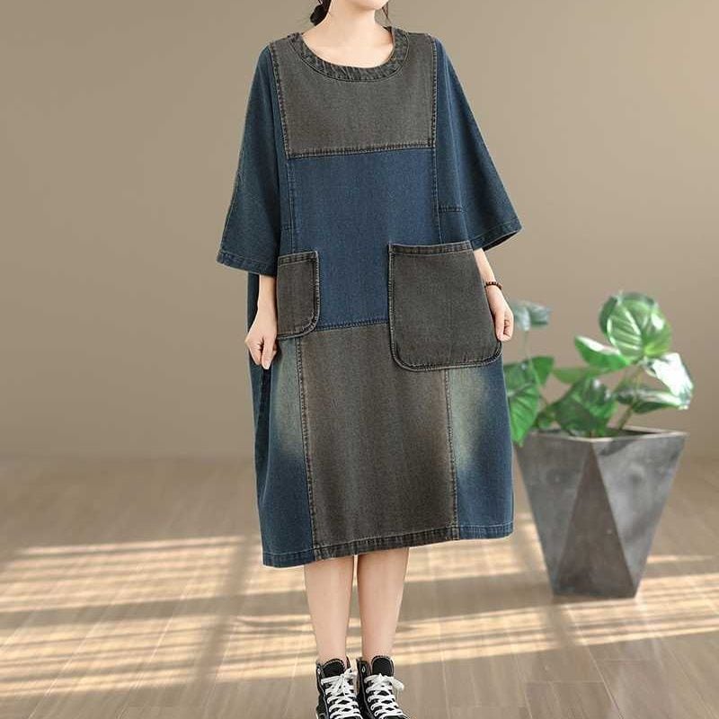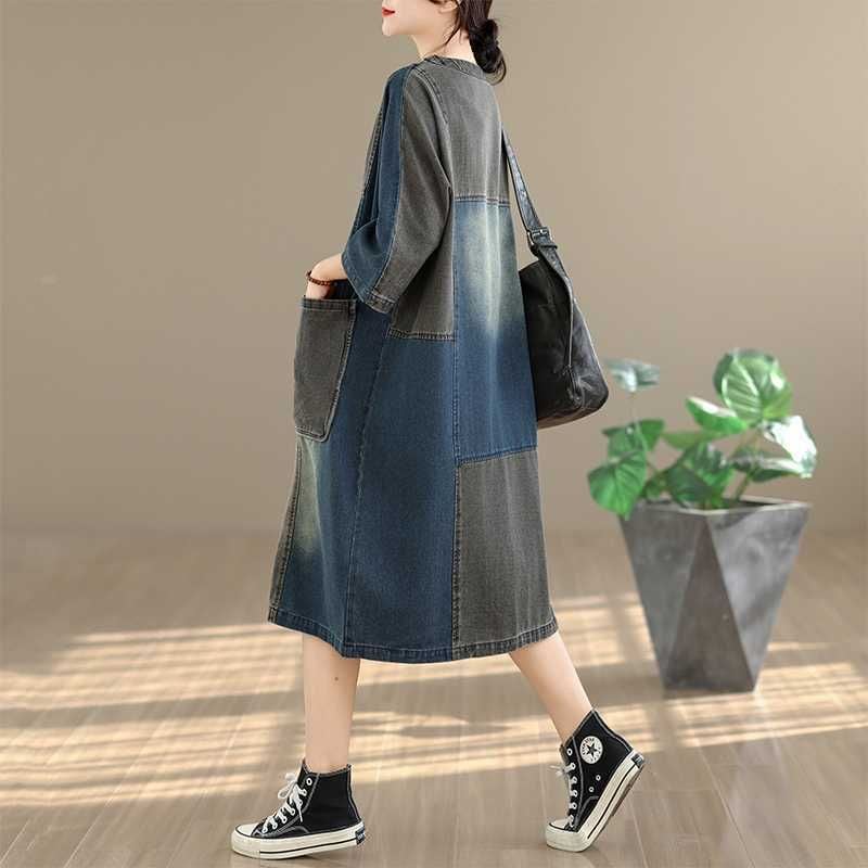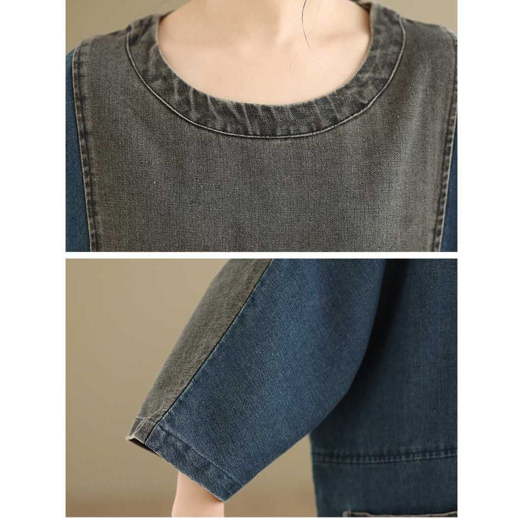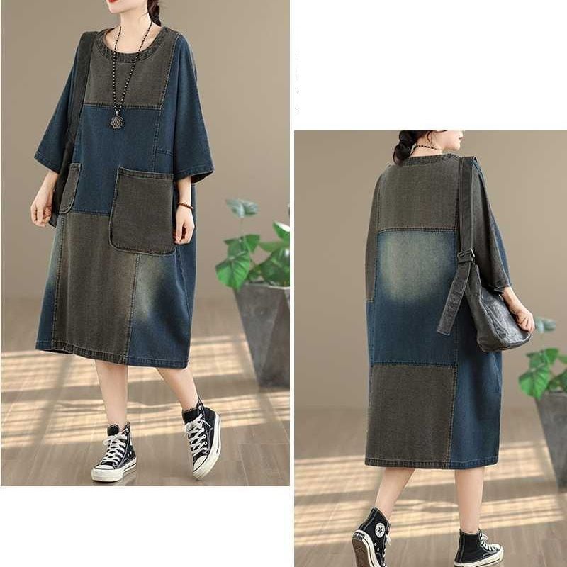 DENIM PATCHWORK BOAT NECK 3/4 SLEEVES MIDI PULLOVER DRESS 1color M-16052