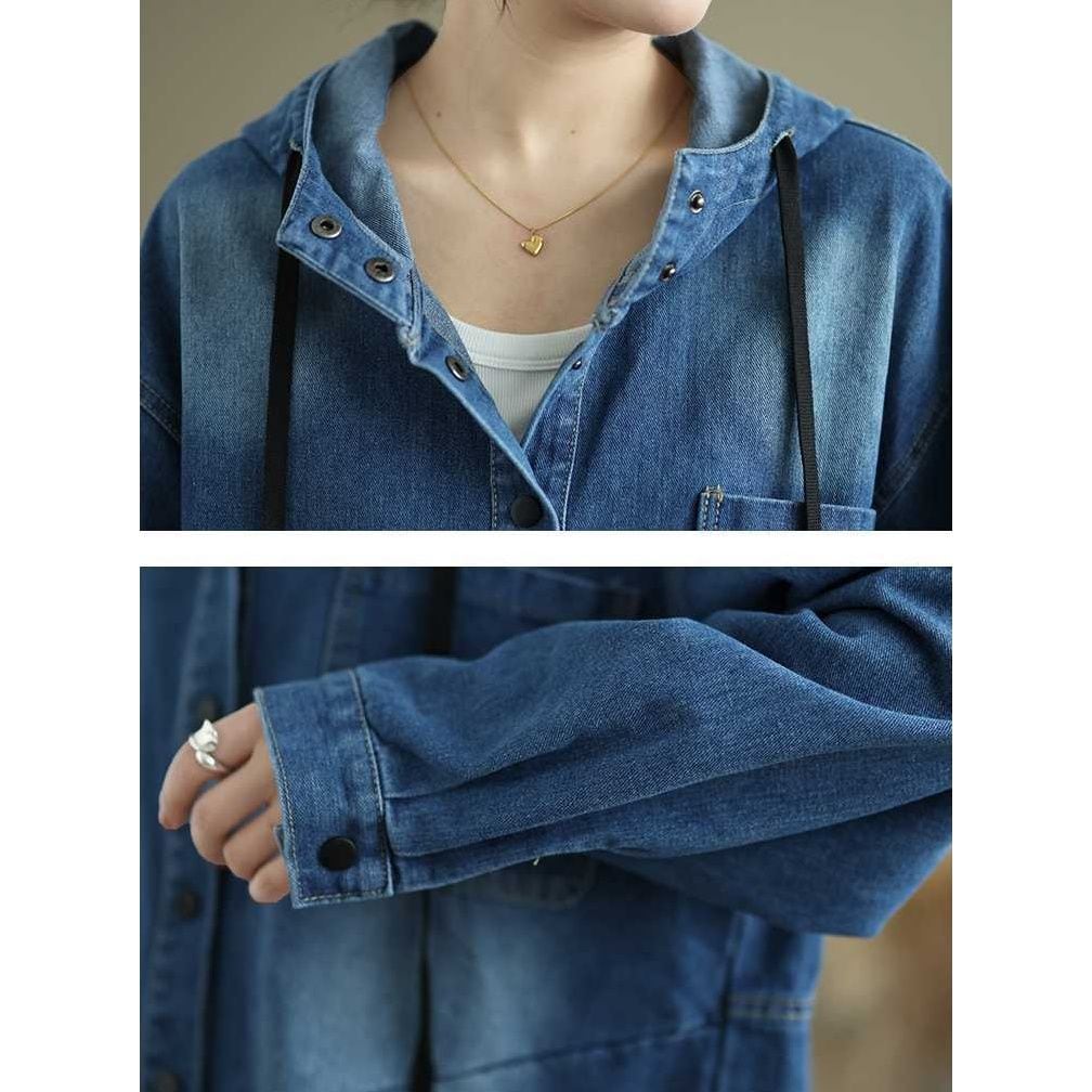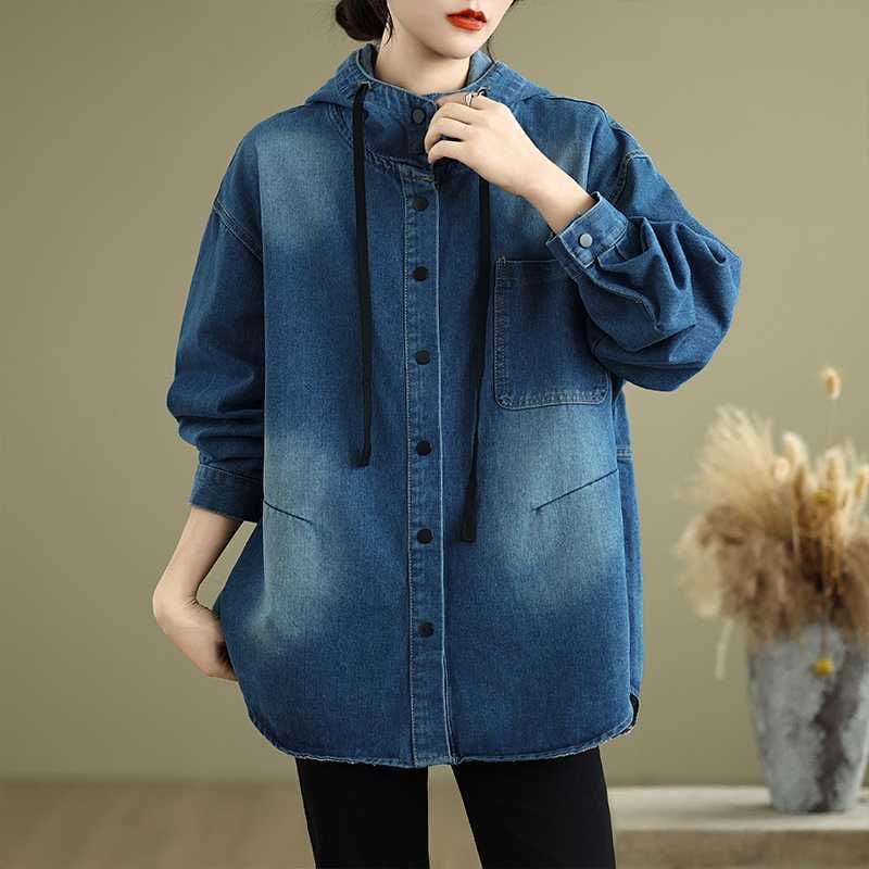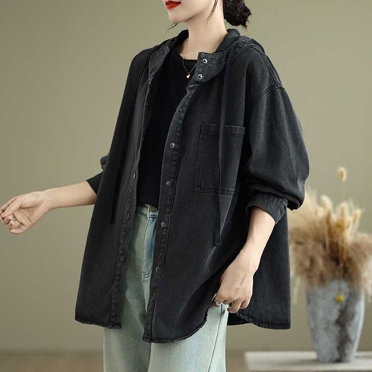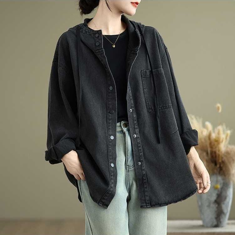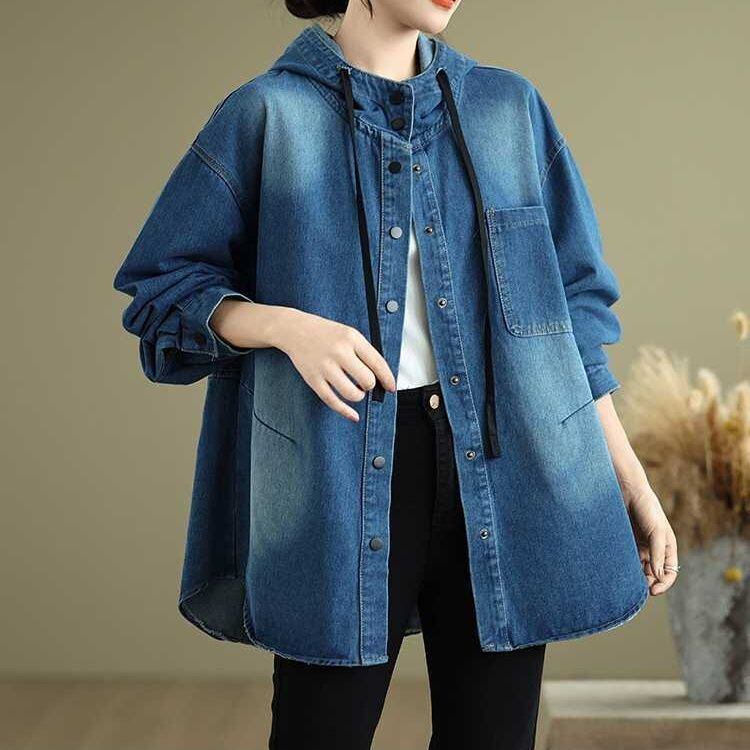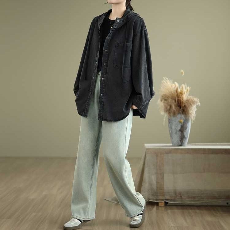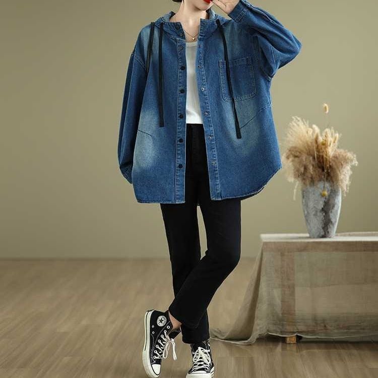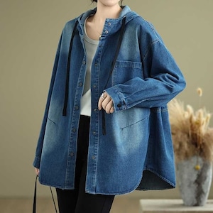 フードやスナップボタンが嬉しい、長袖・ラウンドカットのデニムシャツジャケットです。ドロップショルダーのゆったりとしたシルエットで、着まわし力の高いカジュアルアイテムです。ブルーとブラックの2色から選べます。