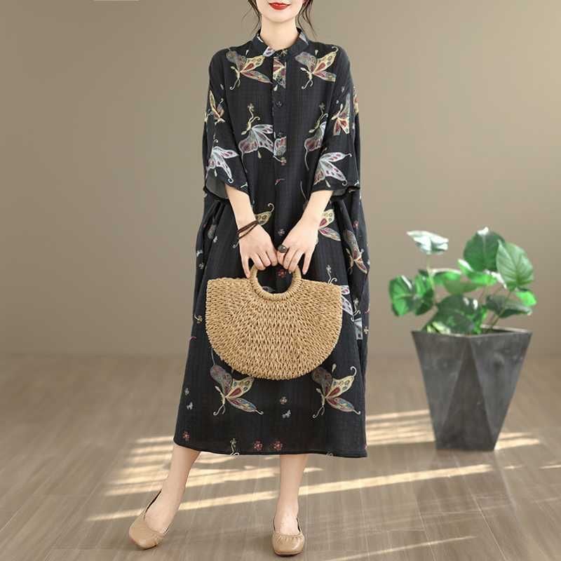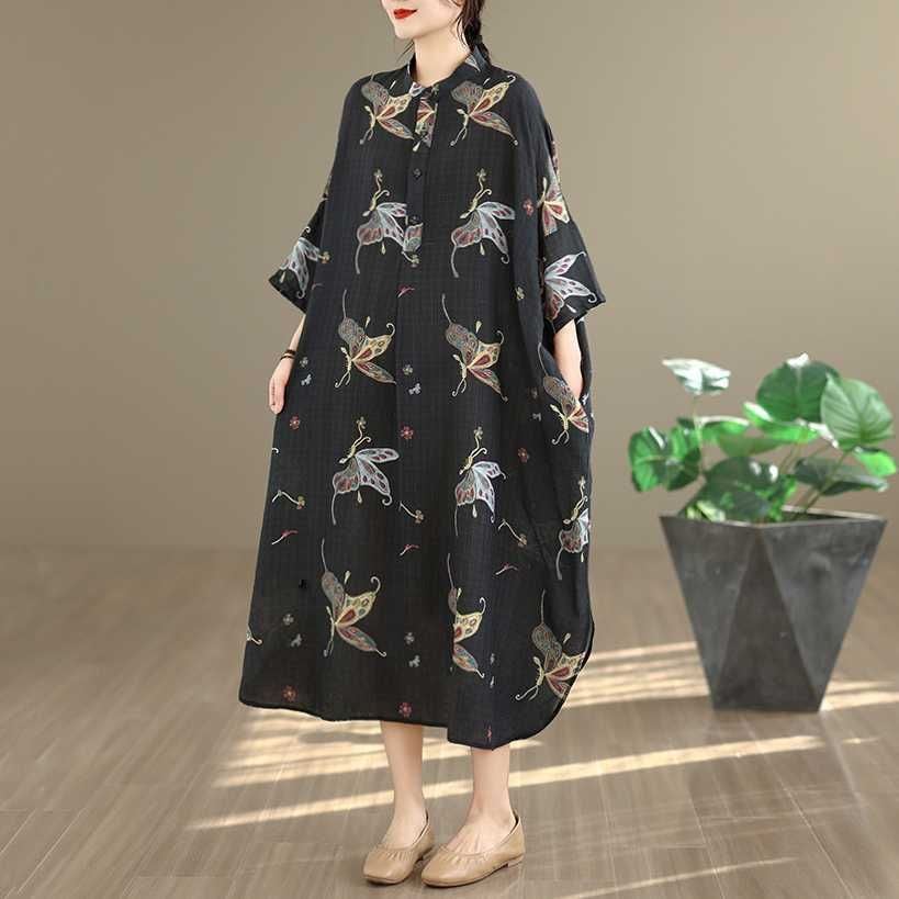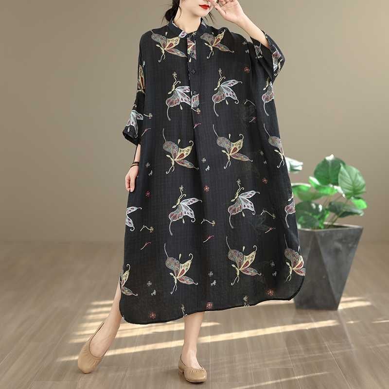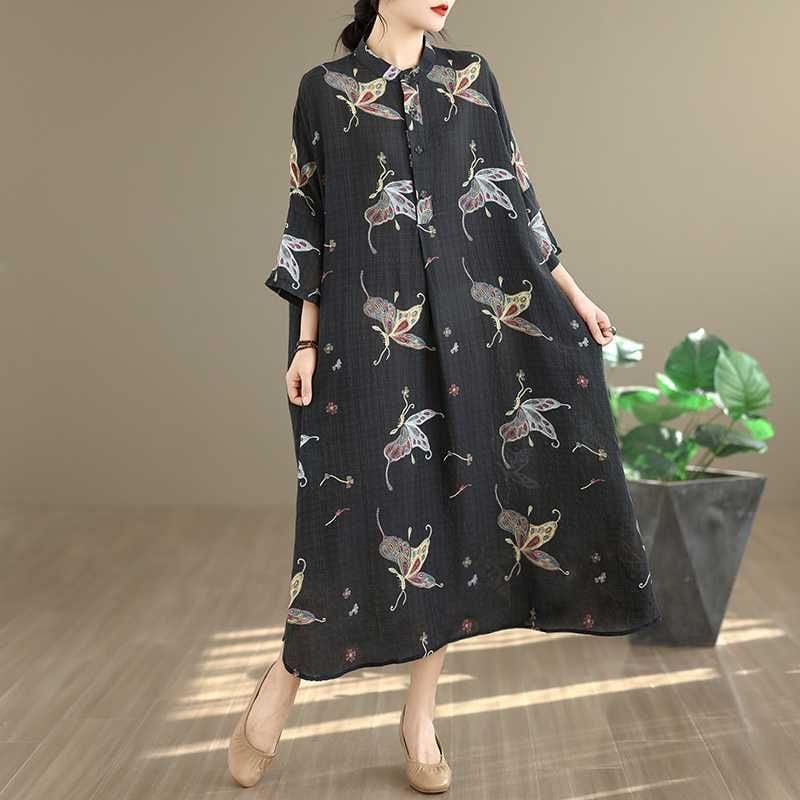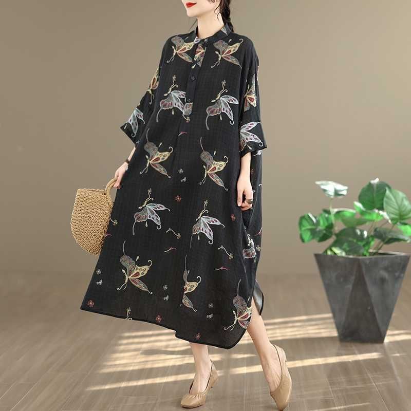 ブラック地にアーティスティックな蝶のプリントが美しい、スタンドカラー・ハーフボタン・7分袖・膝下丈のシャツワンピースです。ゆったりとしたワイド幅の裾はラウンドカットで、サイドがスリットのようなシルエットになっています。着心地が良くリラックスした印象のアイテムです。