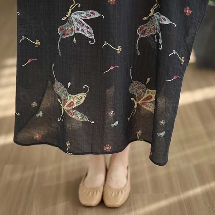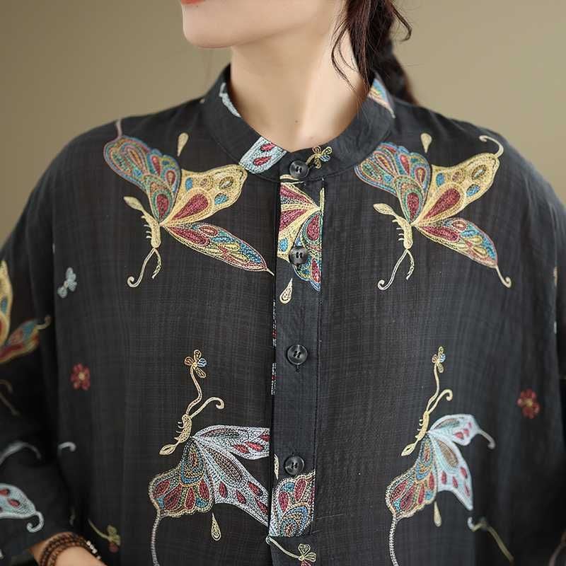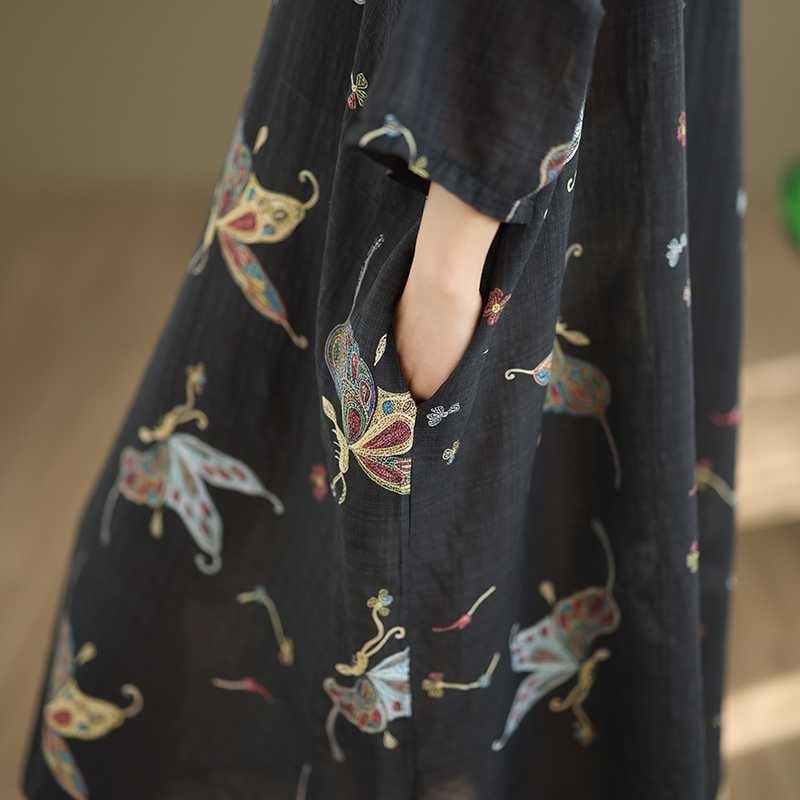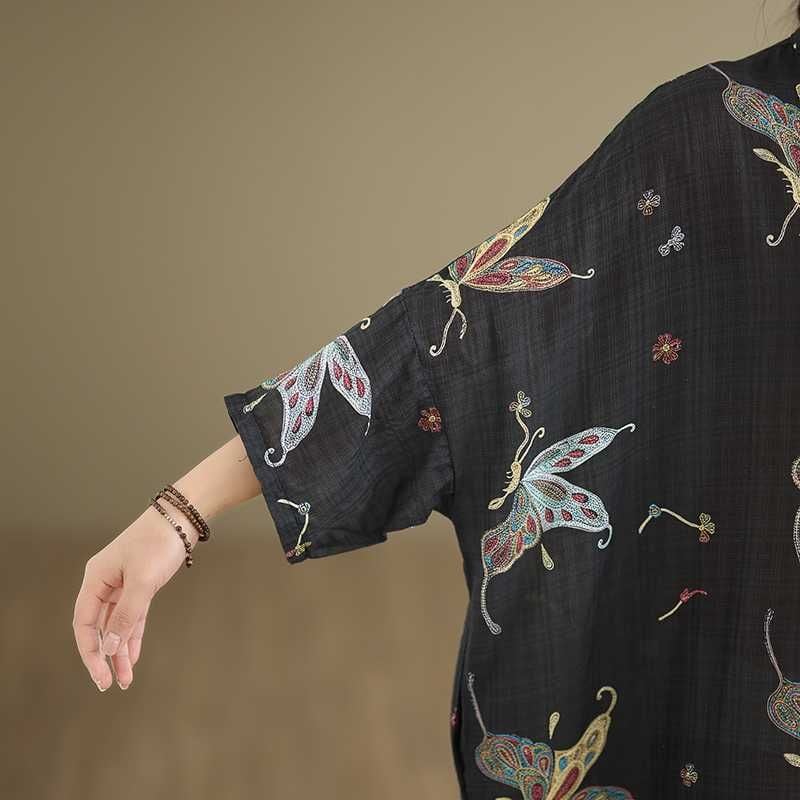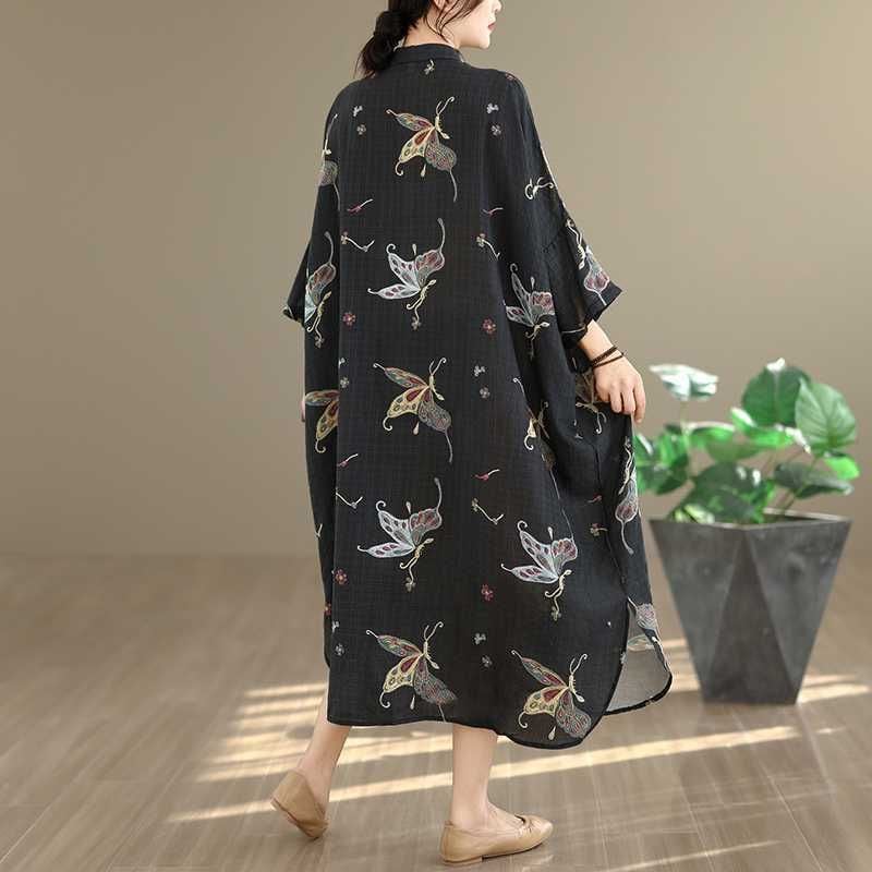 ブラック地にアーティスティックな蝶のプリントが美しい、スタンドカラー・ハーフボタン・7分袖・膝下丈のシャツワンピースです。ゆったりとしたワイド幅の裾はラウンドカットで、サイドがスリットのようなシルエットになっています。着心地が良くリラックスした印象のアイテムです。