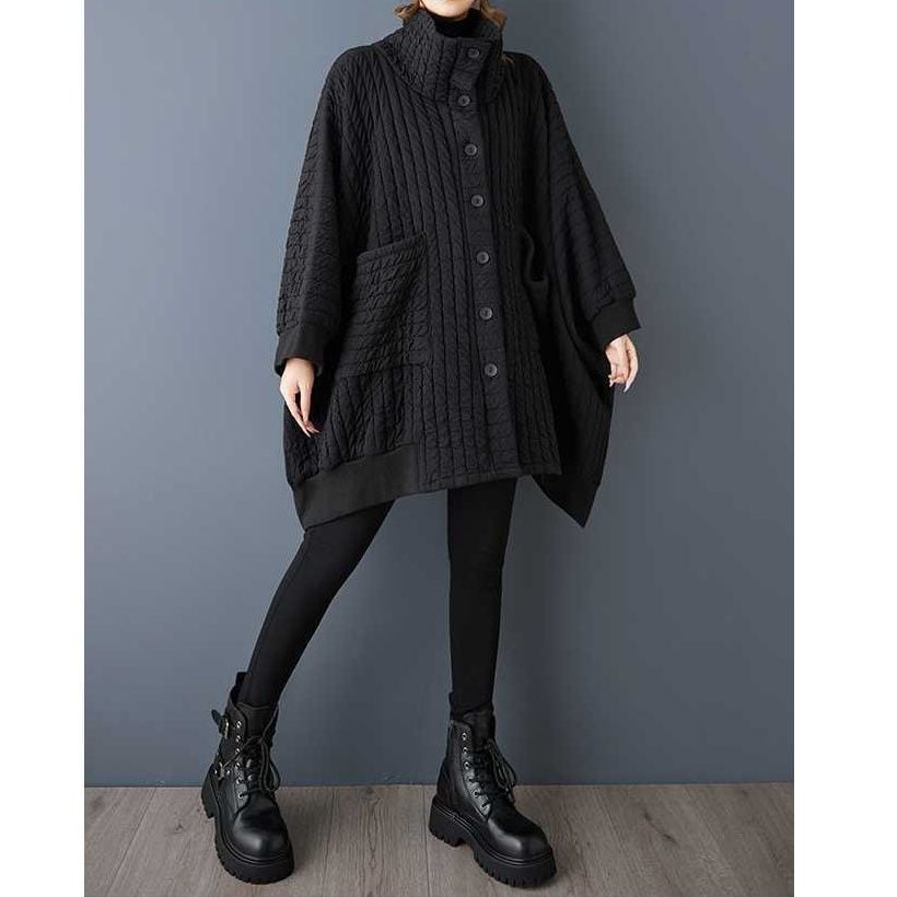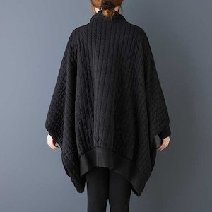 ブラックのキルティング素材がお洒落な、スタンドカラー・長袖・チュニック丈のカーディガンコートです。バットスリーブのゆったりとしたワイド幅で、クールな印象のカジュアルアイテムです。