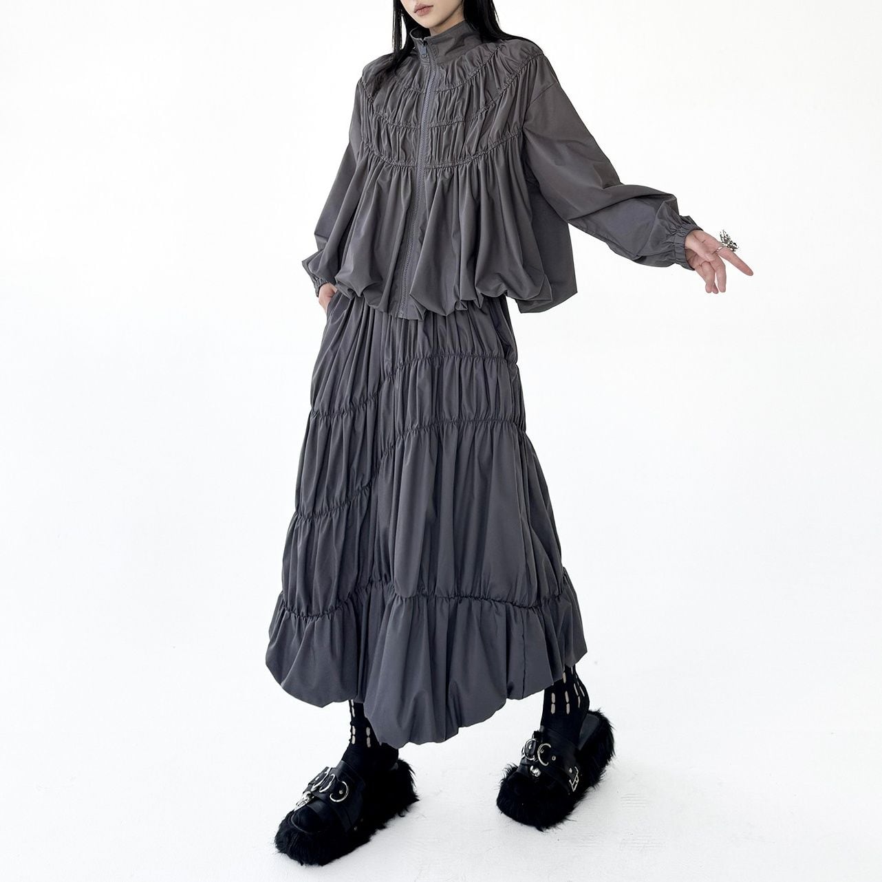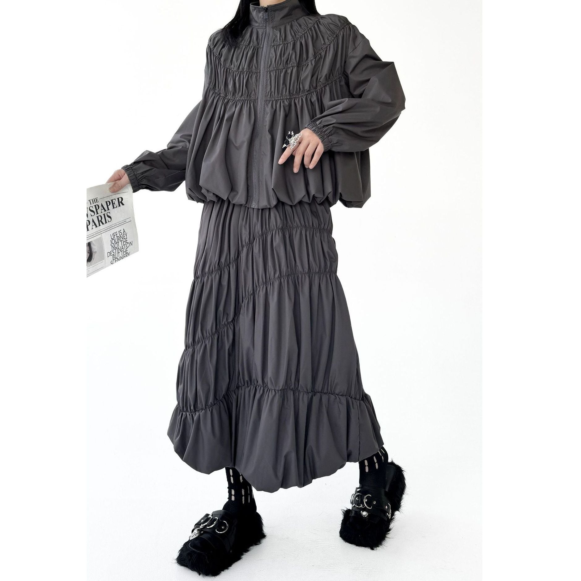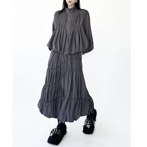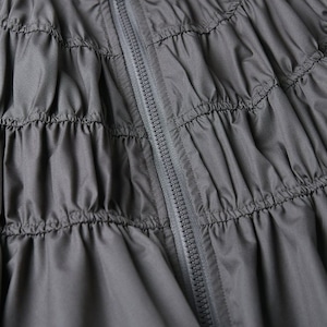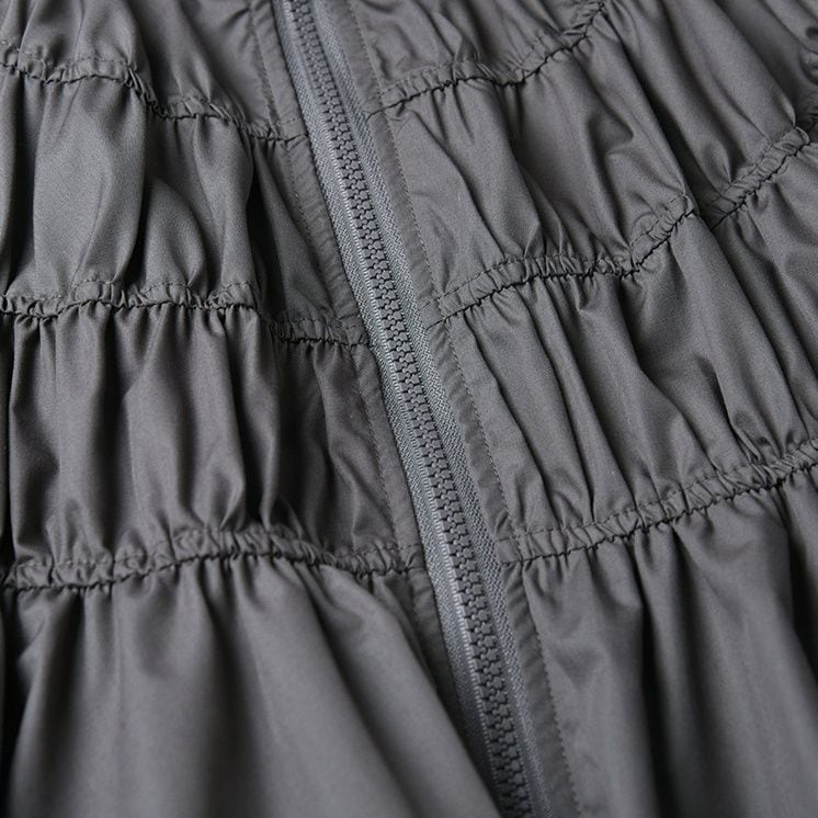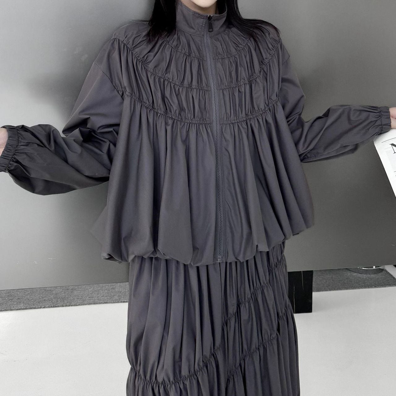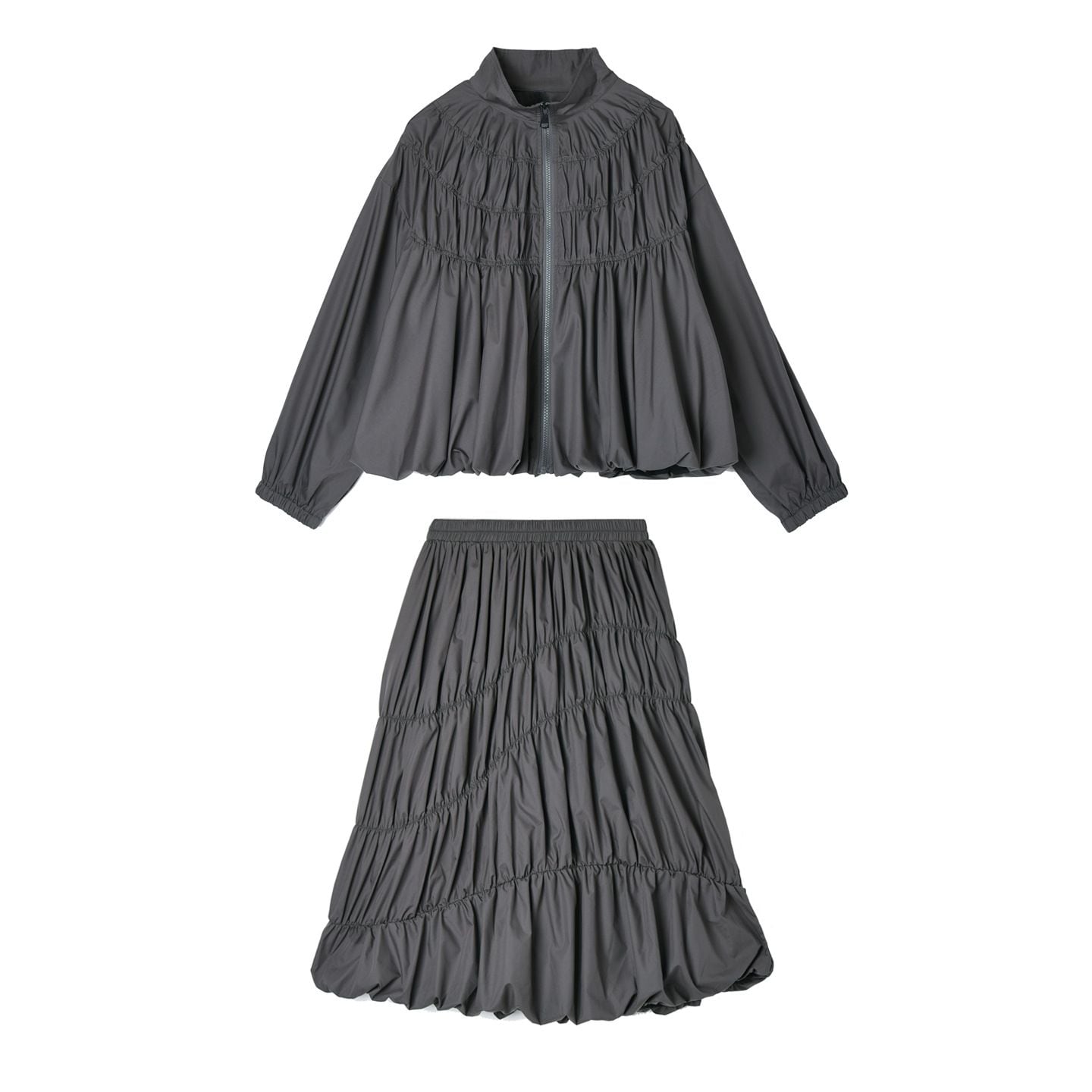 シャーリングのようなシルエットがお洒落な、スタンドカラー・長袖・ランタンヘムのフルジップジャケットと、Aライン・膝下丈のスカートのセットアップです。単色で他アイテムとも合わせやすいです。上下別売りで、それぞれグレーとブラックの2色から選べます。