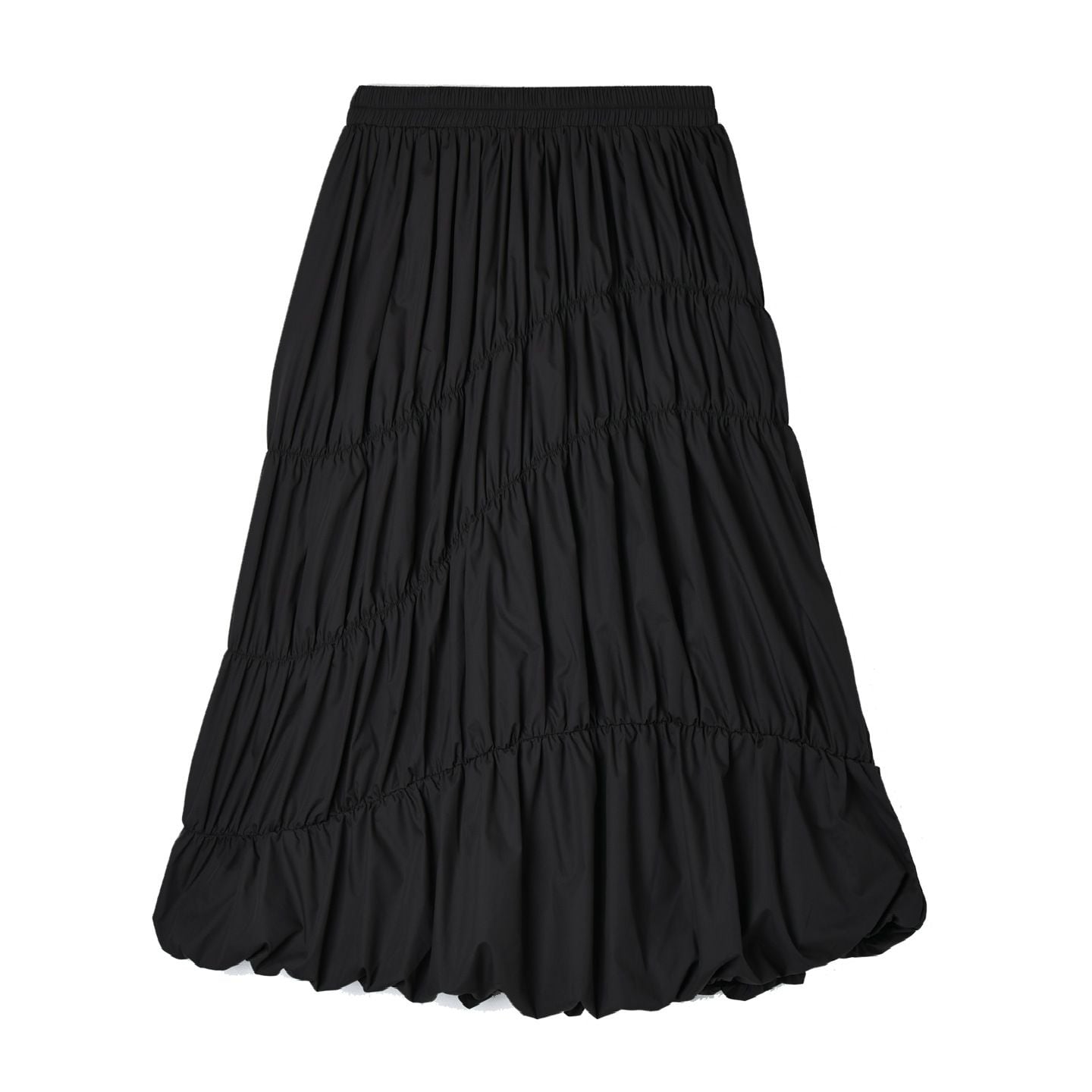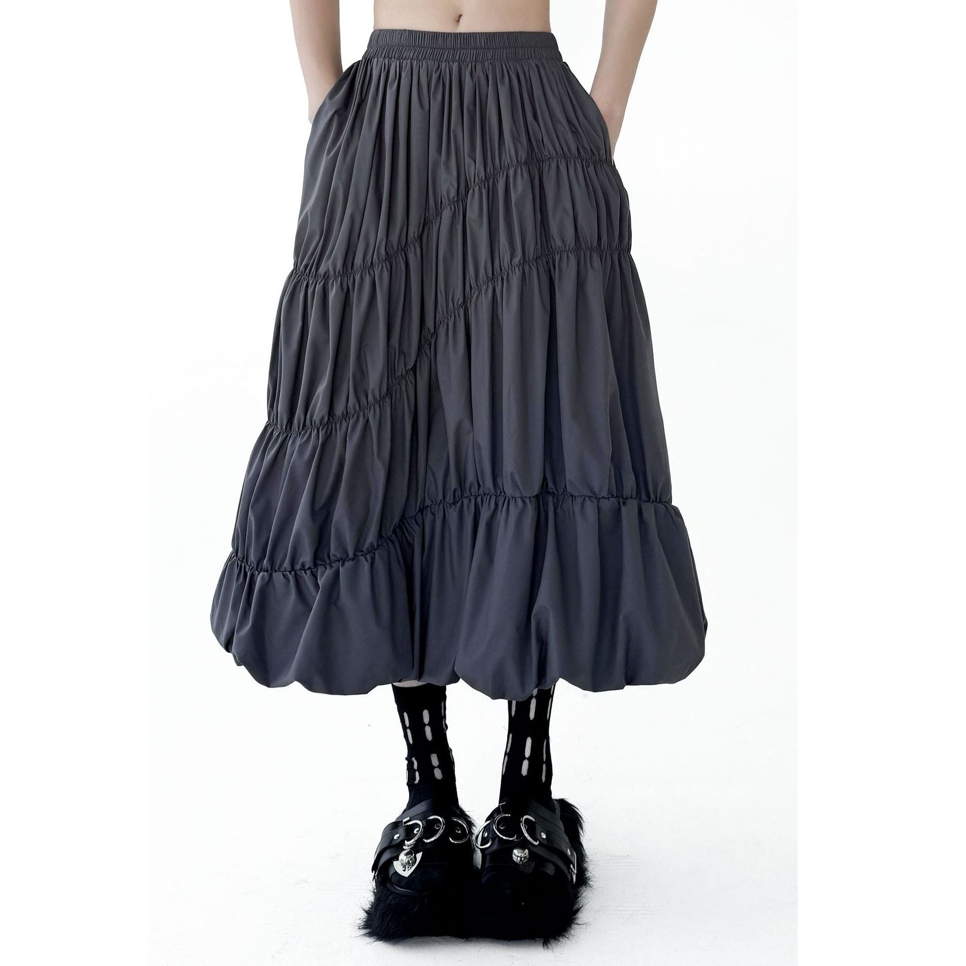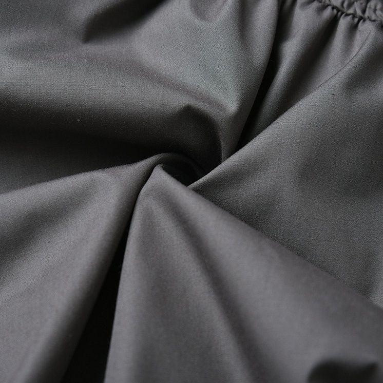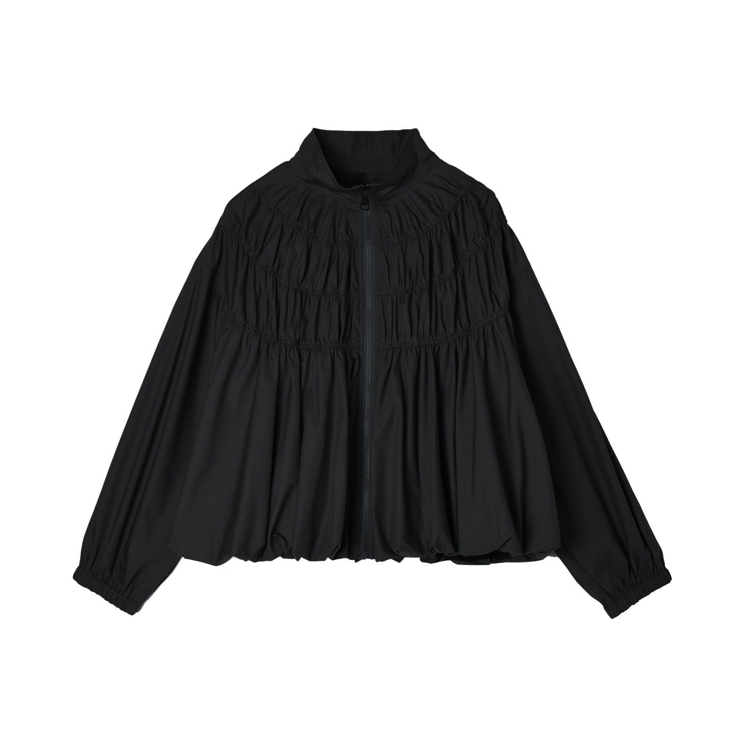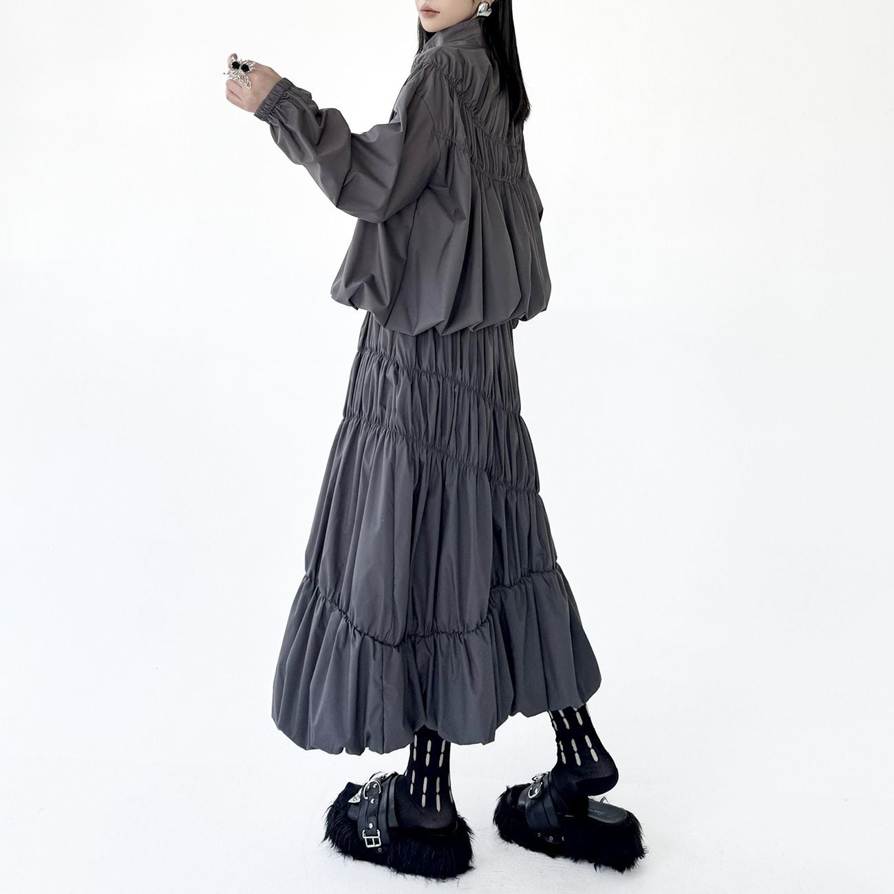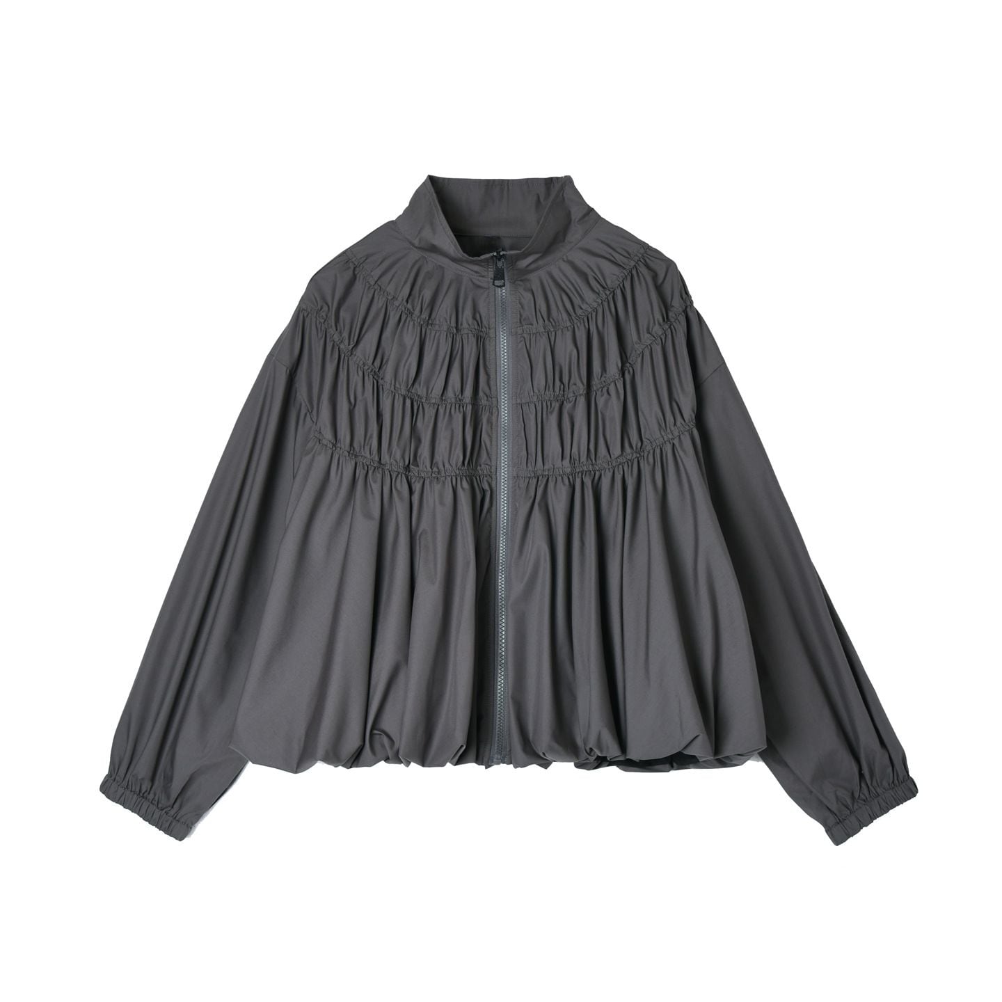 シャーリングのようなシルエットがお洒落な、スタンドカラー・長袖・ランタンヘムのフルジップジャケットと、Aライン・膝下丈のスカートのセットアップです。単色で他アイテムとも合わせやすいです。上下別売りで、それぞれグレーとブラックの2色から選べます。