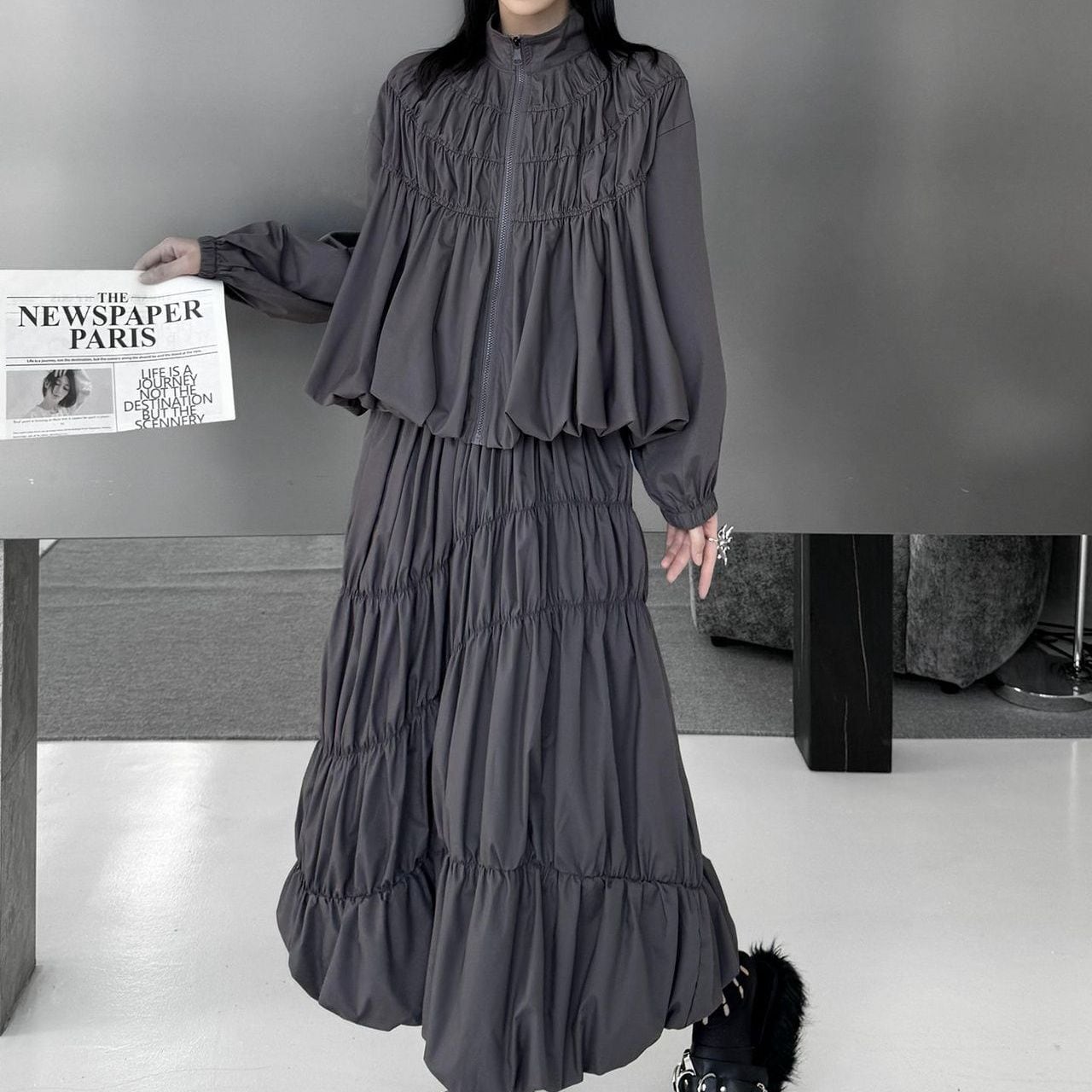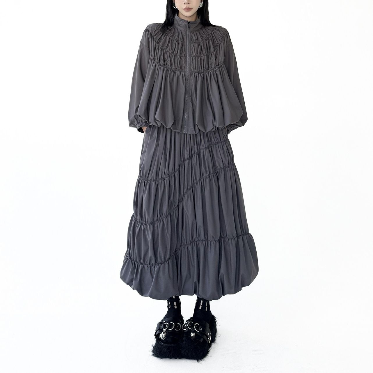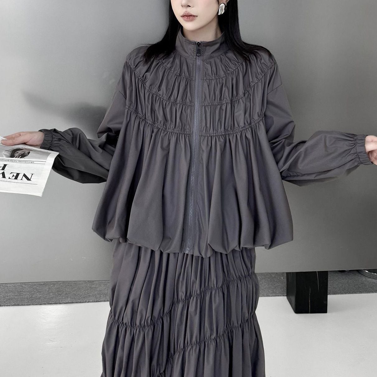 SOLID PLEATS LANTERN FULLZIP JACKET & MIDI SKIRT 2colors M-16075