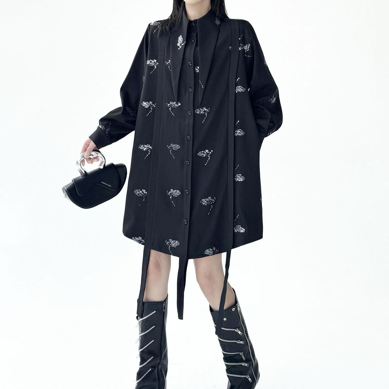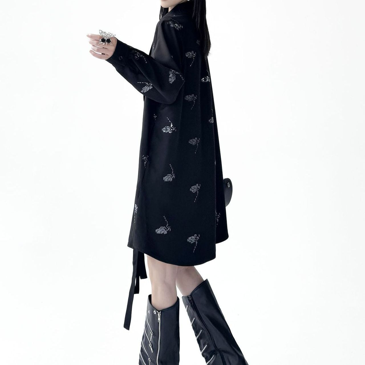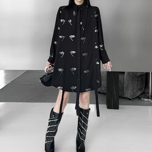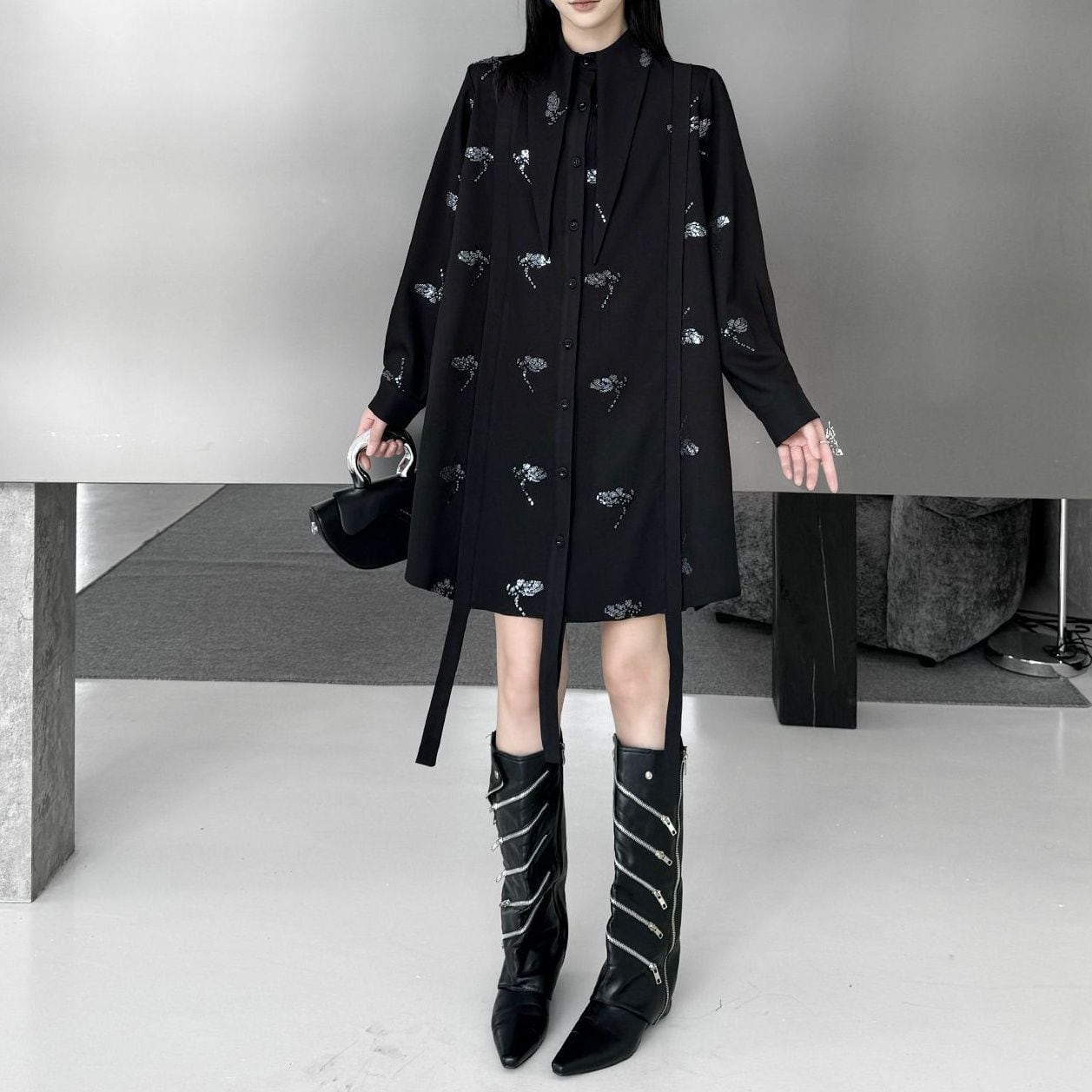 ブラック地にスパンコールのバタフライ柄が目を惹く、ロングポインテッドカラー・長袖・ミニ丈のシャツワンピースです。ボタンラインと両肩からのラインストラップが裾より長く垂れたデザインが特徴的な、ゆったりとしたシルエットのアイテムです。