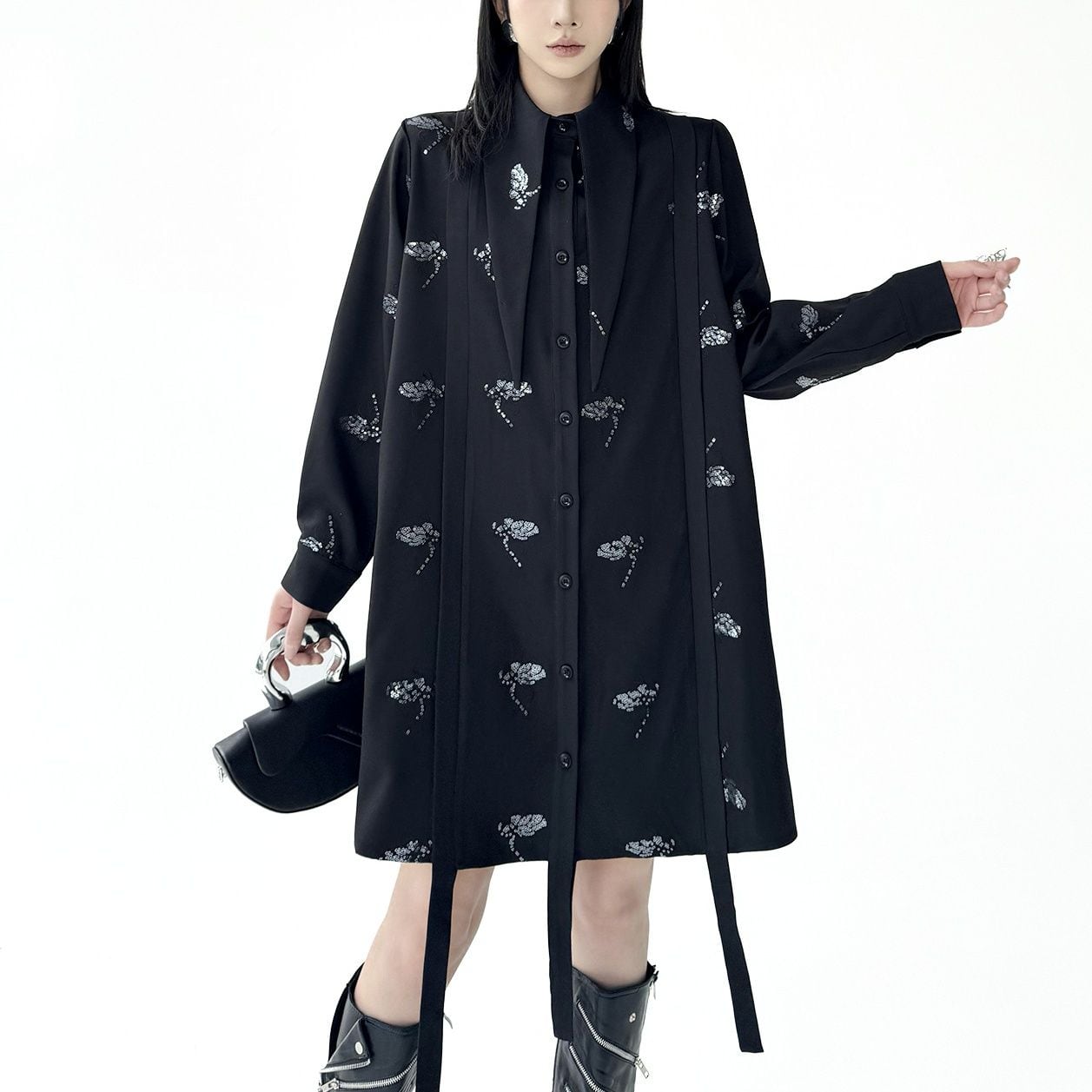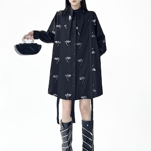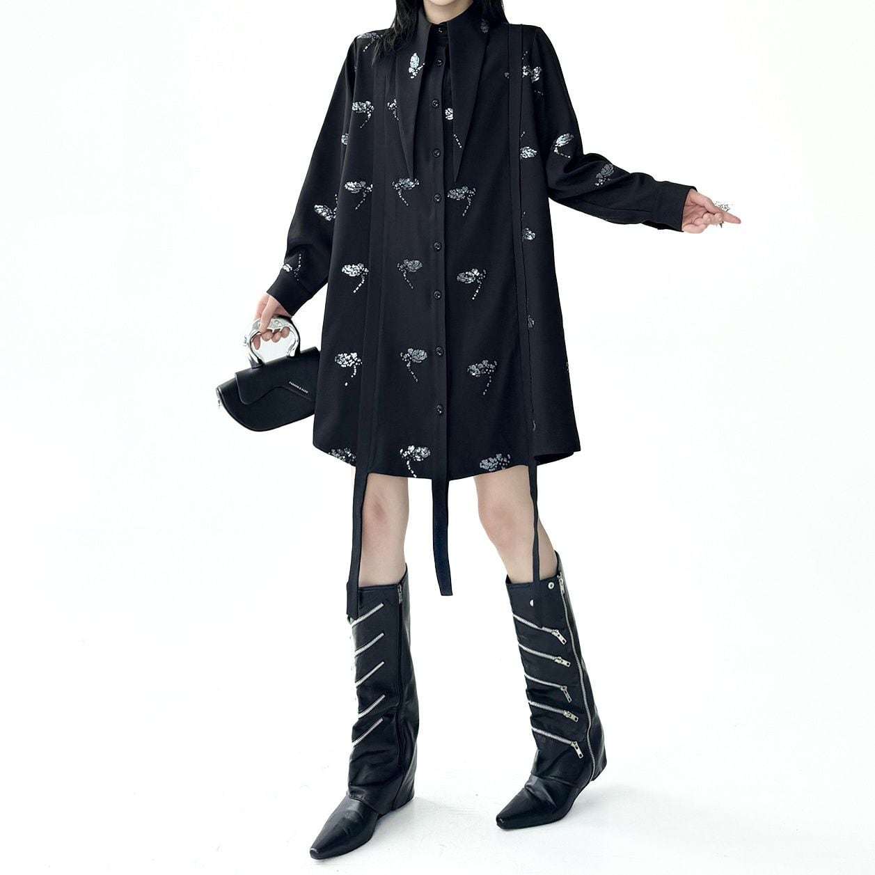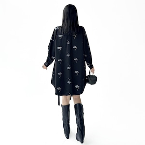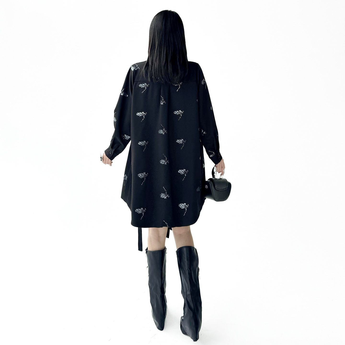 ブラック地にスパンコールのバタフライ柄が目を惹く、ロングポインテッドカラー・長袖・ミニ丈のシャツワンピースです。ボタンラインと両肩からのラインストラップが裾より長く垂れたデザインが特徴的な、ゆったりとしたシルエットのアイテムです。