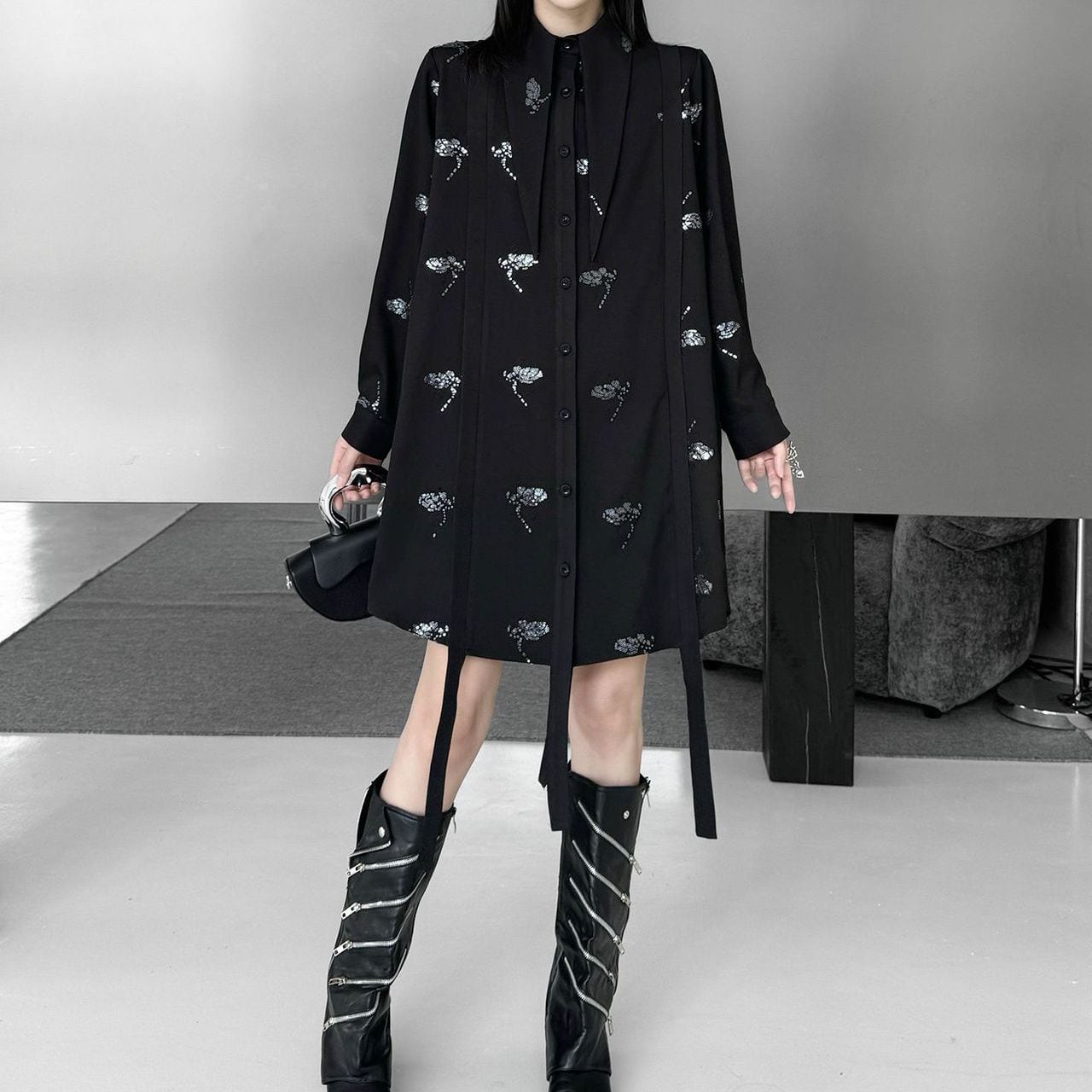 BLACK SEQUINS TRIMMED LONGPOINTED COLLAR MINI SHIRT DRESS 1color M-16077