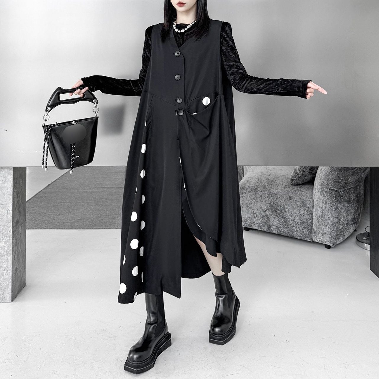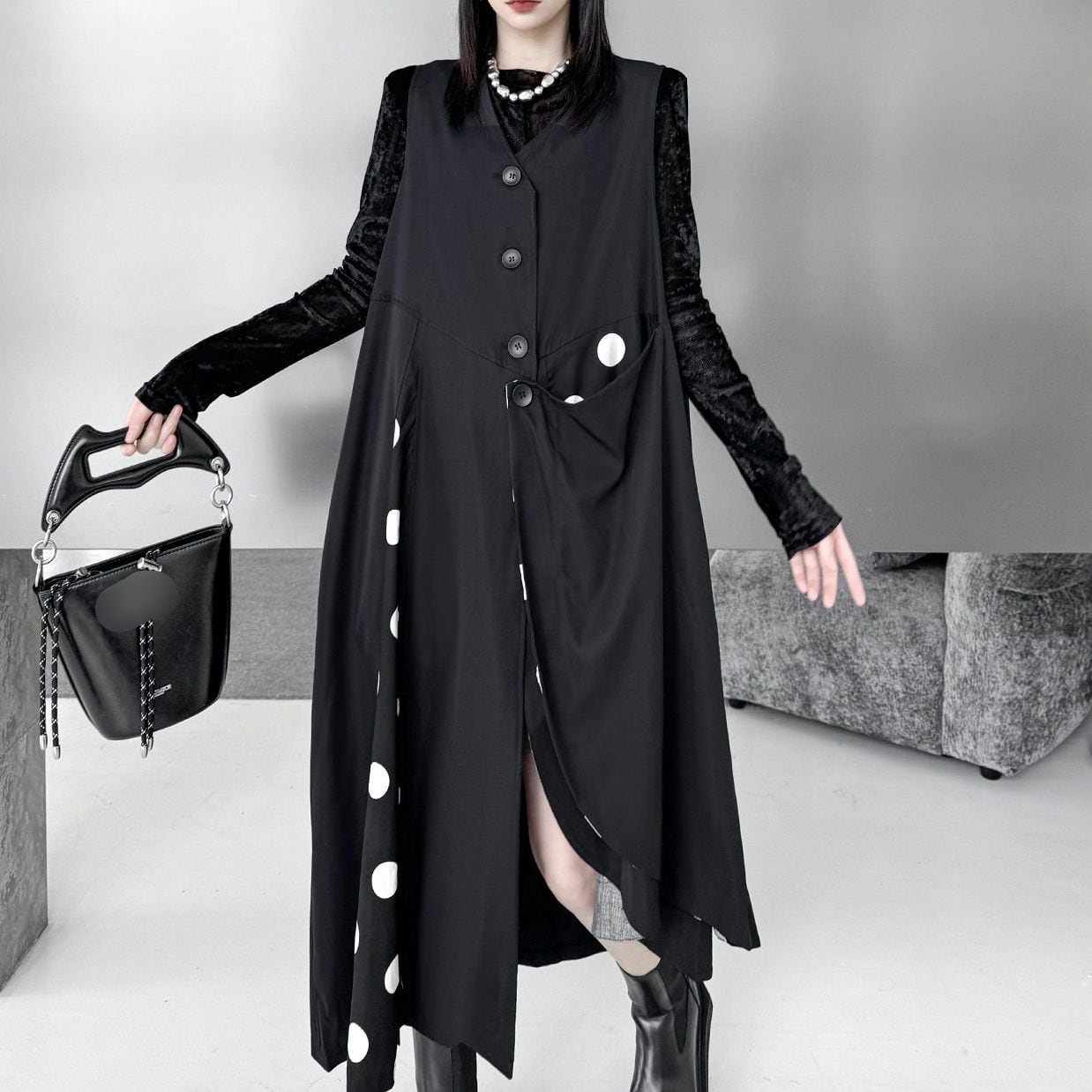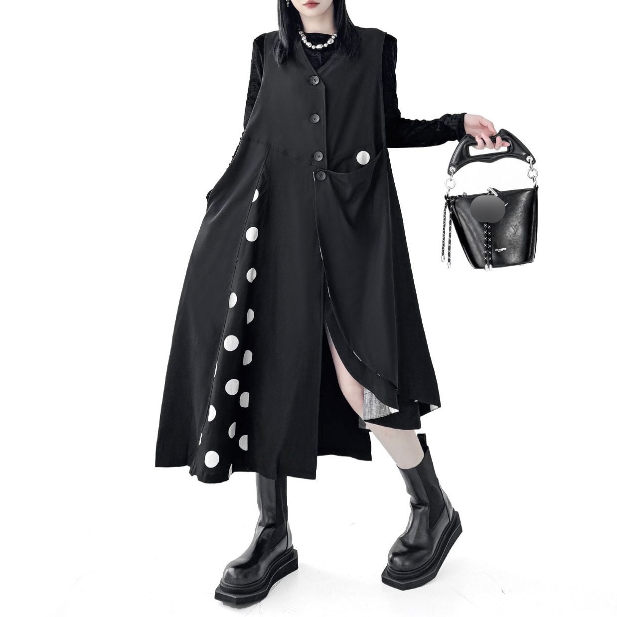 BLACK DOT STITCH V-NECK ASYMMETRIC VEST DRESS 1color M-16083
