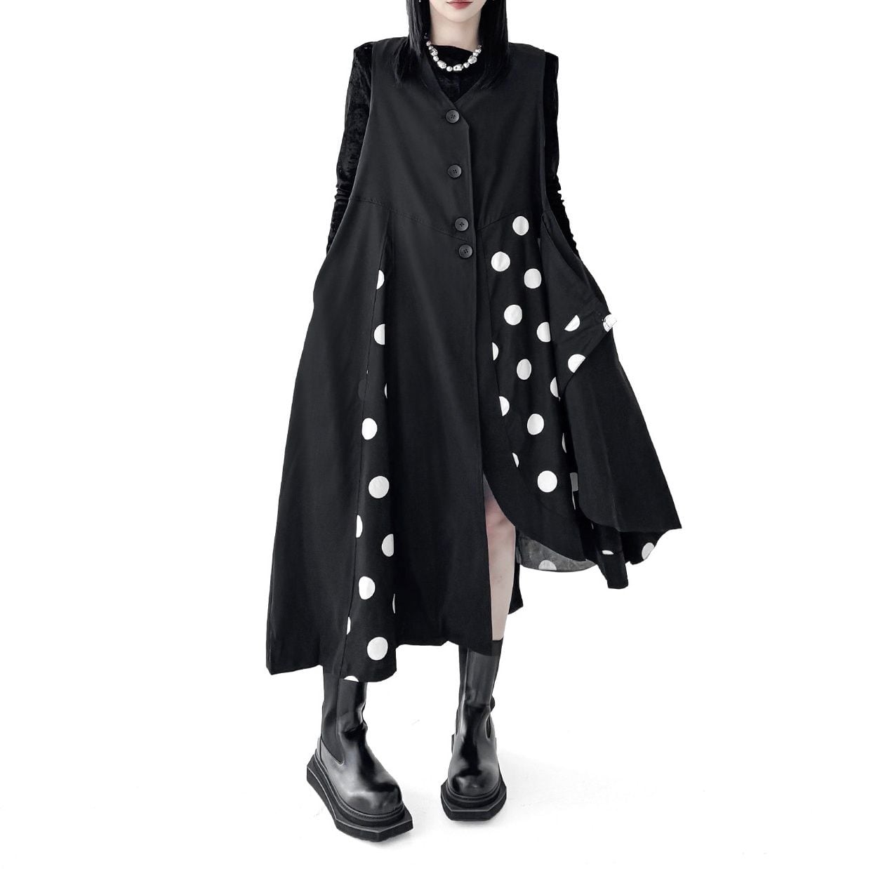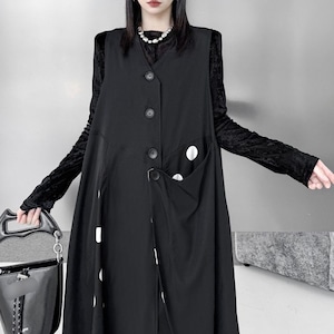 ドット柄のスティッチやアシンメトックなシルエットが目を惹く、襟なしⅤネック・ノースリーブ・ミドル丈のジャンパースカートです。ショートパンツやミニスカートと合わせて、羽織りものとしても活躍するアイテムです。