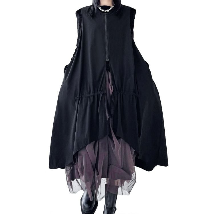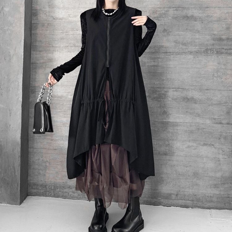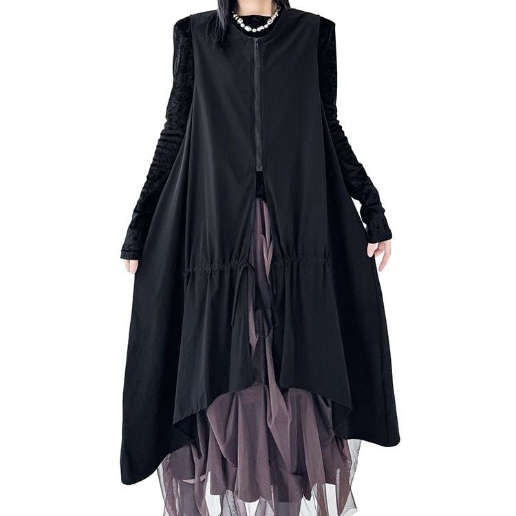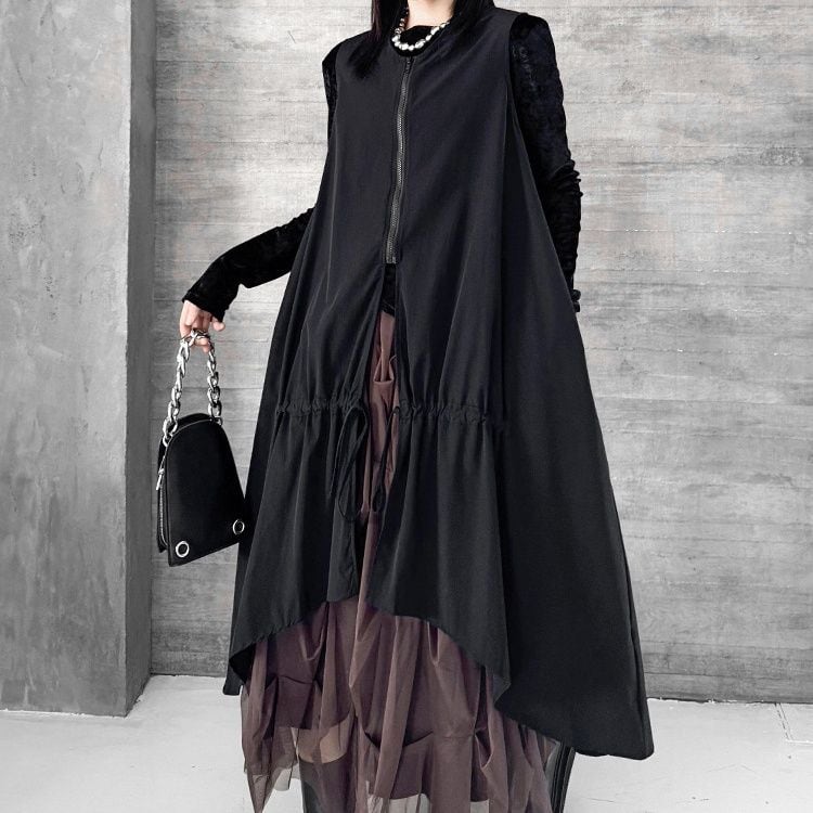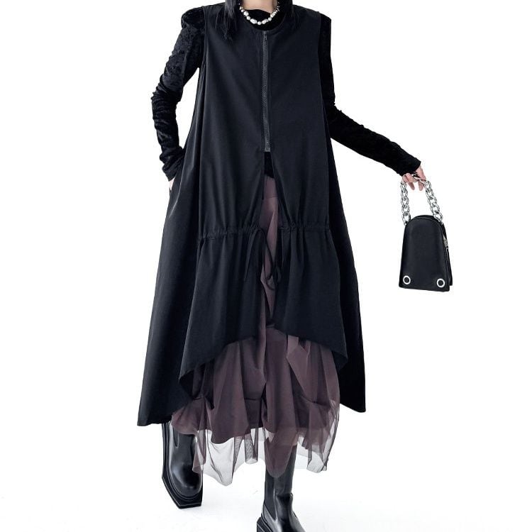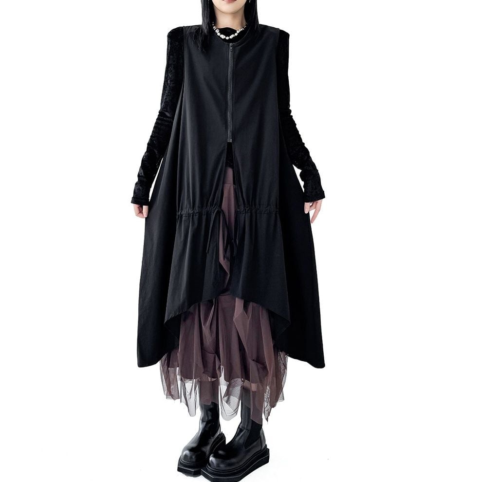 BLACK SPLIT DESIGN A-LINE MIDI ZIP VEST JACKET 1color M-16084