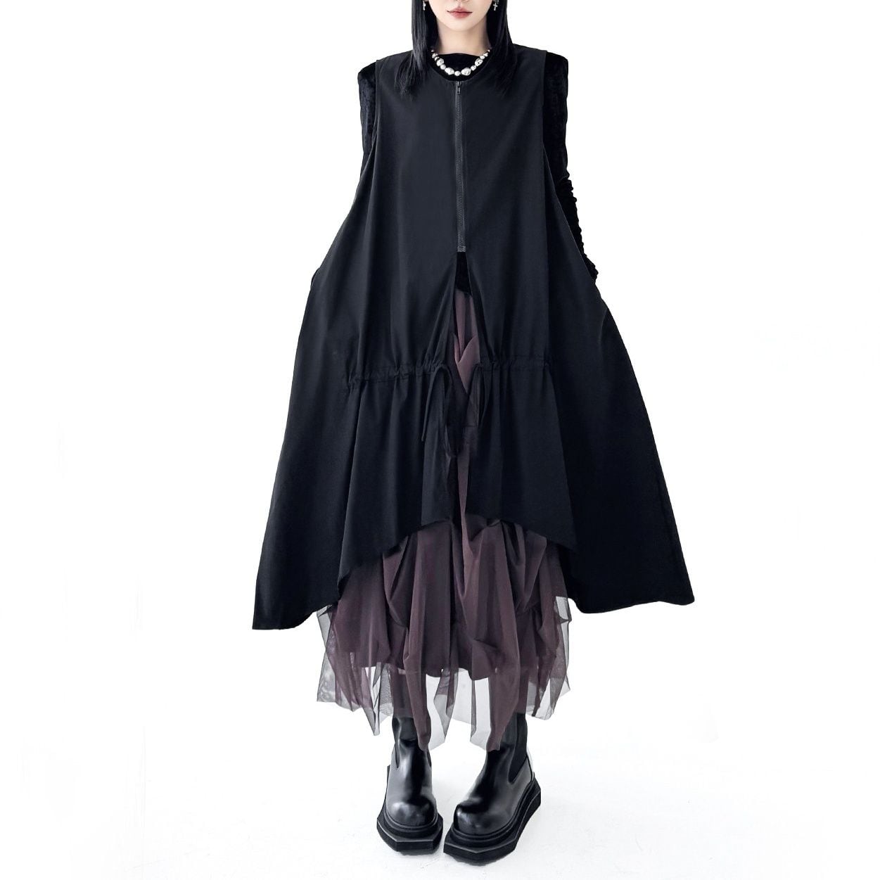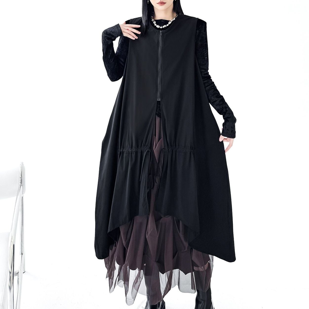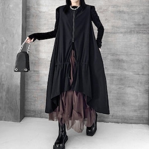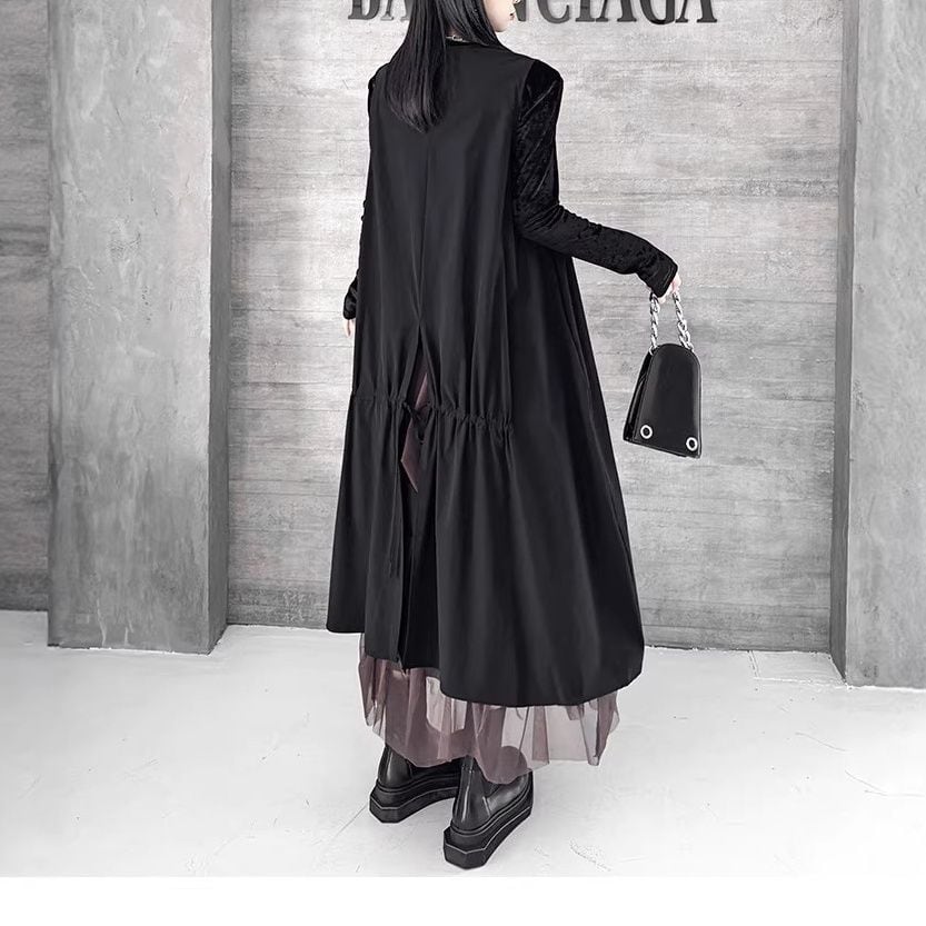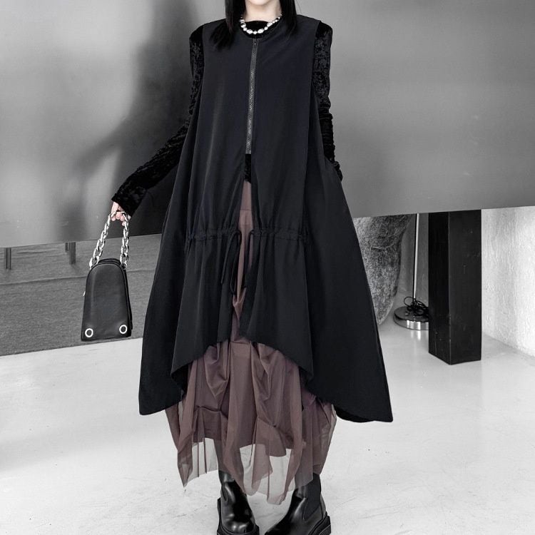 BLACK SPLIT DESIGN A-LINE MIDI ZIP VEST JACKET 1color M-16084