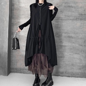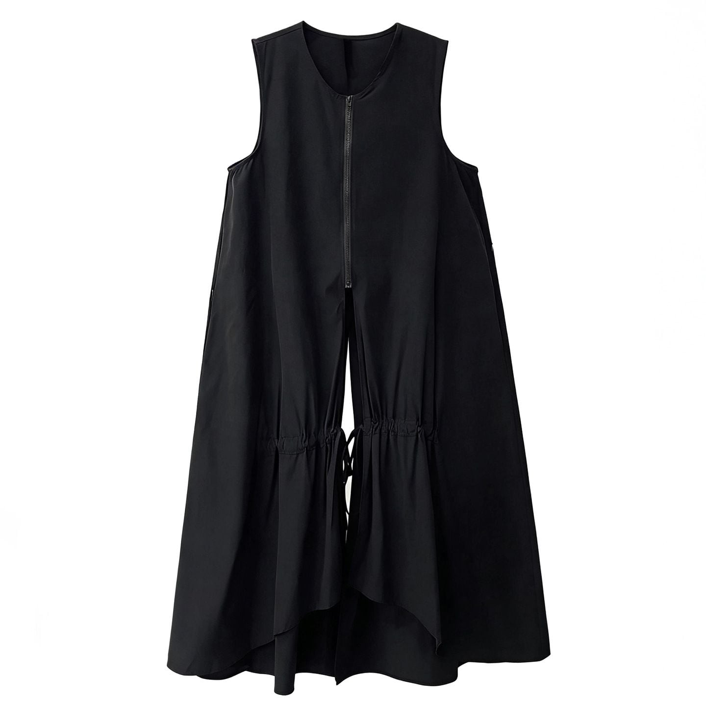 前後の深いスリットやセンターが短い裾のラインが特徴的な、ラウンドネックのベストジャケットです。ゆったりとしたAラインで、足の付け根あたりに施されたドローストリングでシルエットを調節できます。ブラックの単色で合わせやすい、コーディネートのアクセントになるアイテムです。