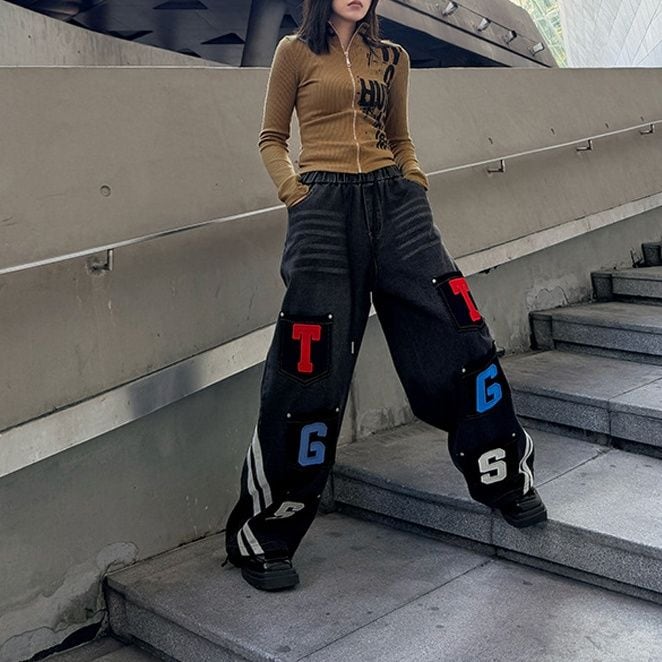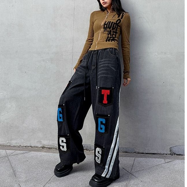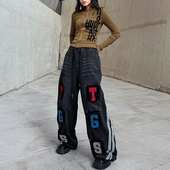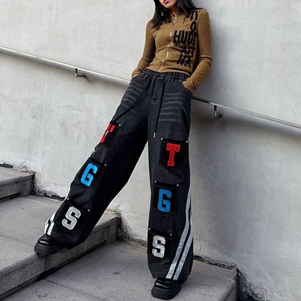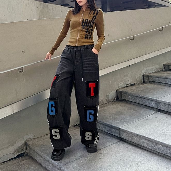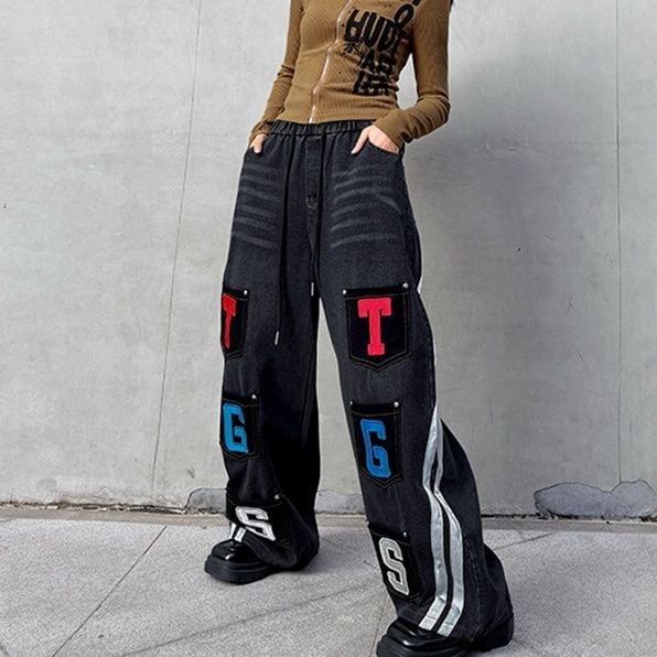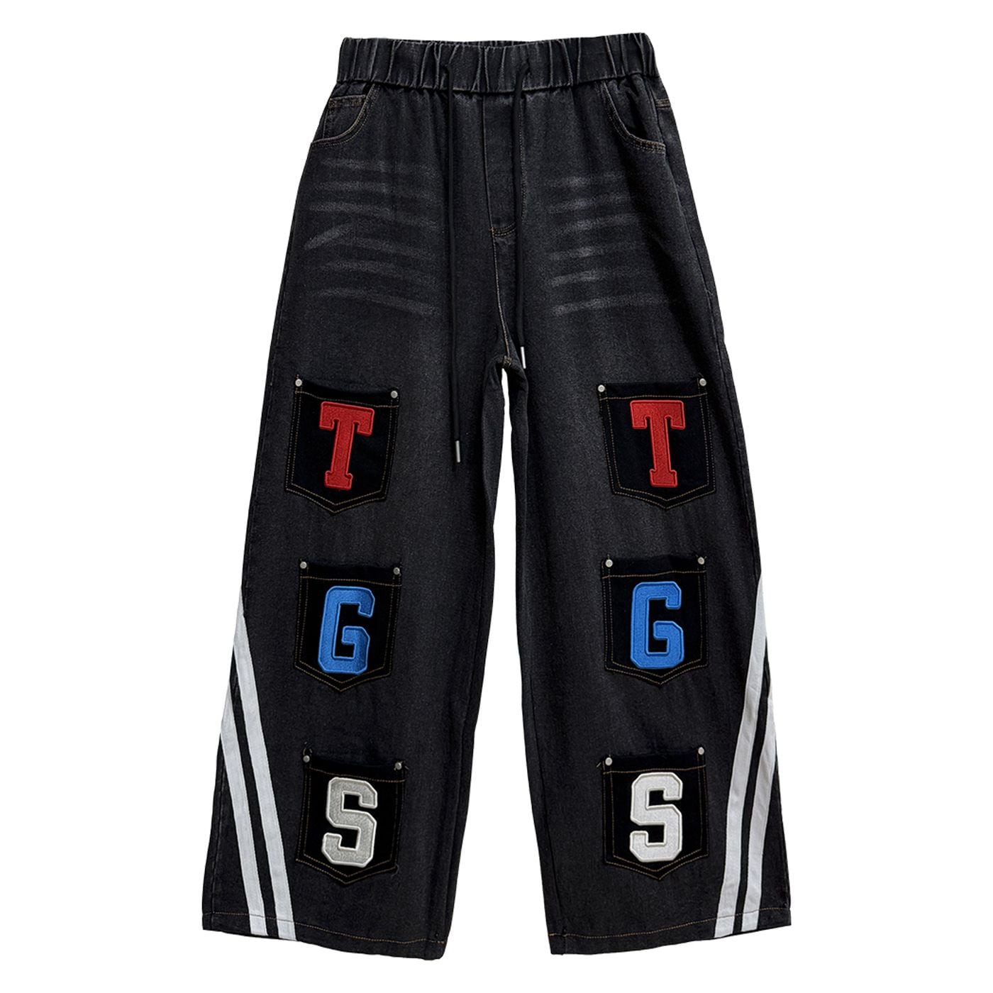 カラーの異なる英字パッチを施したデザインポケットが目を惹く、ワイドレッグ・デニムパンツです。ウエストはゴムなので、着脱が簡単で履き心地が良いです。サイドのダブルラインや裾のドローコードが、スポーティでリラックスした印象のアイテムです。