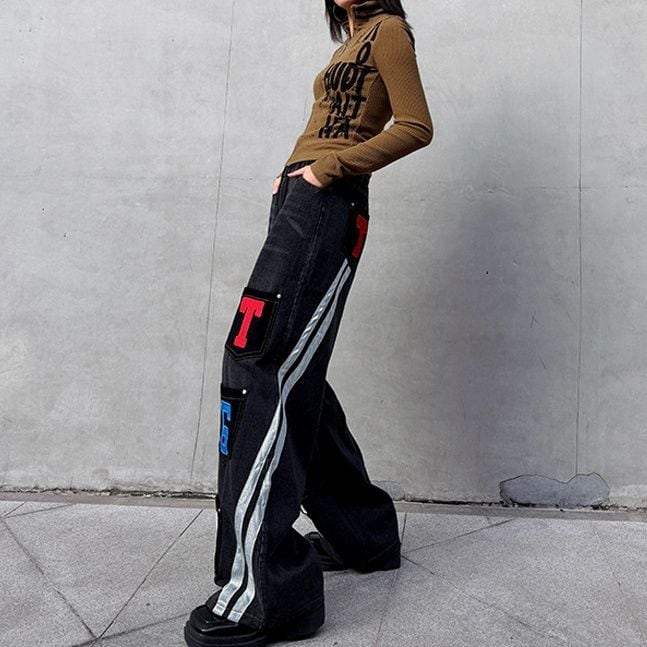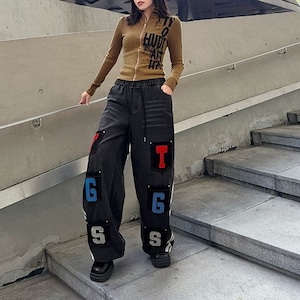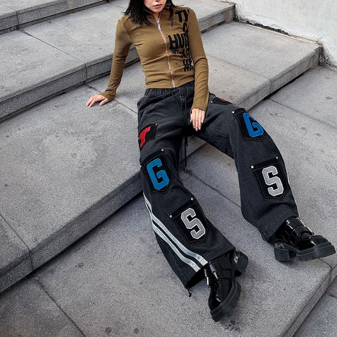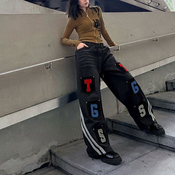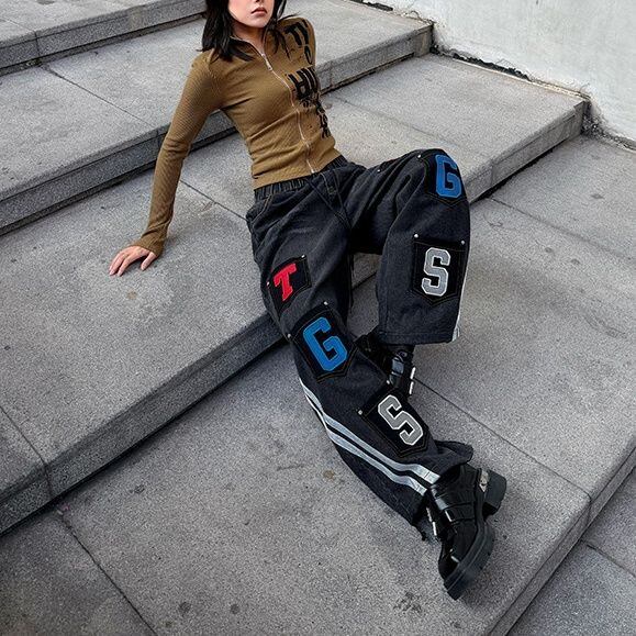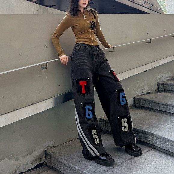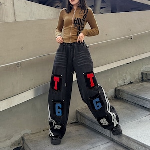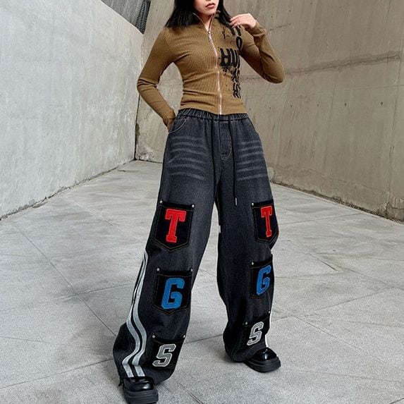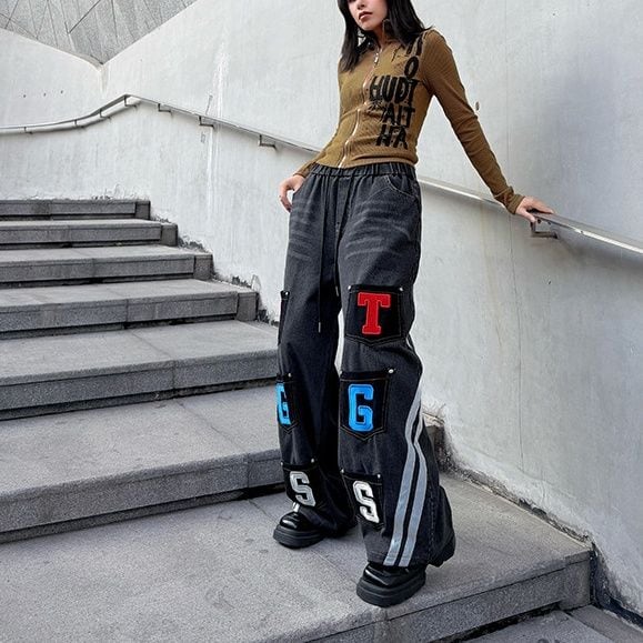 カラーの異なる英字パッチを施したデザインポケットが目を惹く、ワイドレッグ・デニムパンツです。ウエストはゴムなので、着脱が簡単で履き心地が良いです。サイドのダブルラインや裾のドローコードが、スポーティでリラックスした印象のアイテムです。