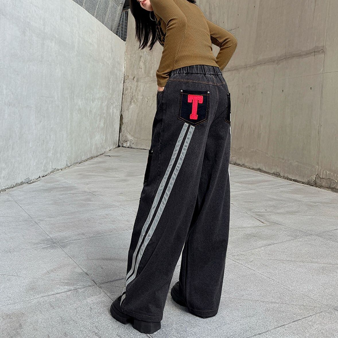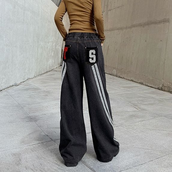 ELASTIC WAIST PATCH POCKET SIDE LINE WIDE LEG DENIM PANTS 1color M-16086