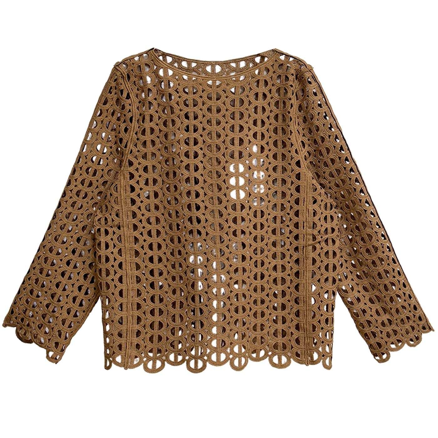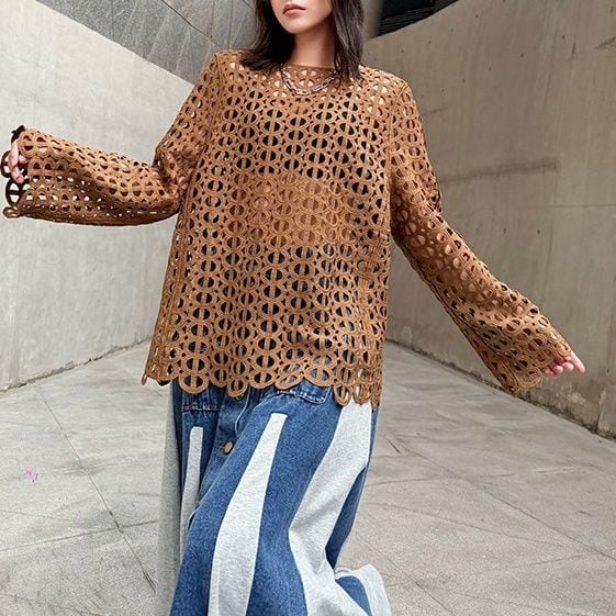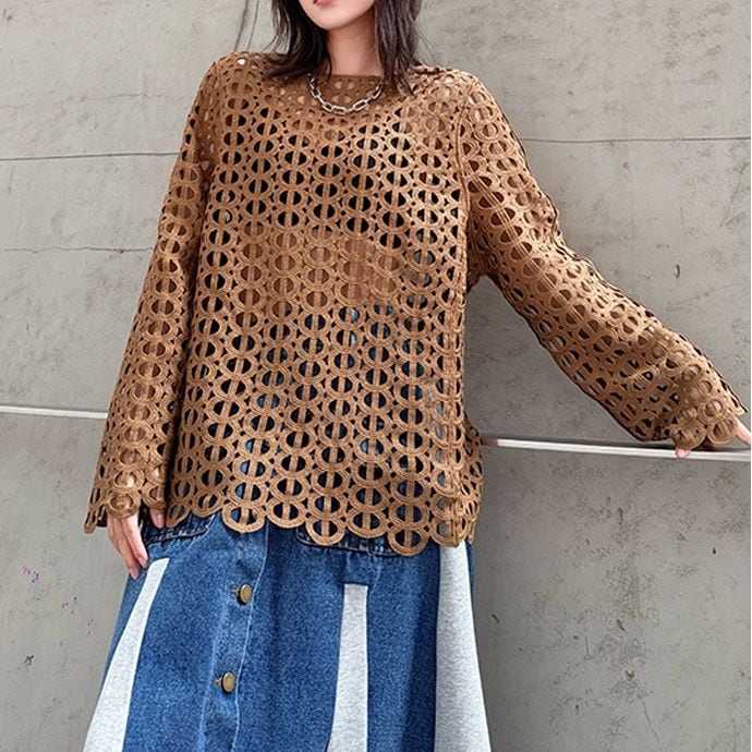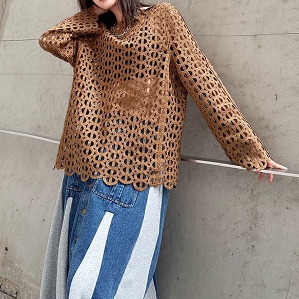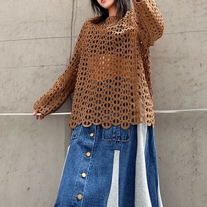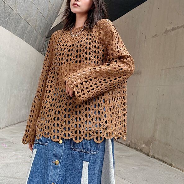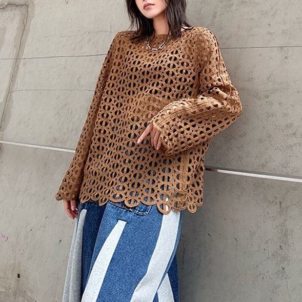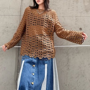ジオメトリック柄のデザインメッシュがお洒落な、スリットネック・長袖のプルオーバートップです。インナーとのアレンジが楽しい、コーディネートのアクセントになるアイテムです。色はブラックとブラウンの2色から選べます。