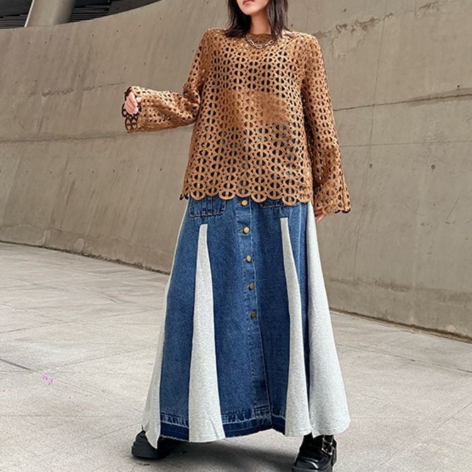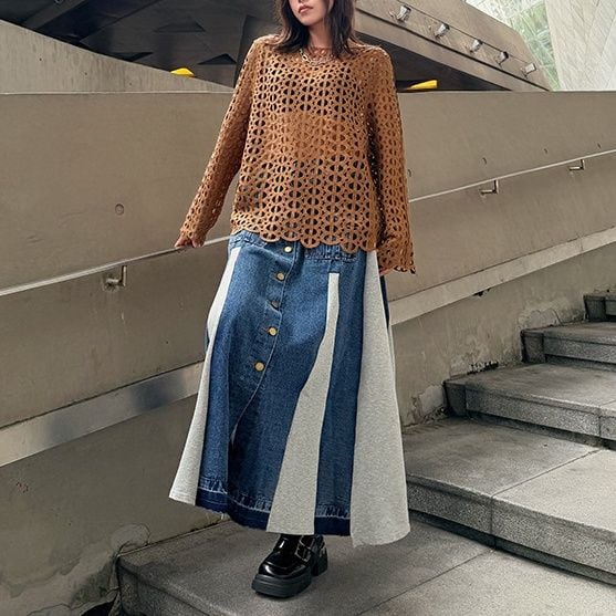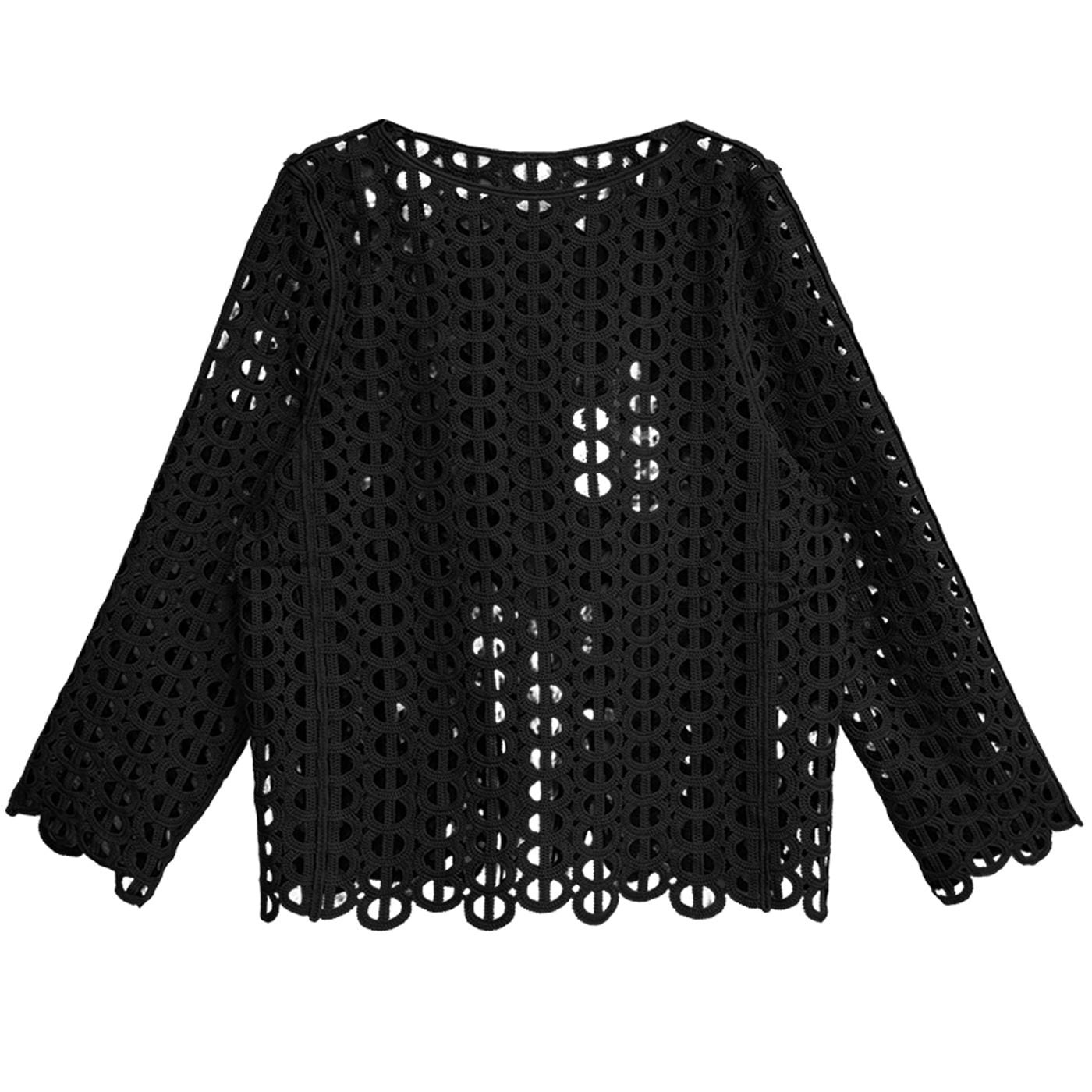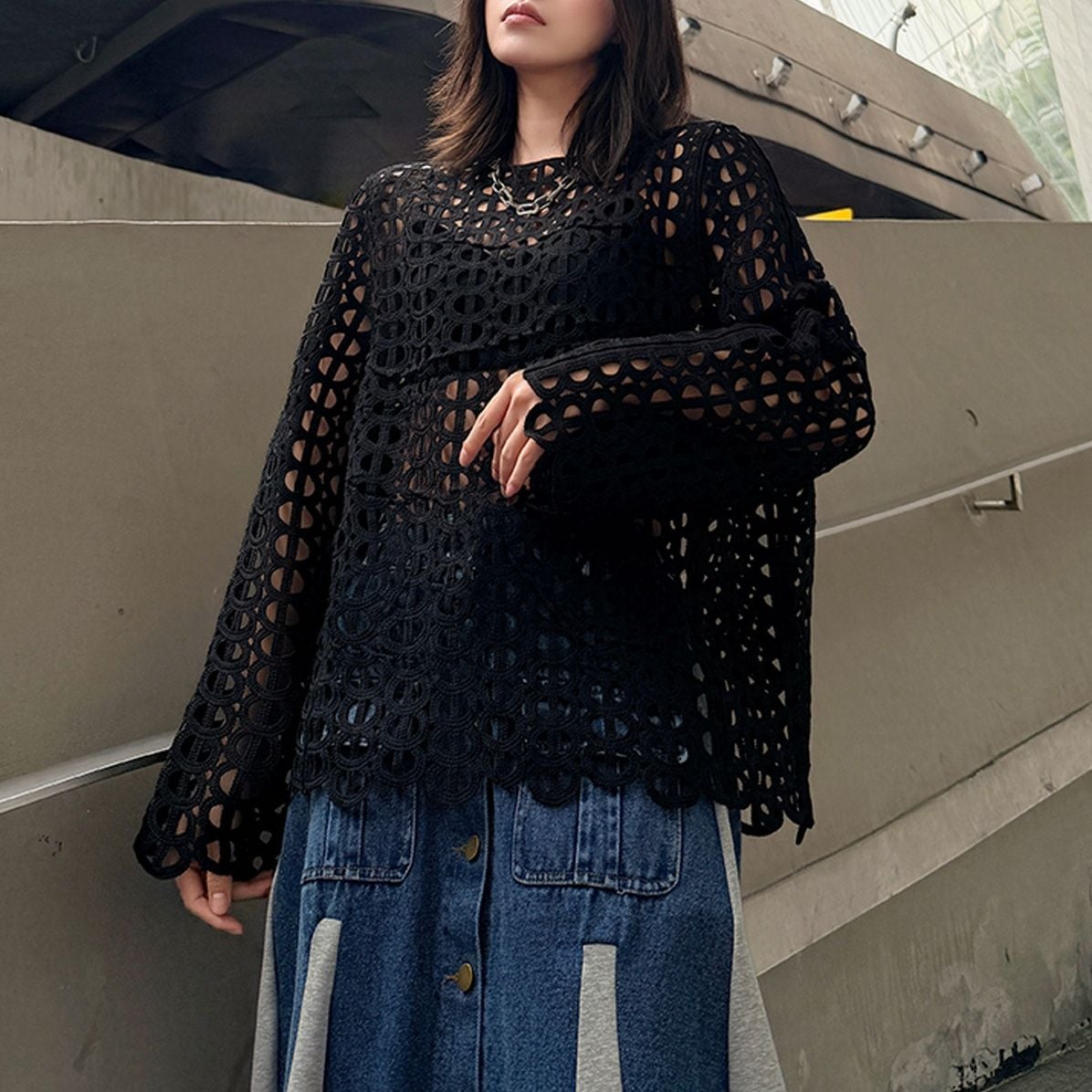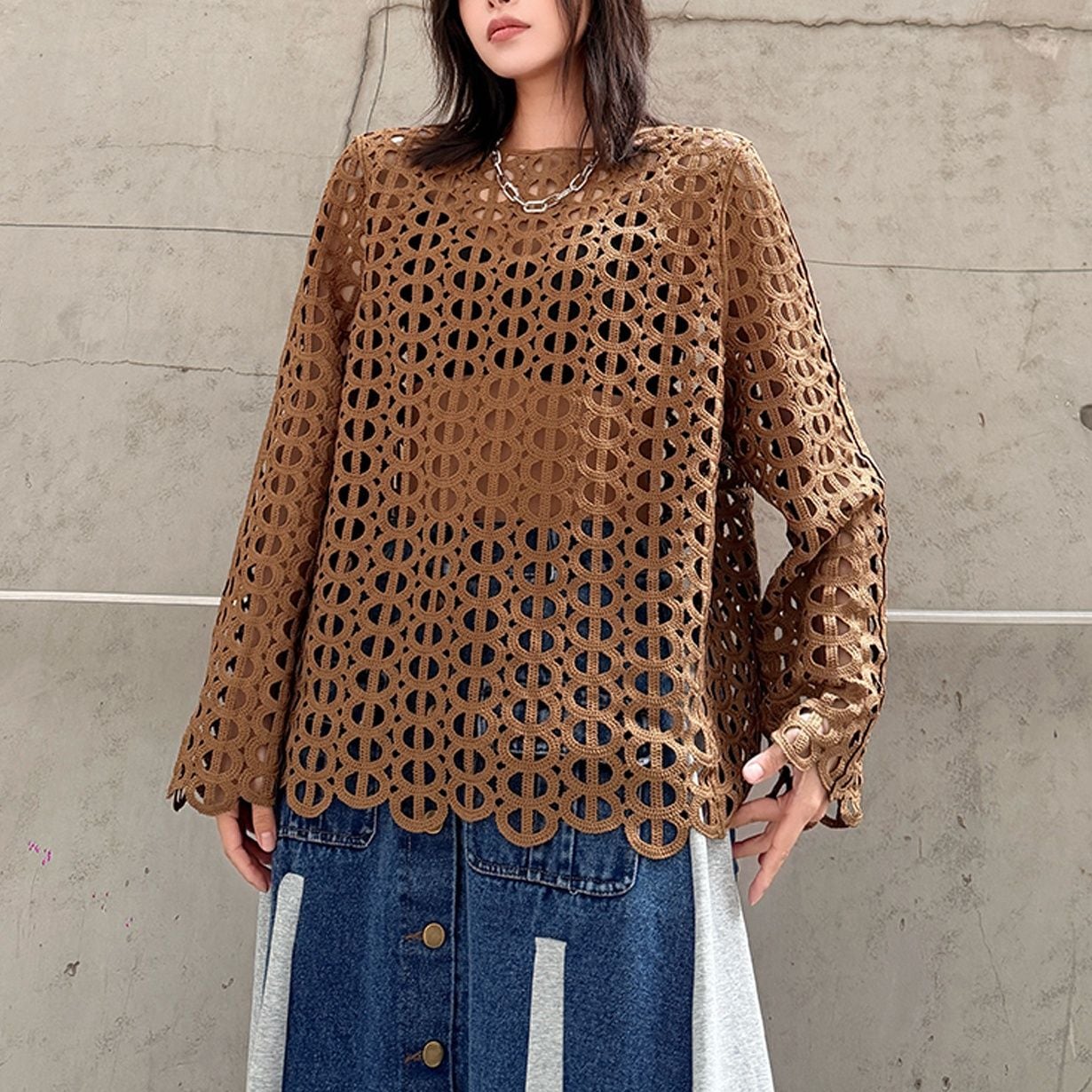 ジオメトリック柄のデザインメッシュがお洒落な、スリットネック・長袖のプルオーバートップです。インナーとのアレンジが楽しい、コーディネートのアクセントになるアイテムです。色はブラックとブラウンの2色から選べます。