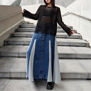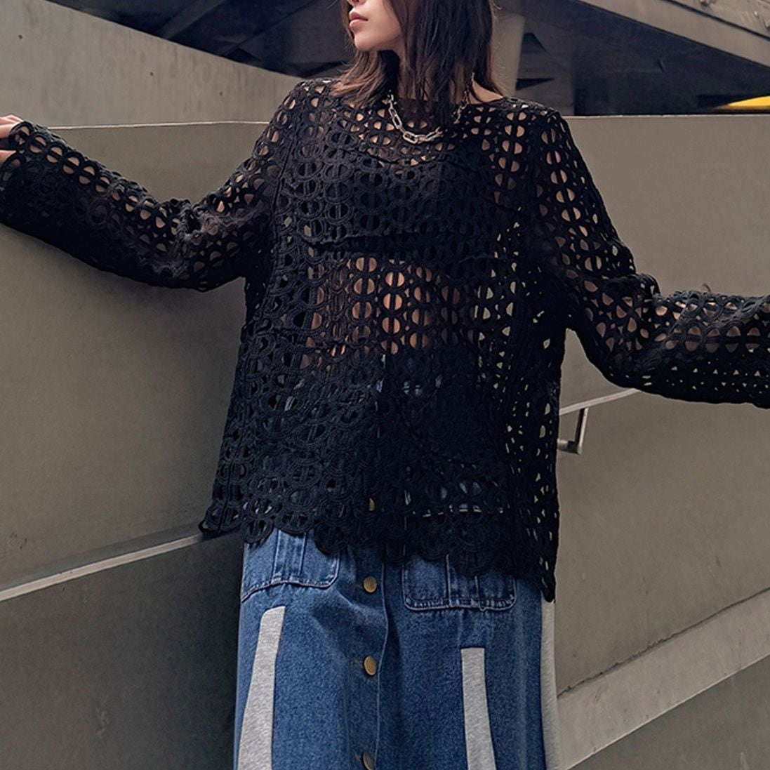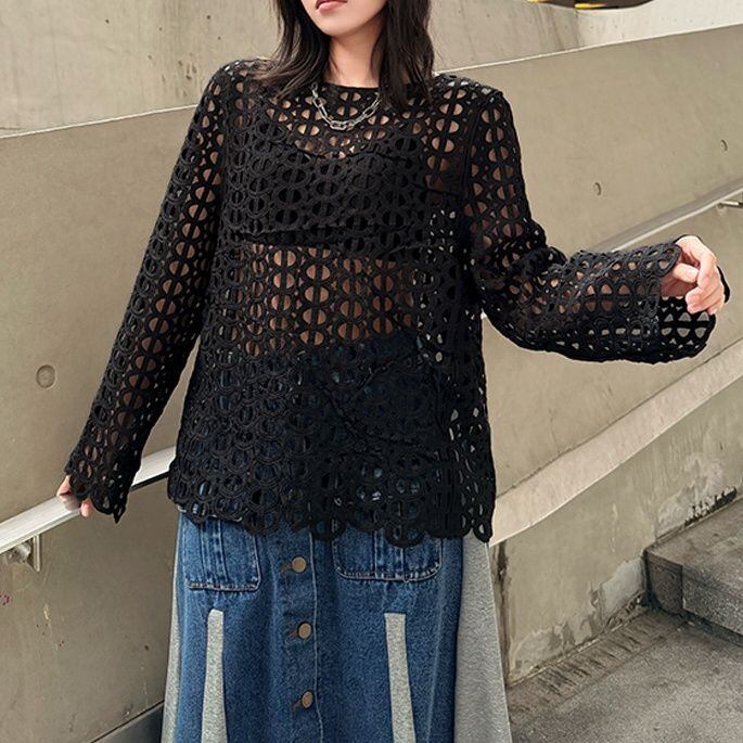 SOLID DESIGN MESH LONG SLEEVES PULLOVER TOP 2colors M-16094