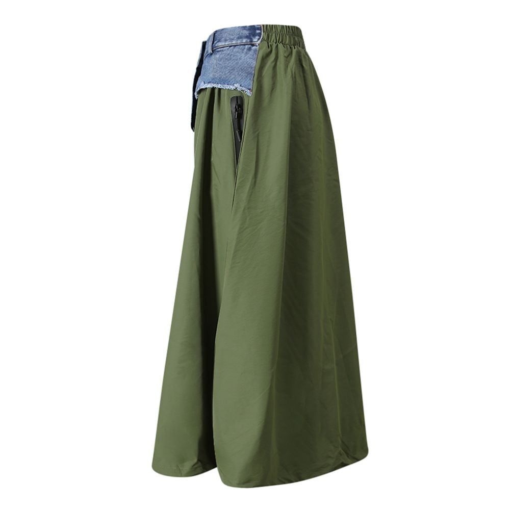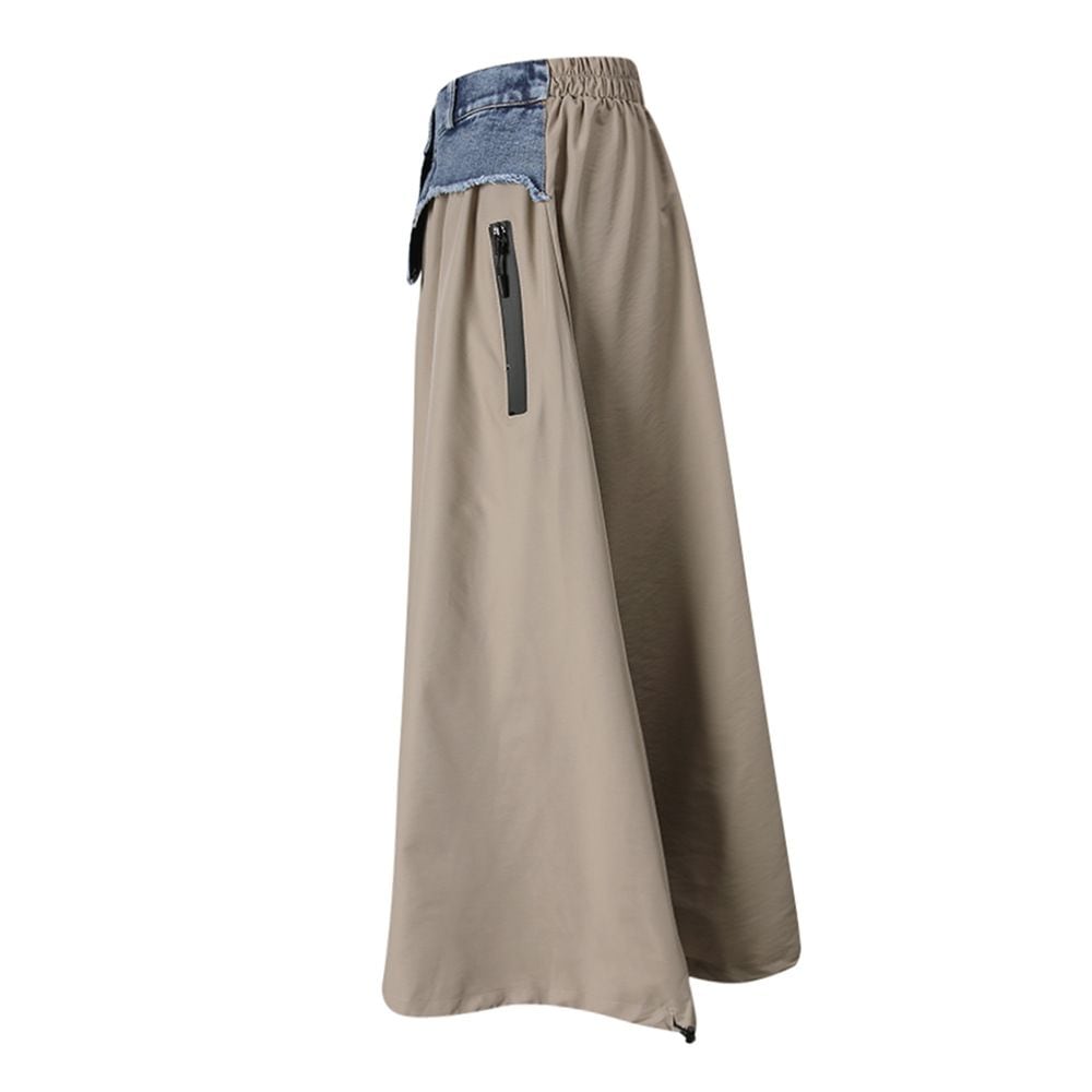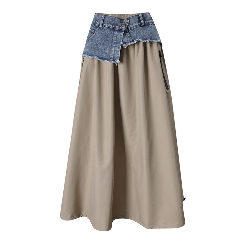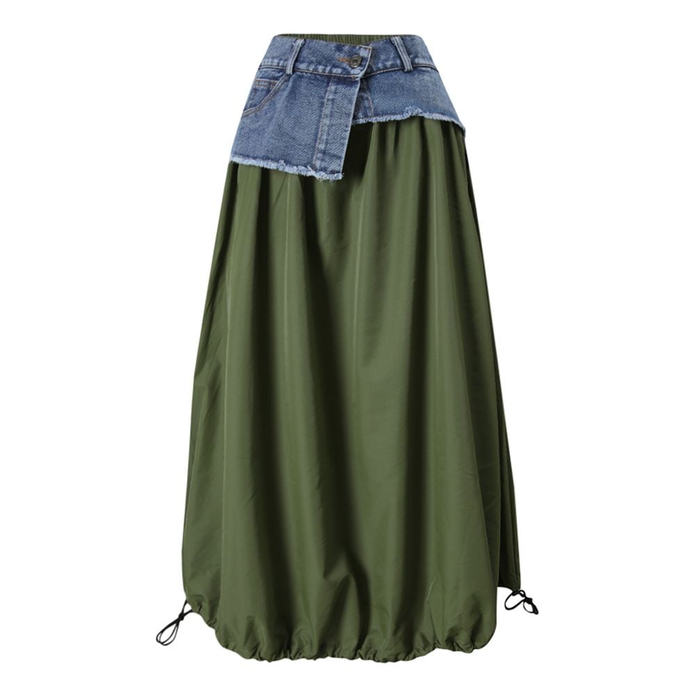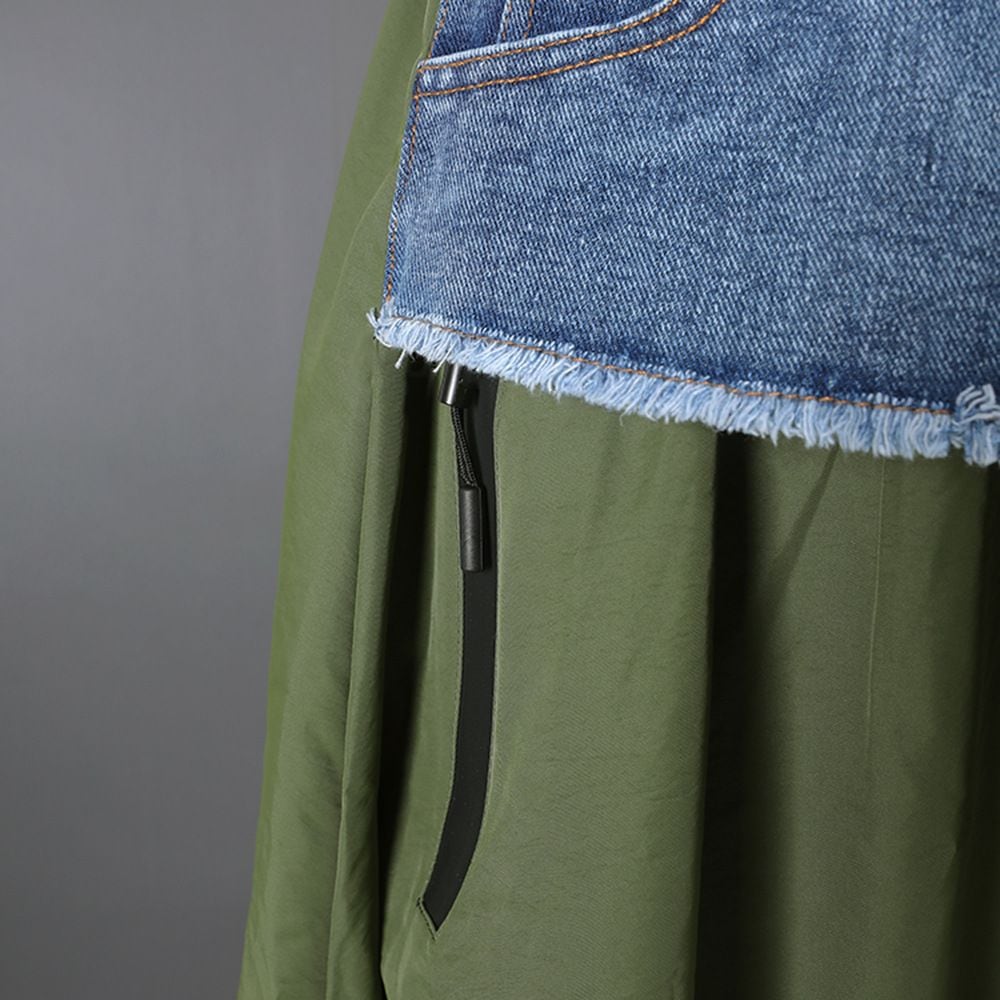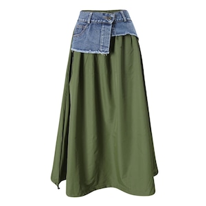 フロントのアシンメトリックなデニムスティッチがアクセントになった、Aライン・ロング丈のカジュアルスカートです。ウエストはゴムなので、着脱が簡単で履き心地が良いです。大きく広がる裾にはドローコードが付いて、シルエットをアレンジできます。グリーンとアプリコットの2色から選べます。