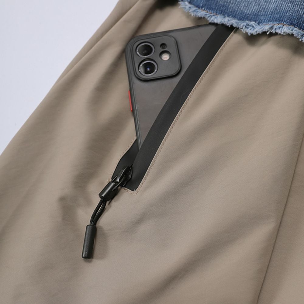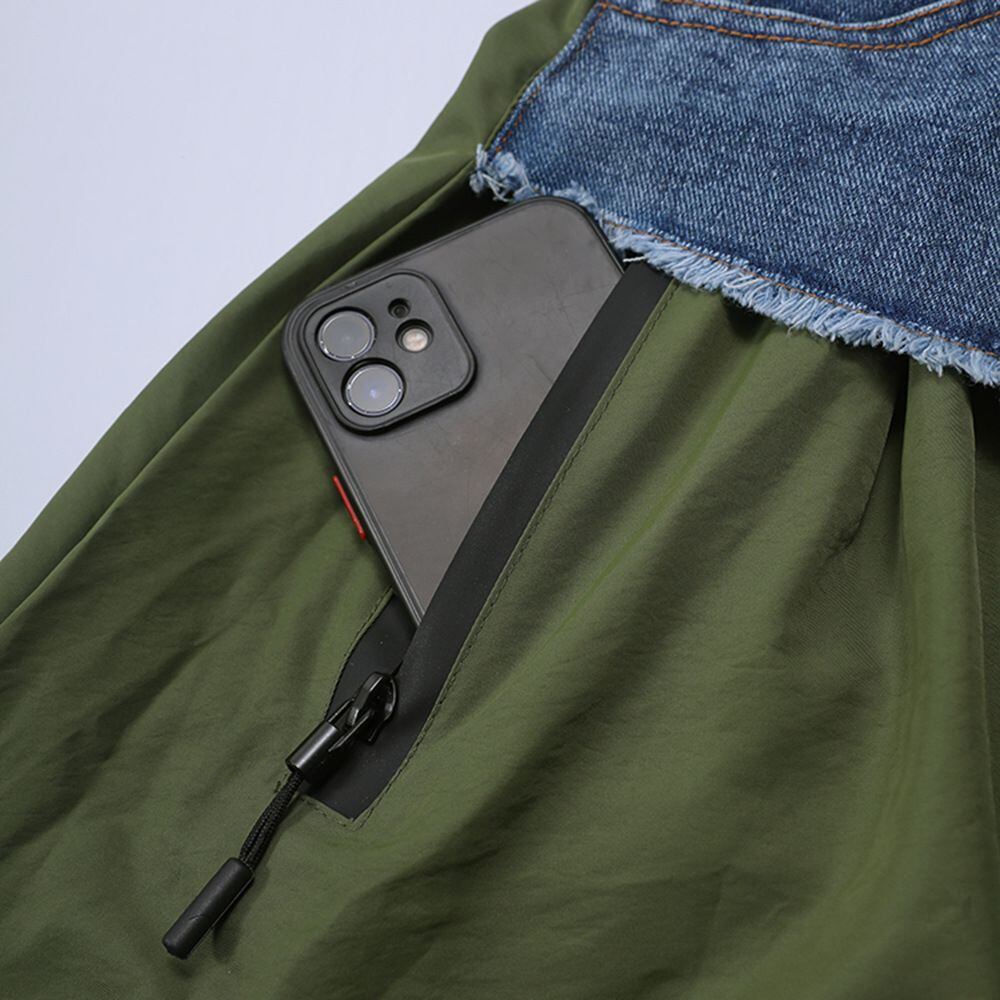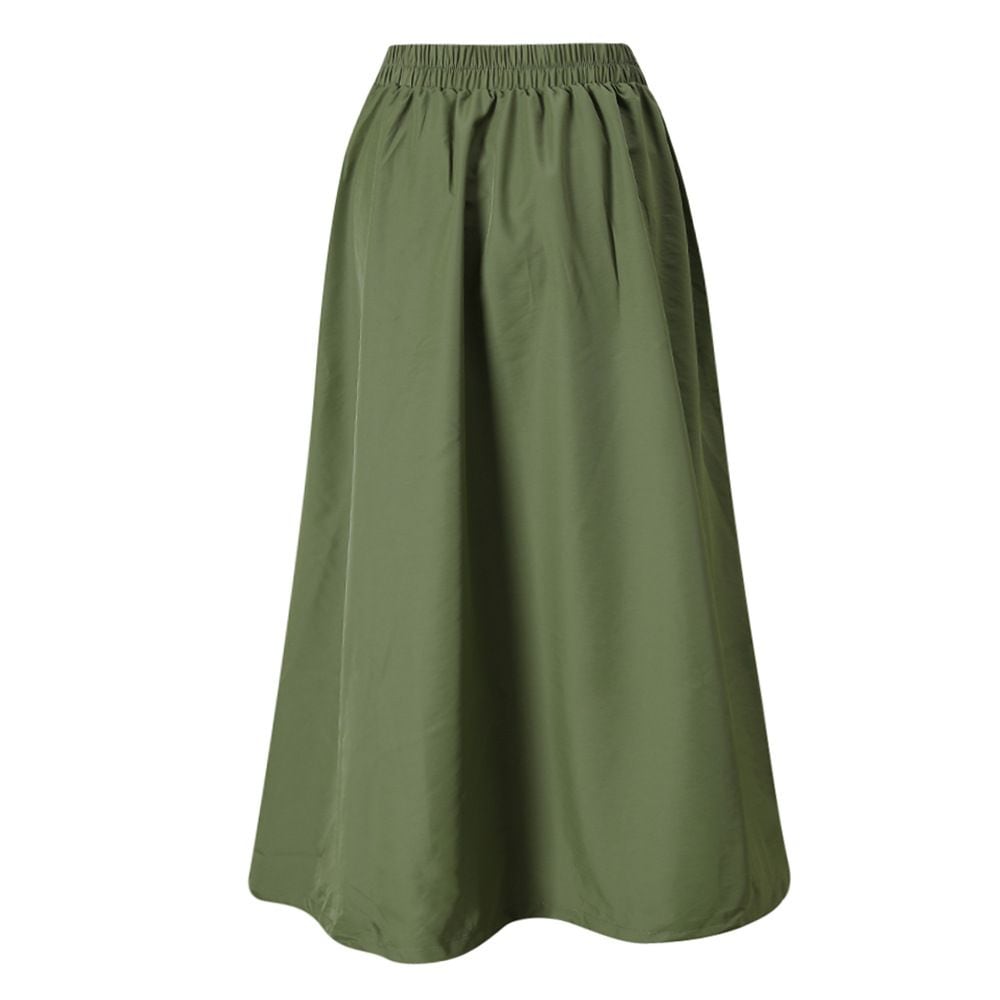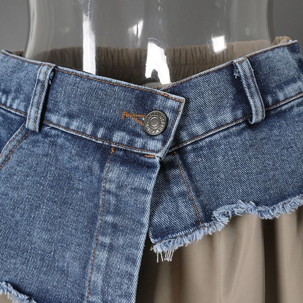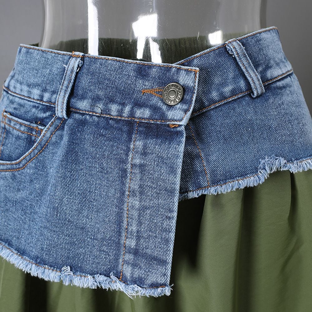 フロントのアシンメトリックなデニムスティッチがアクセントになった、Aライン・ロング丈のカジュアルスカートです。ウエストはゴムなので、着脱が簡単で履き心地が良いです。大きく広がる裾にはドローコードが付いて、シルエットをアレンジできます。グリーンとアプリコットの2色から選べます。