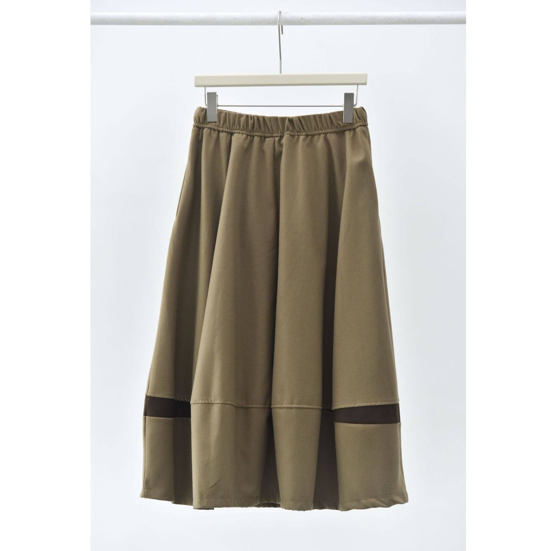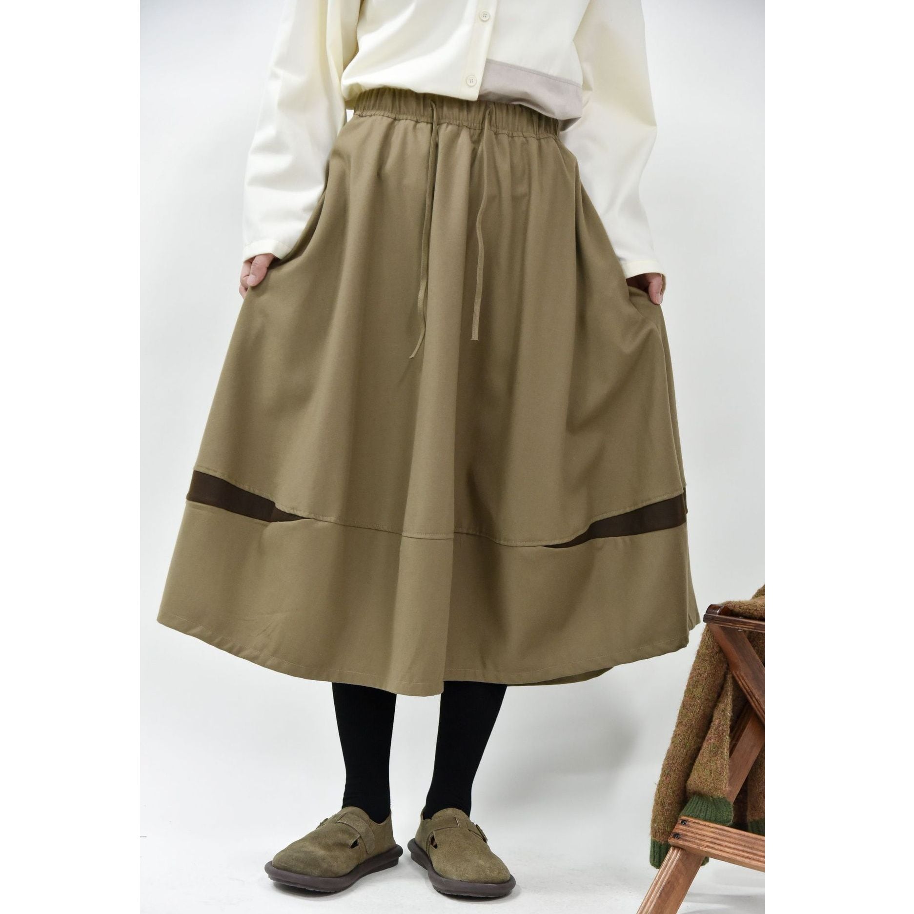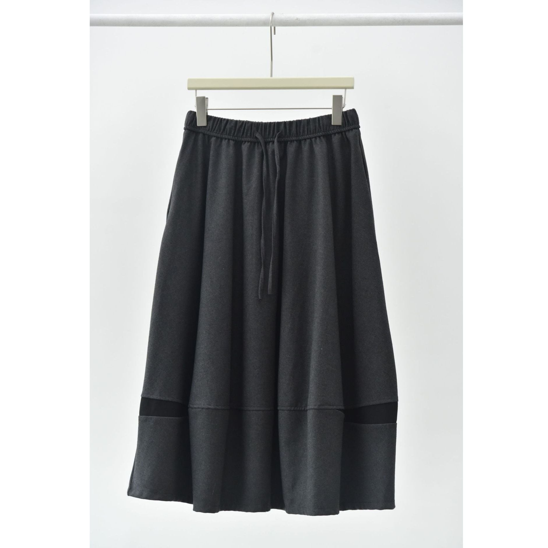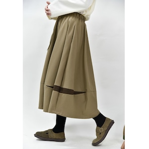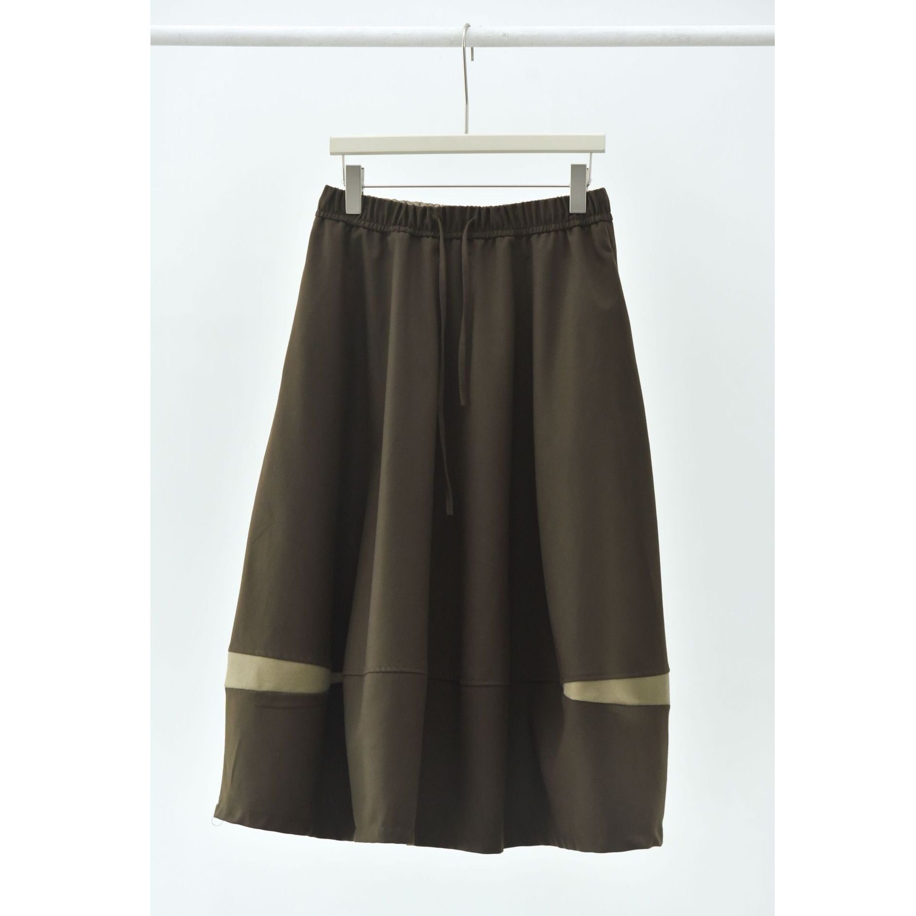 コントラストスティッチが作るランタンのようなシルエットがキュートな、Aライン・膝下丈のデザインスカートです。ウエストはドローストリングなので、履き心地が良いです。落ち着いた色味で合わせやすい、カジュアルなアイテムです。色は4色から選べます。