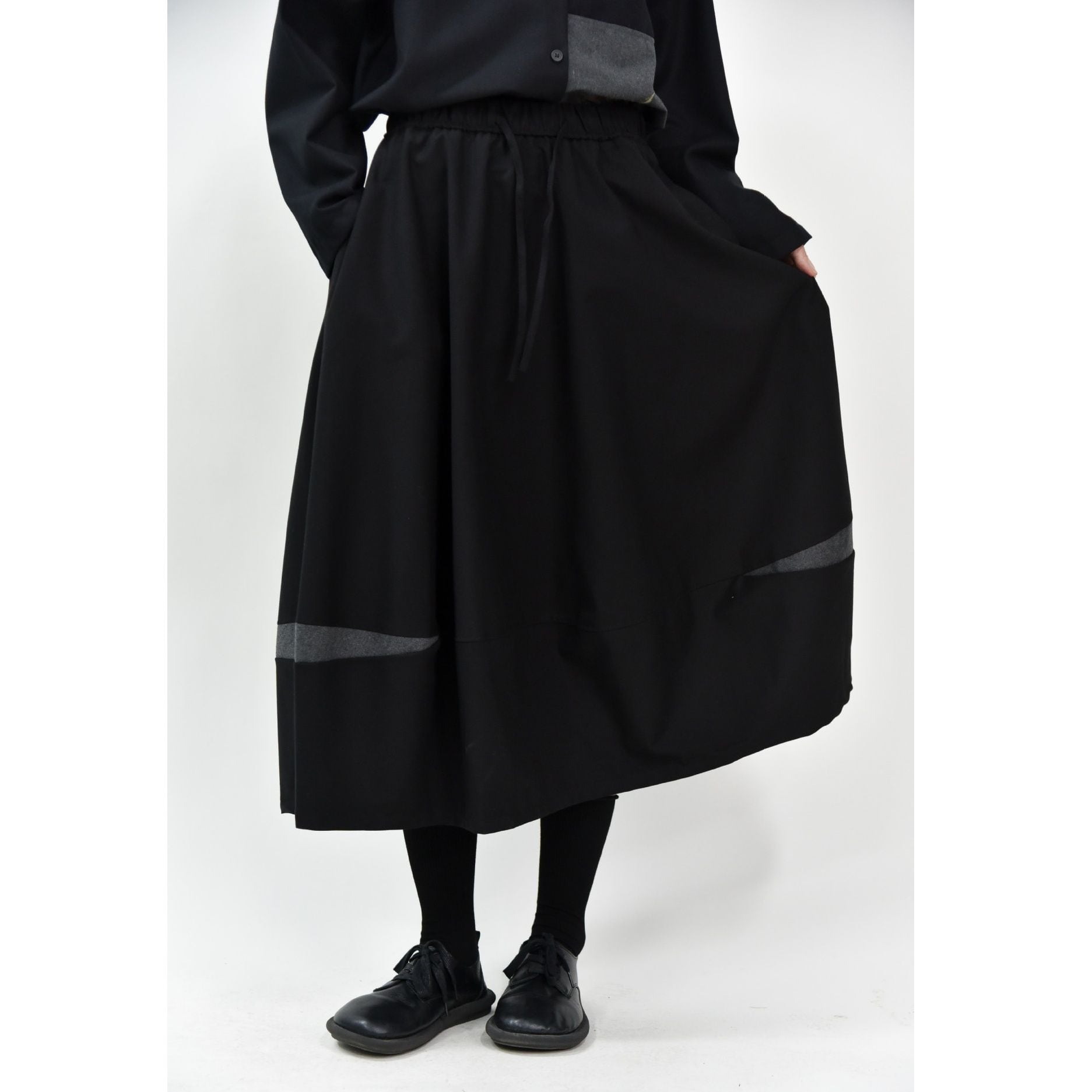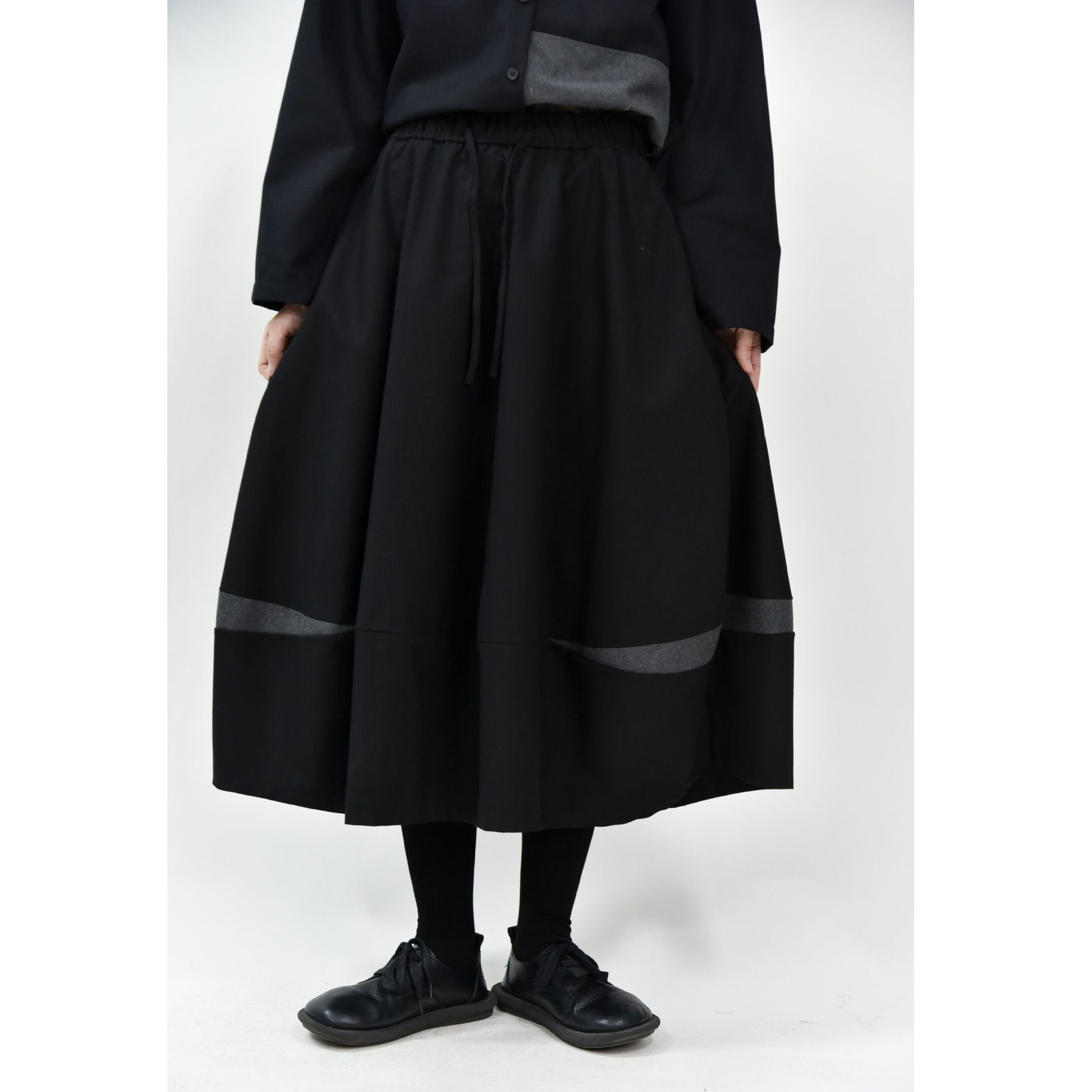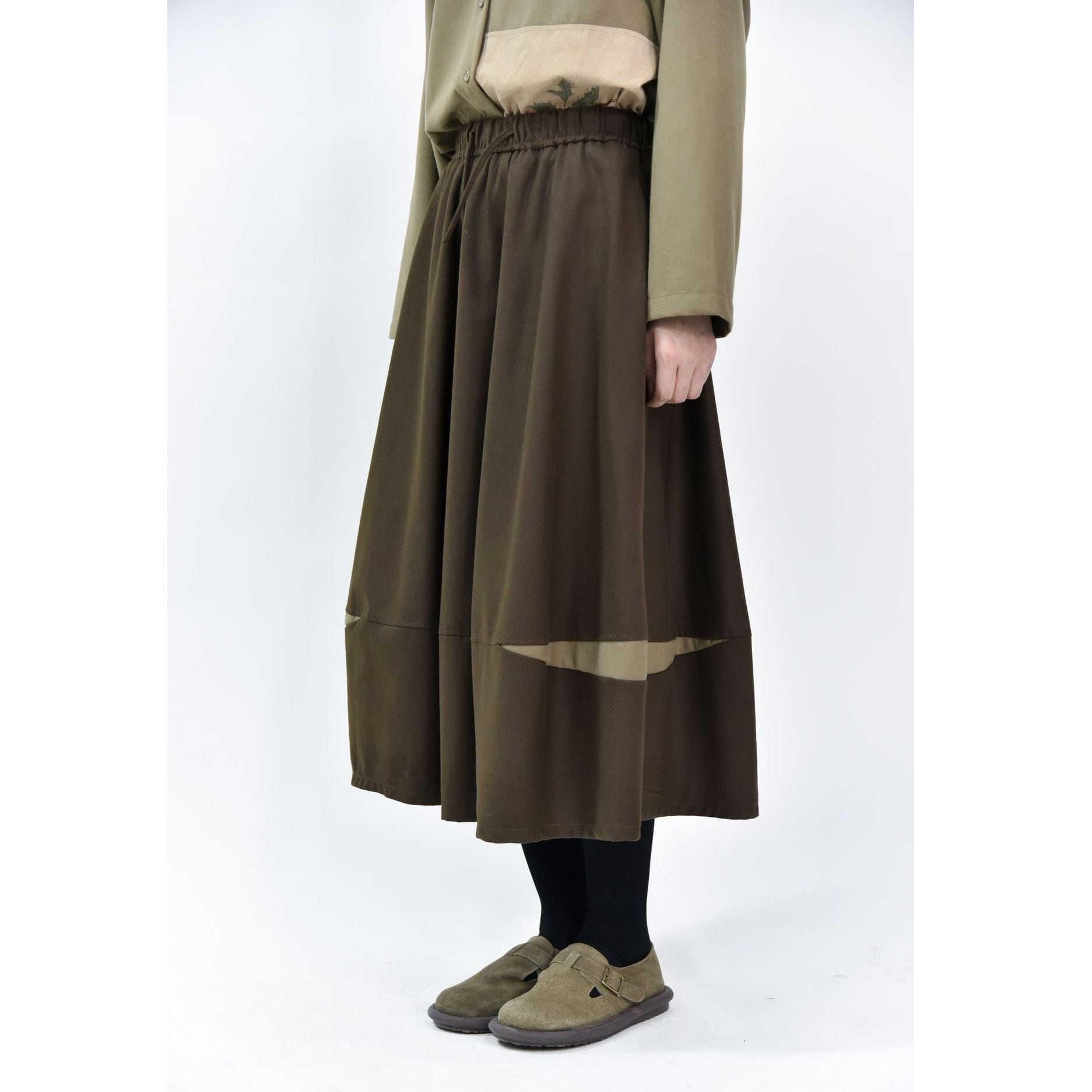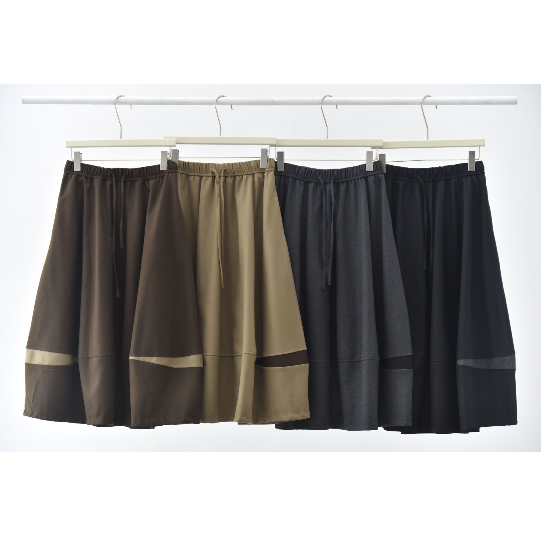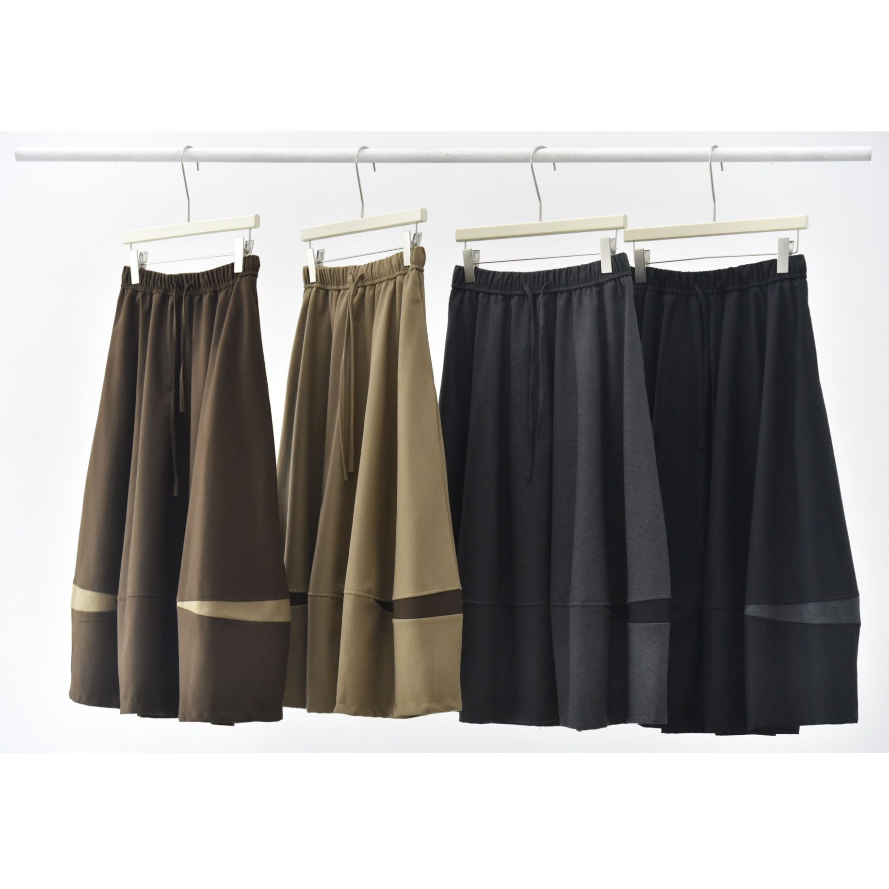 コントラストスティッチが作るランタンのようなシルエットがキュートな、Aライン・膝下丈のデザインスカートです。ウエストはドローストリングなので、履き心地が良いです。落ち着いた色味で合わせやすい、カジュアルなアイテムです。色は4色から選べます。