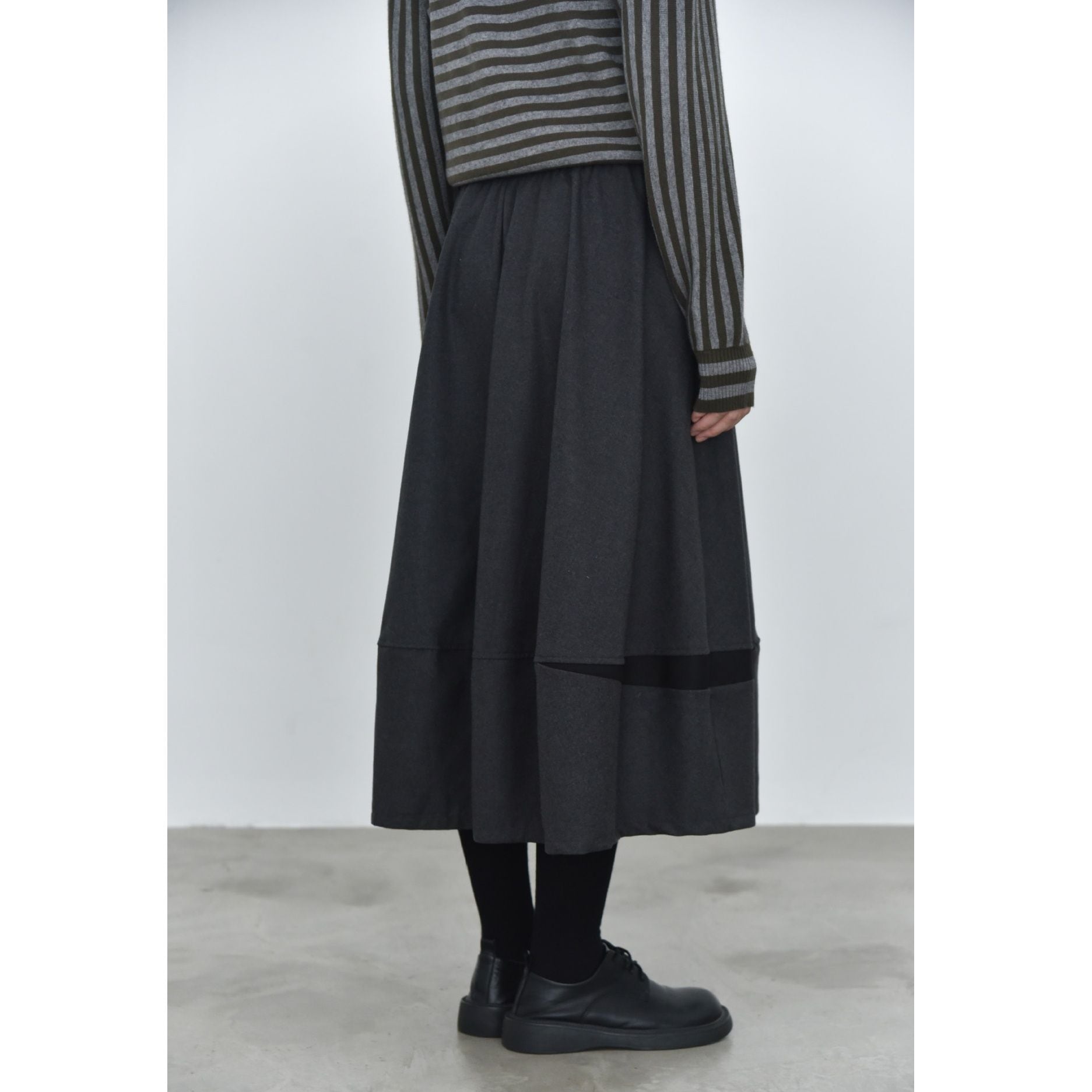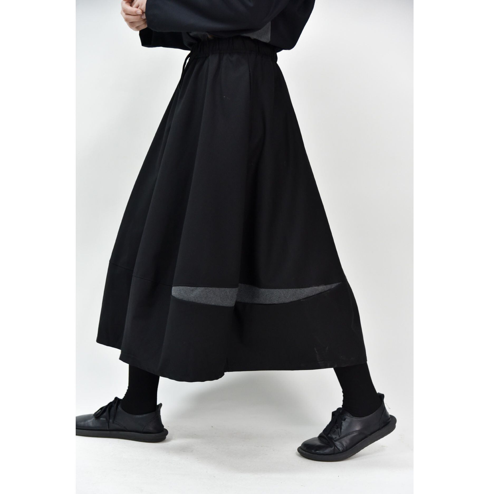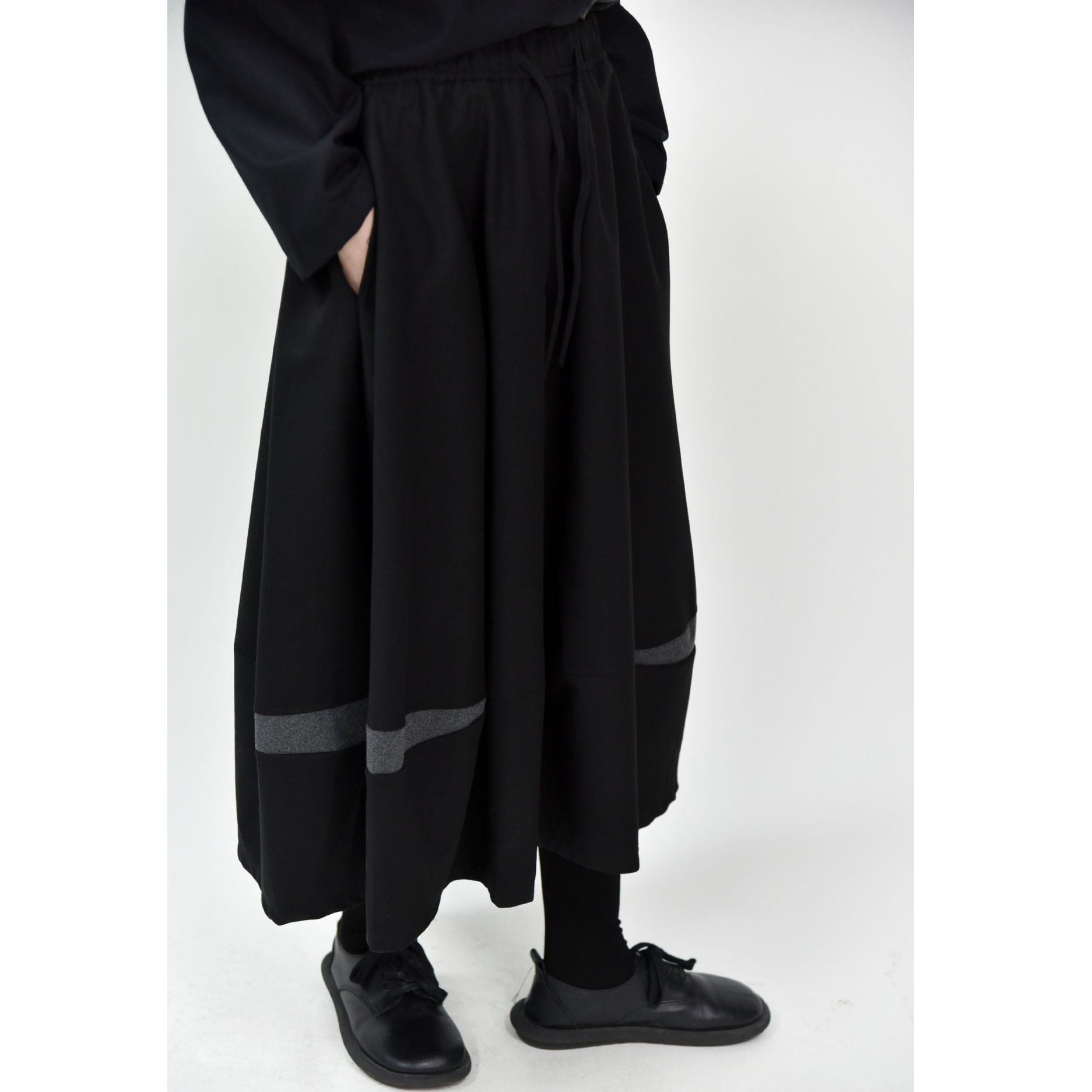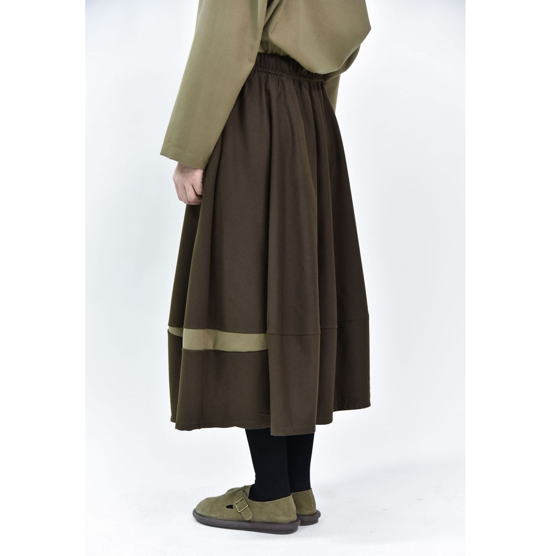 コントラストスティッチが作るランタンのようなシルエットがキュートな、Aライン・膝下丈のデザインスカートです。ウエストはドローストリングなので、履き心地が良いです。落ち着いた色味で合わせやすい、カジュアルなアイテムです。色は4色から選べます。
