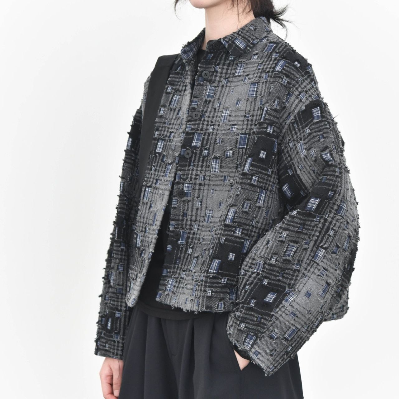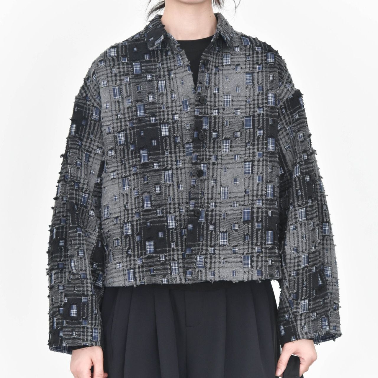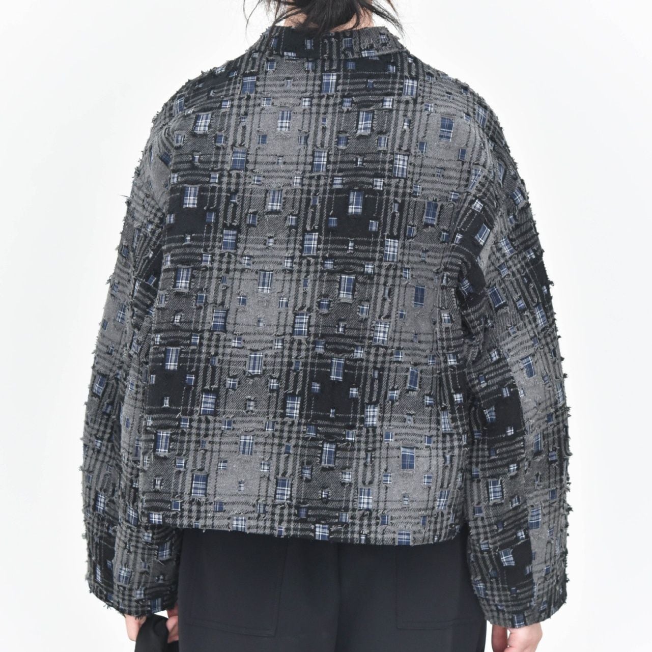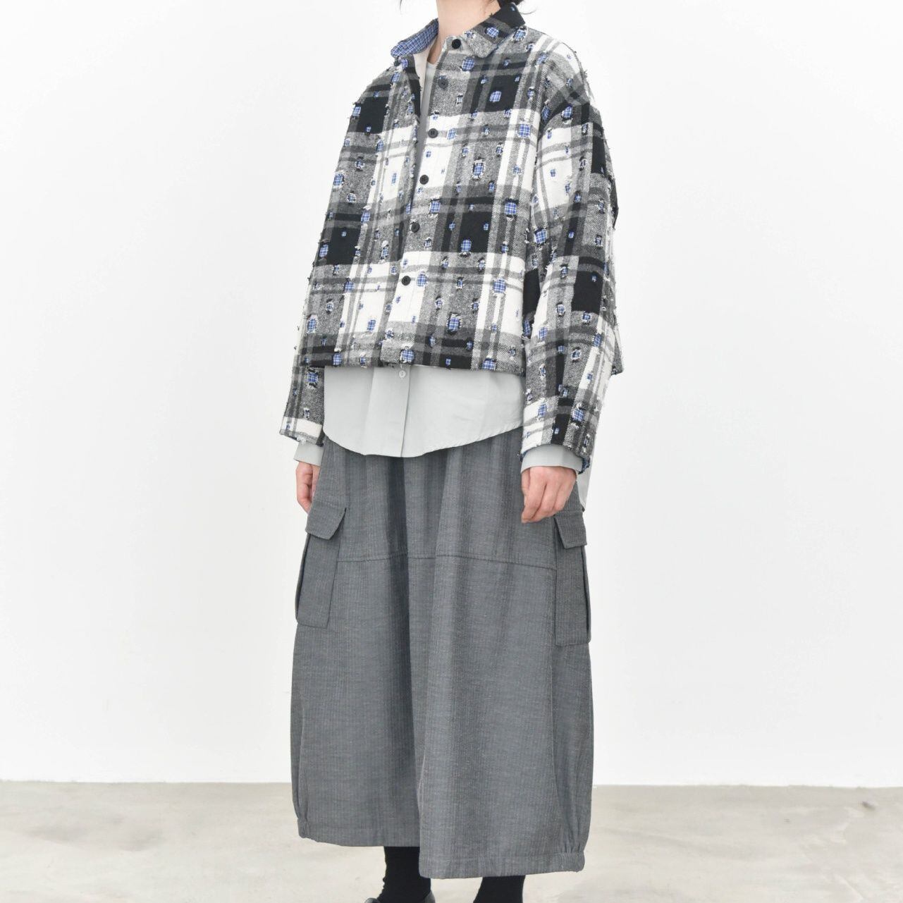 ダメージ加工やパッチ加工を施したデザインチェックの素材がお洒落な、ポロ襟・長袖・ショート丈のカジュアルジャケットです。キルティングのライニングで温かい、ドロップショルダーのゆったりとしたシルエットのアイテムです。色は2色から選べます。