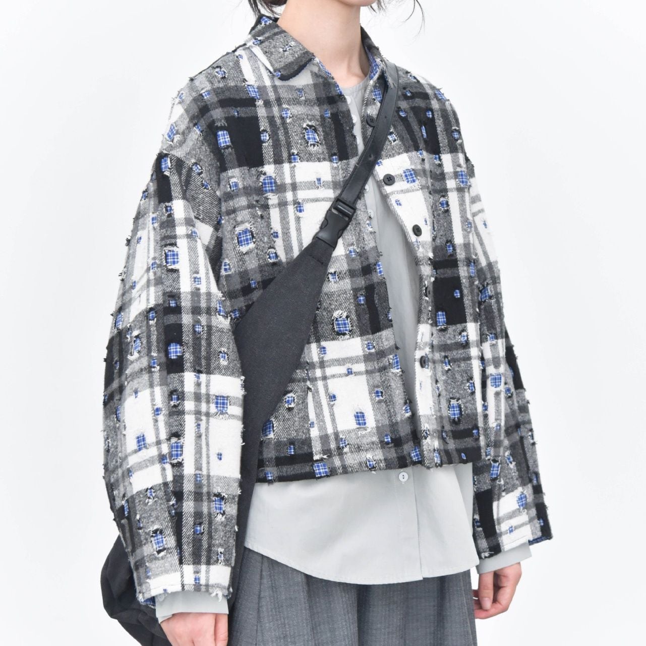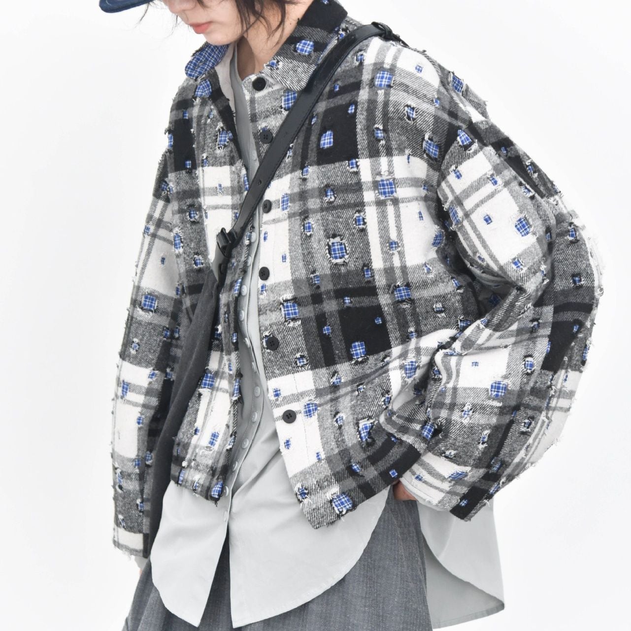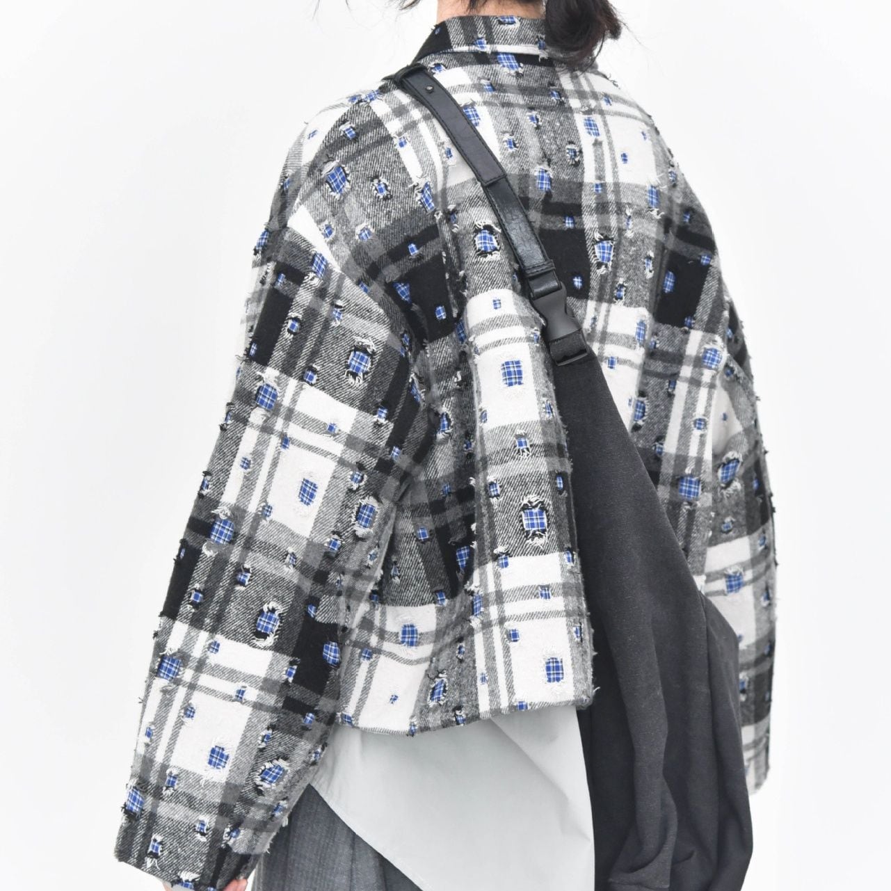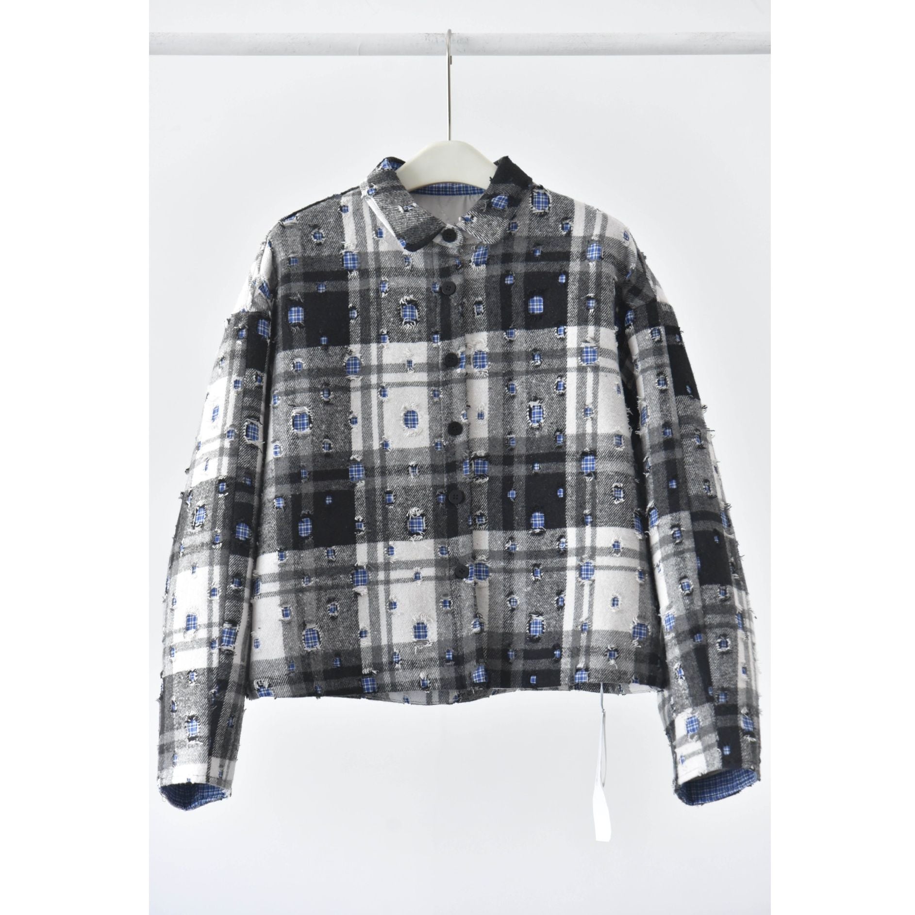 ダメージ加工やパッチ加工を施したデザインチェックの素材がお洒落な、ポロ襟・長袖・ショート丈のカジュアルジャケットです。キルティングのライニングで温かい、ドロップショルダーのゆったりとしたシルエットのアイテムです。色は2色から選べます。