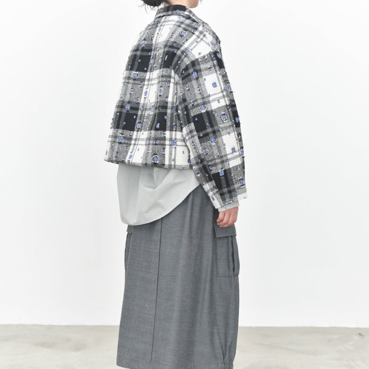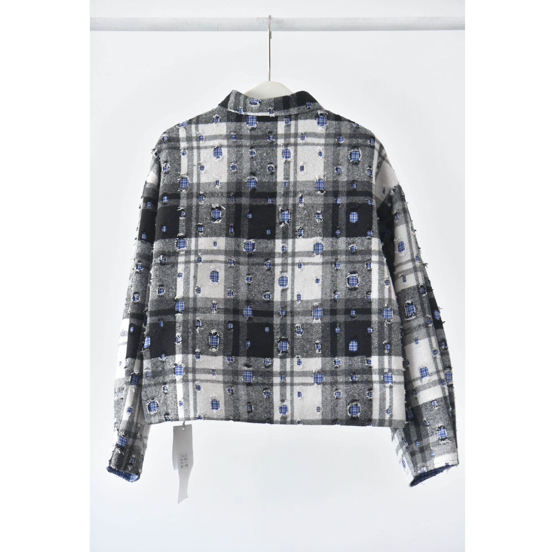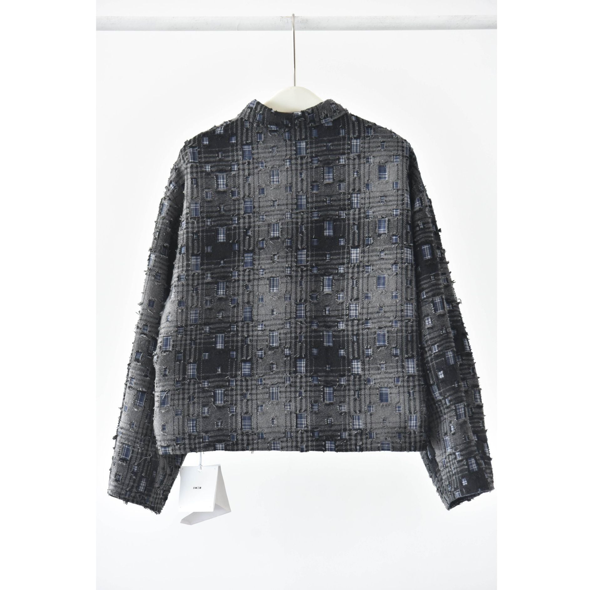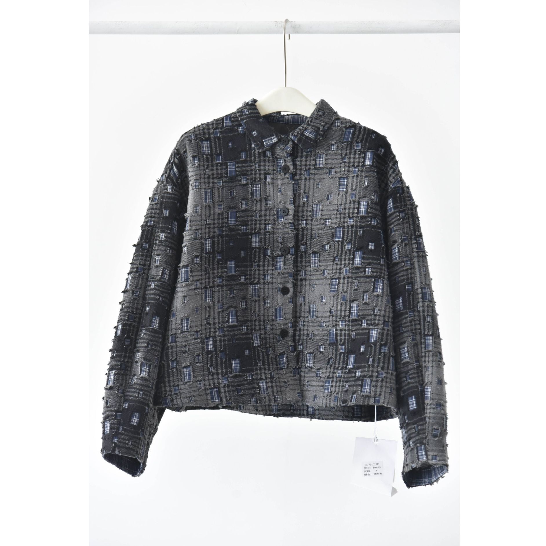 ダメージ加工やパッチ加工を施したデザインチェックの素材がお洒落な、ポロ襟・長袖・ショート丈のカジュアルジャケットです。キルティングのライニングで温かい、ドロップショルダーのゆったりとしたシルエットのアイテムです。色は2色から選べます。