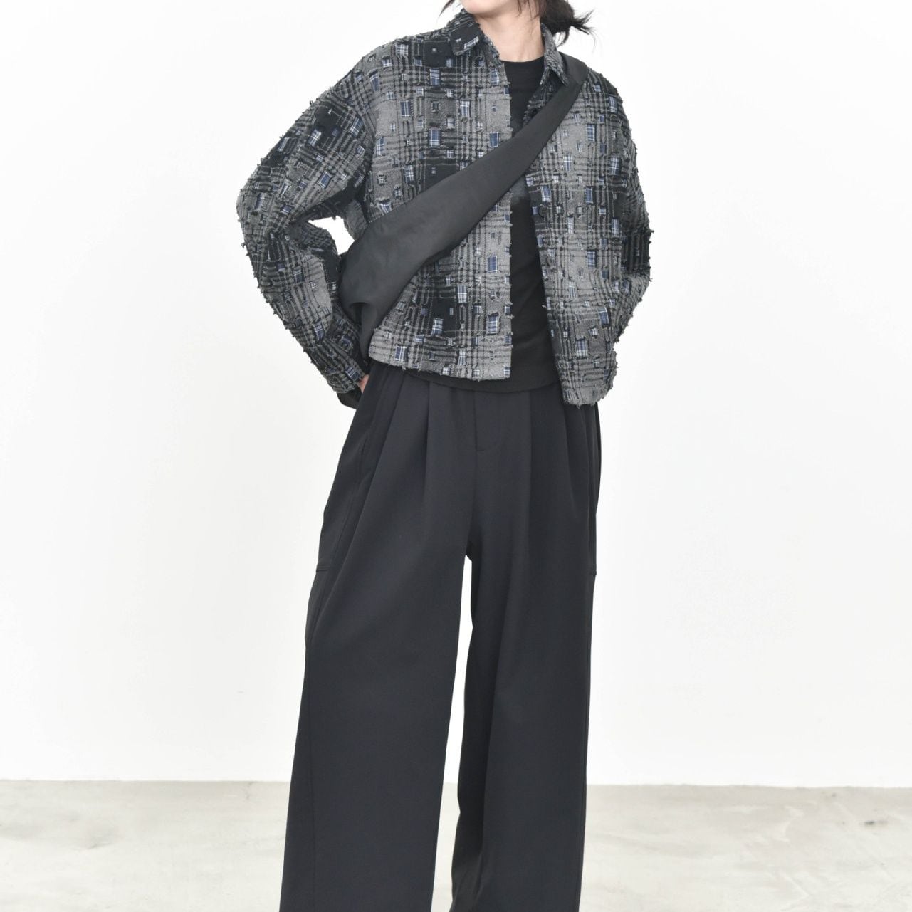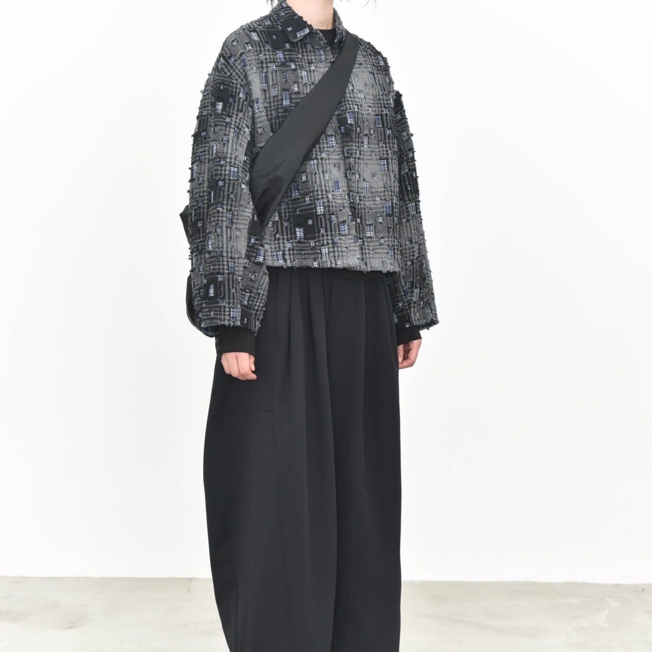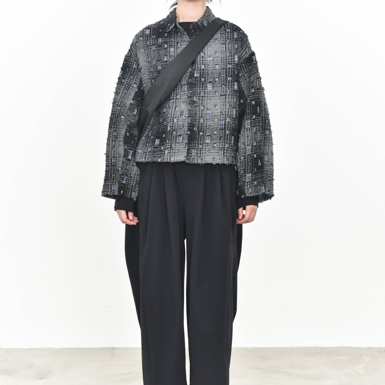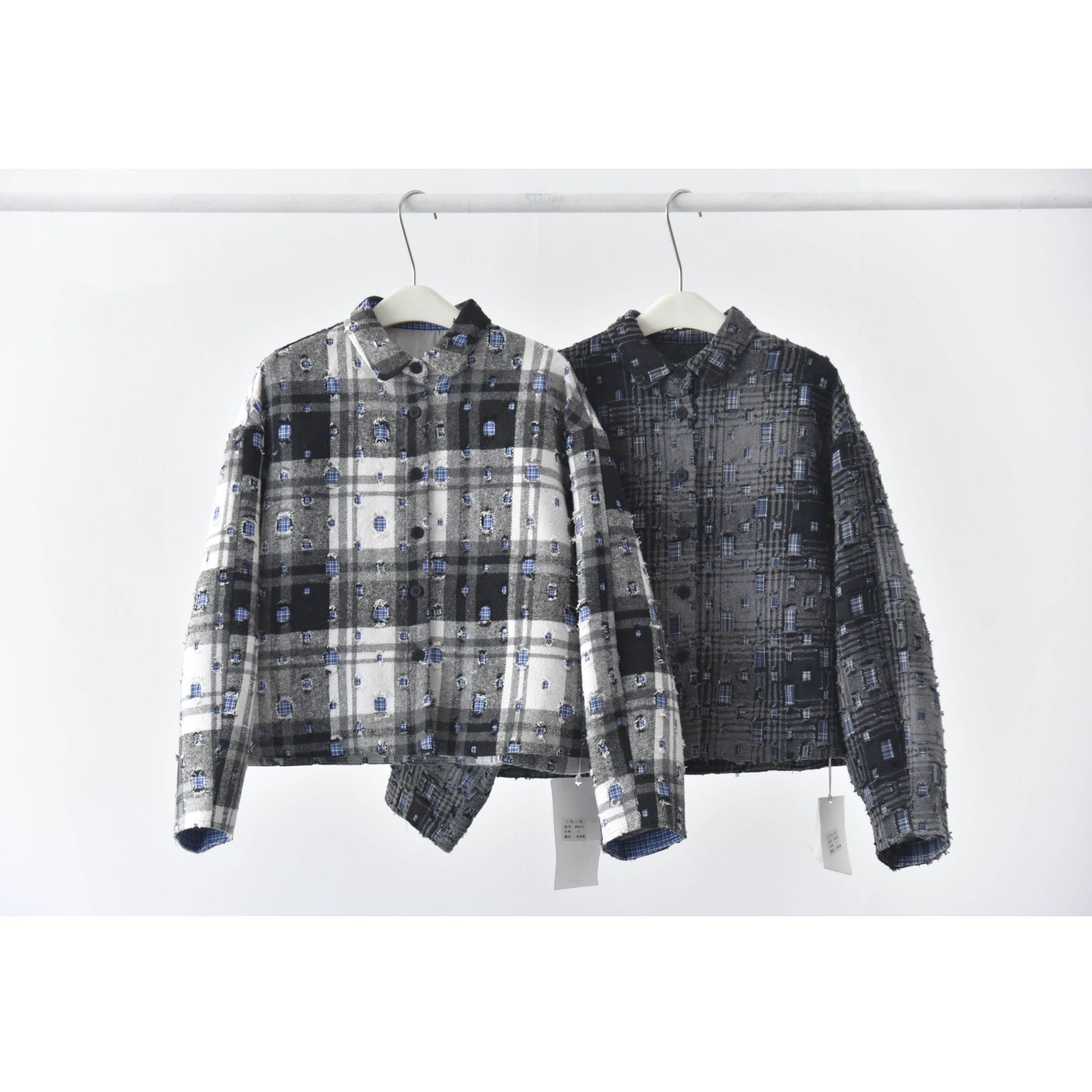 ダメージ加工やパッチ加工を施したデザインチェックの素材がお洒落な、ポロ襟・長袖・ショート丈のカジュアルジャケットです。キルティングのライニングで温かい、ドロップショルダーのゆったりとしたシルエットのアイテムです。色は2色から選べます。