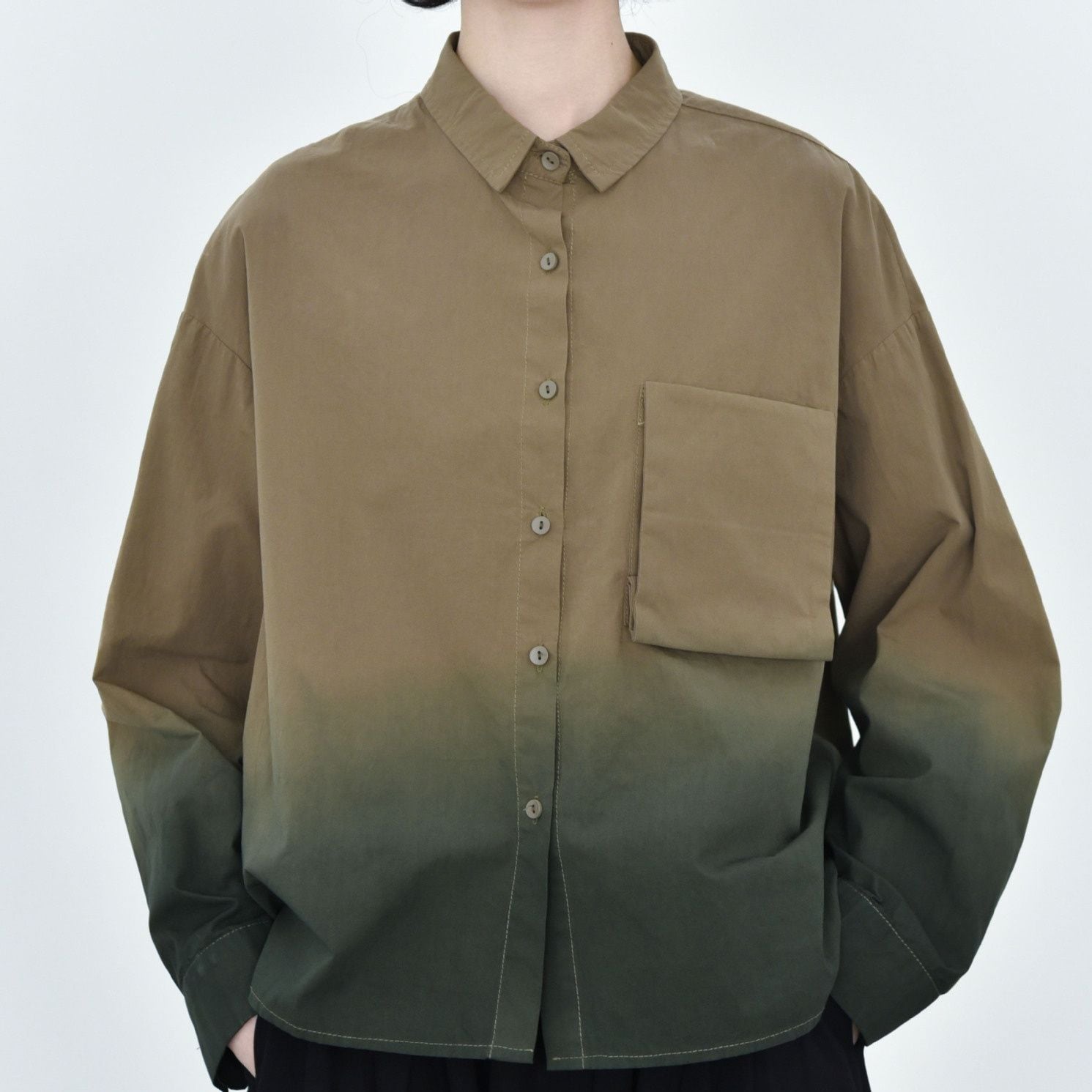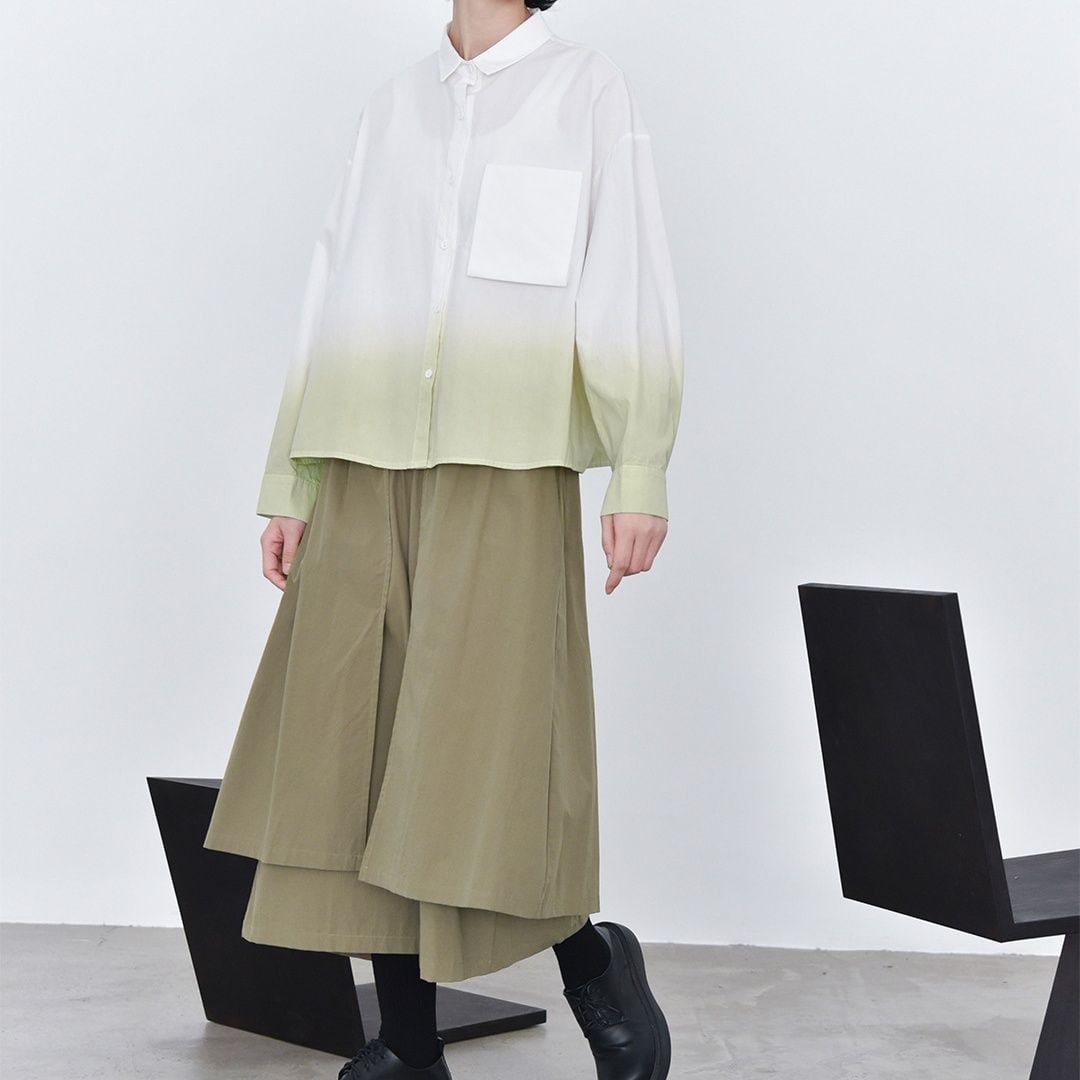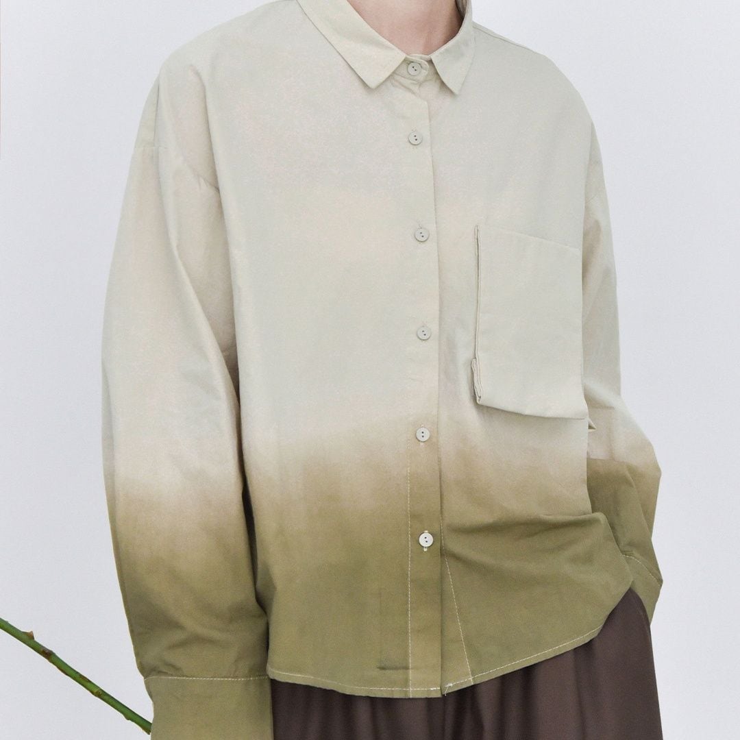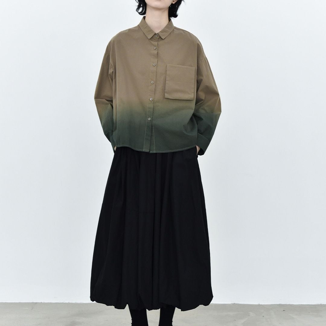 裾のグラデーションや立体デザインの胸ポケットがお洒落な、タイニーカラー・長袖・ショート丈のシャツジャケットです。ドロップショルダーのゆったりとしたシルエットと落ち着いた色味で使いやすい、春や秋にぴったりのカジュアルアイテムです。色は3色から選べます。