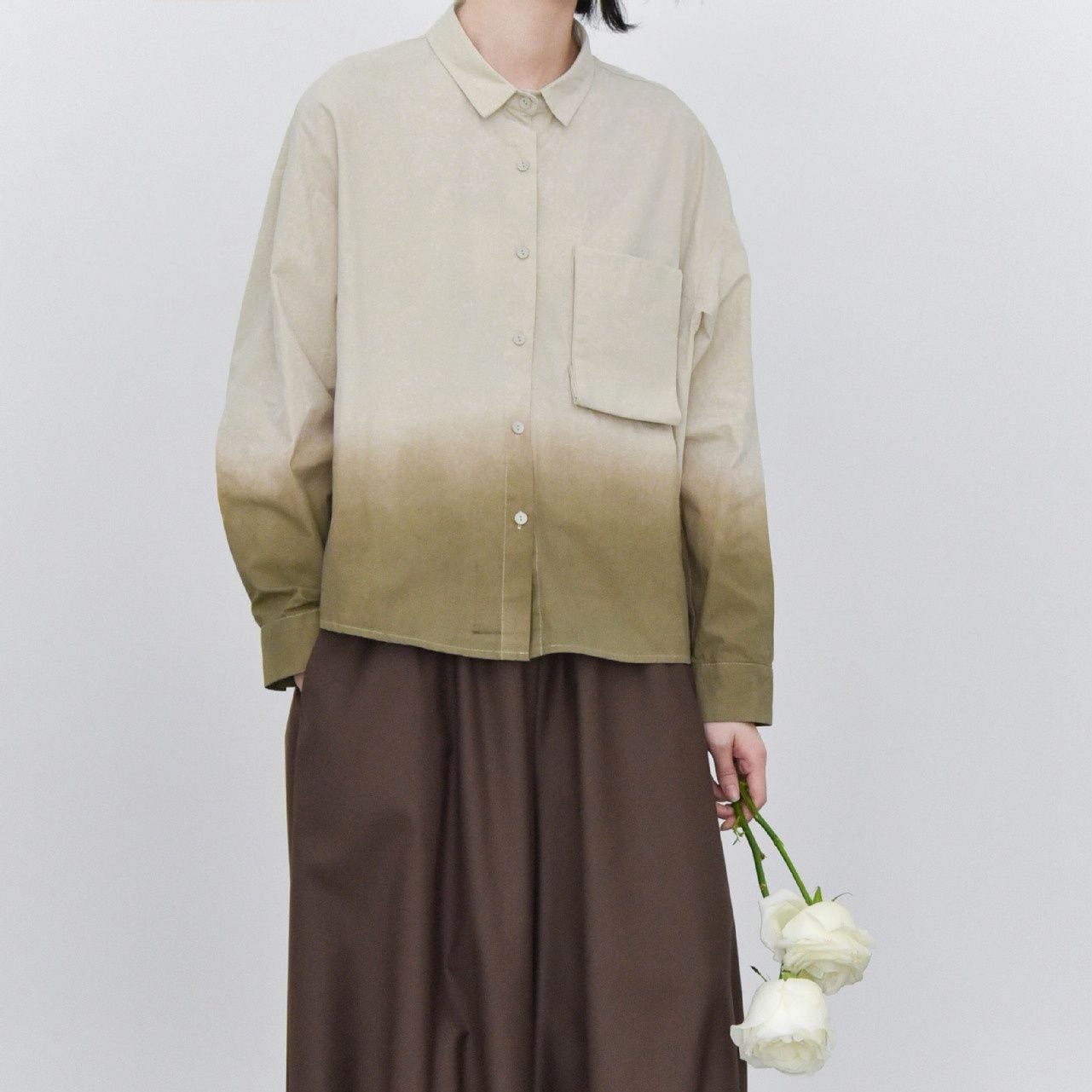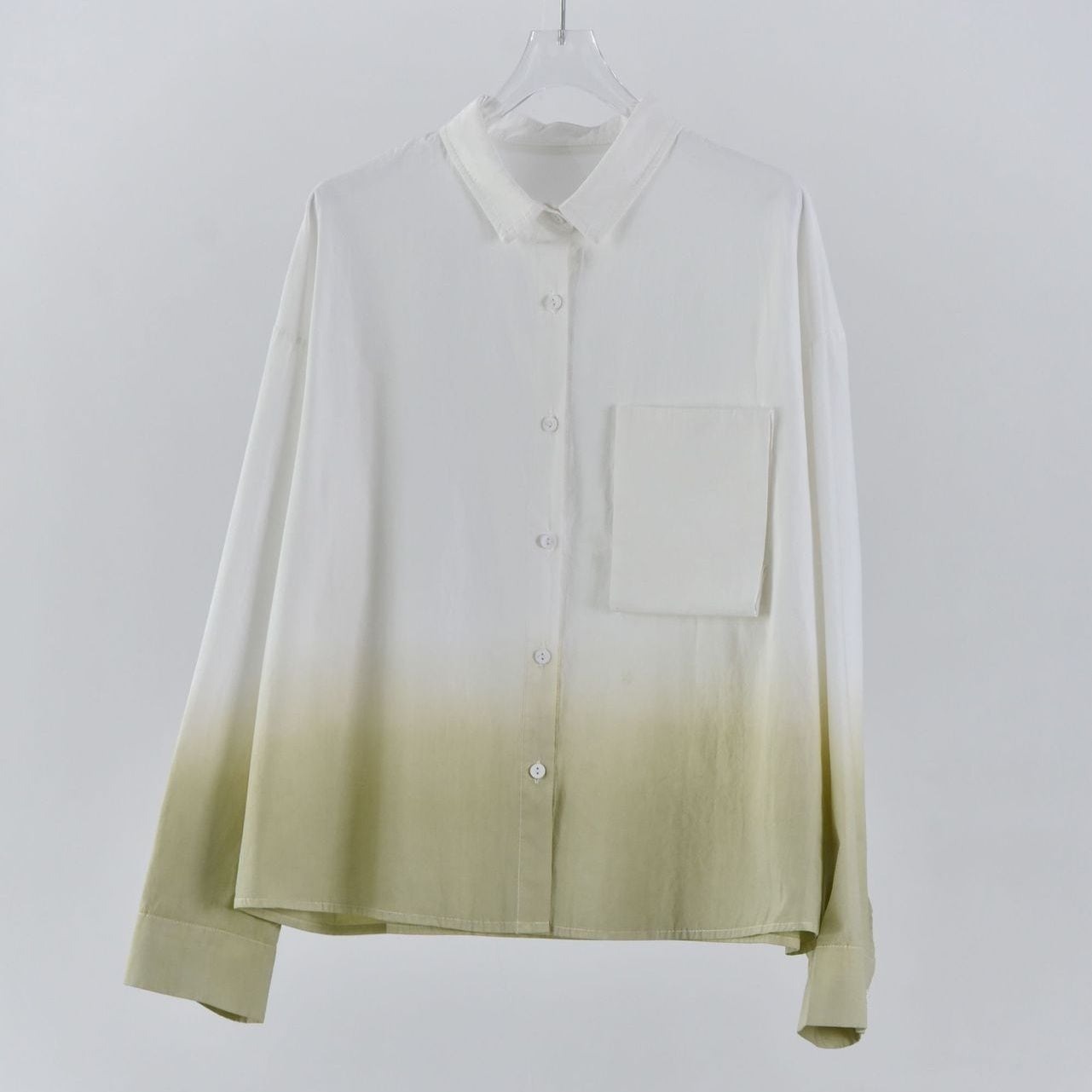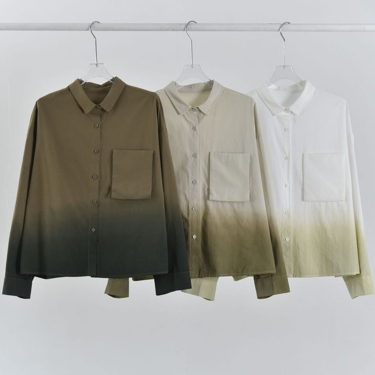 裾のグラデーションや立体デザインの胸ポケットがお洒落な、タイニーカラー・長袖・ショート丈のシャツジャケットです。ドロップショルダーのゆったりとしたシルエットと落ち着いた色味で使いやすい、春や秋にぴったりのカジュアルアイテムです。色は3色から選べます。
