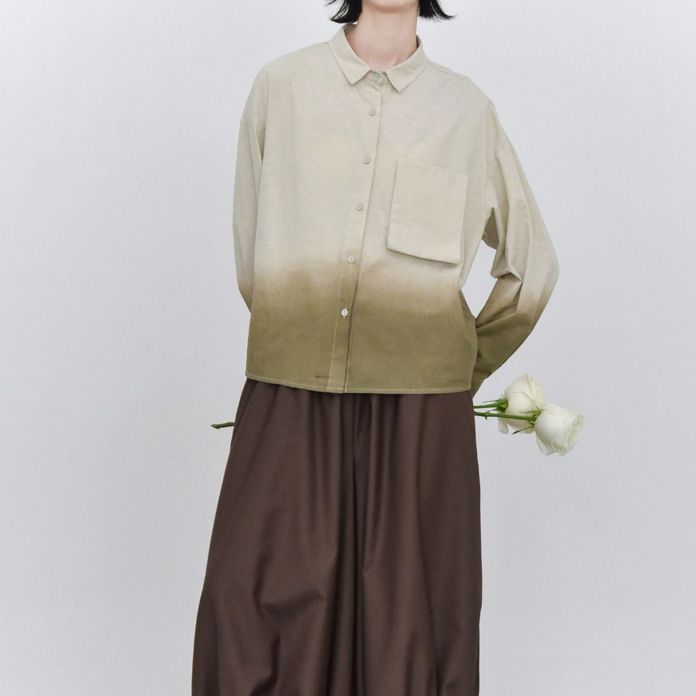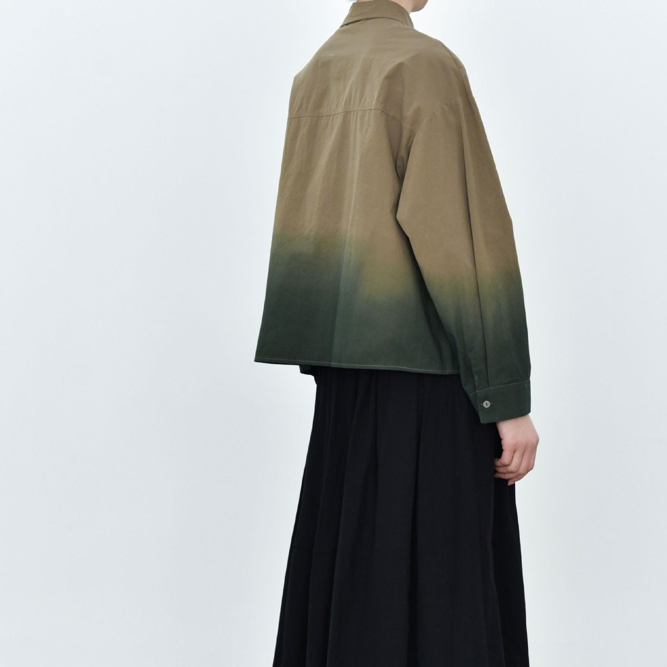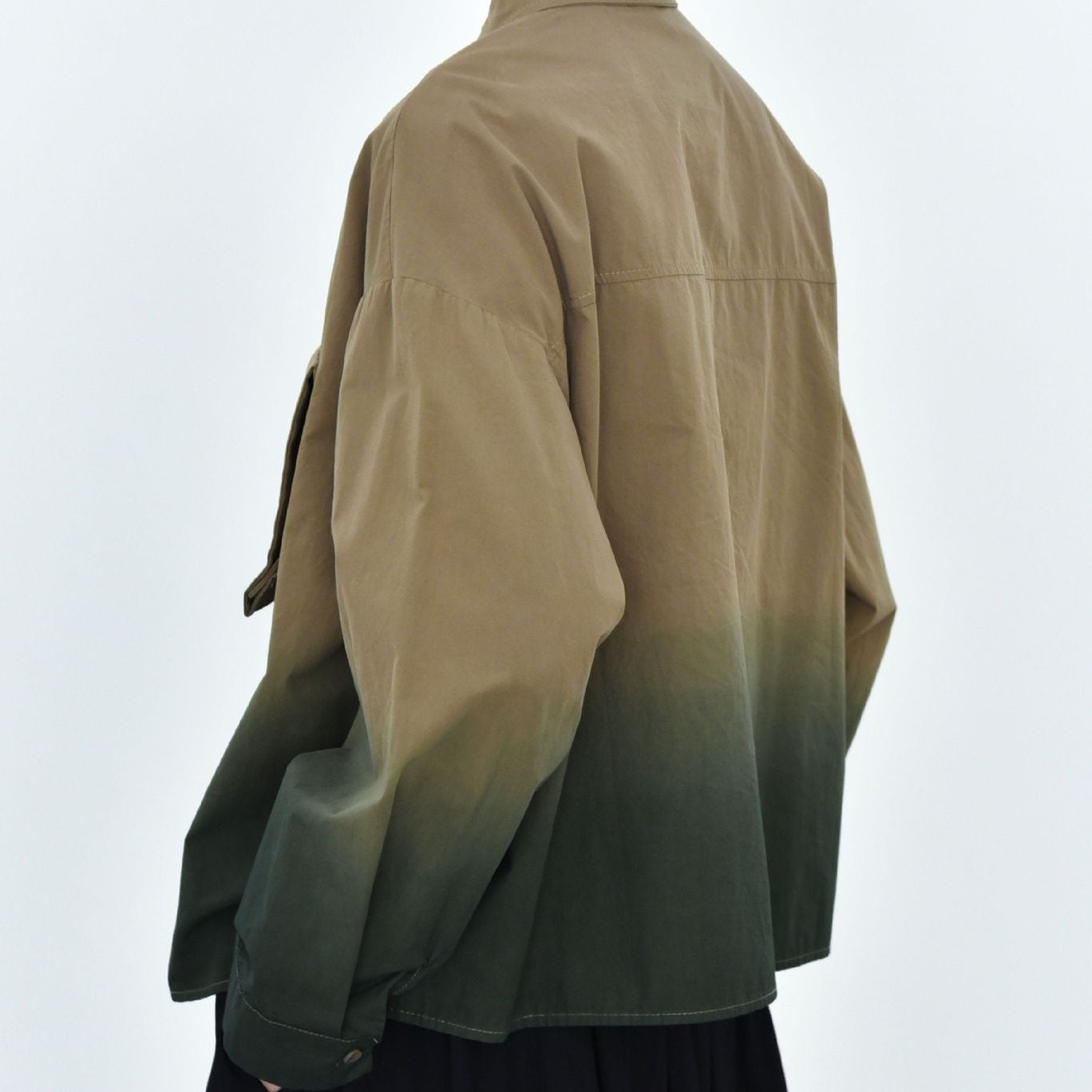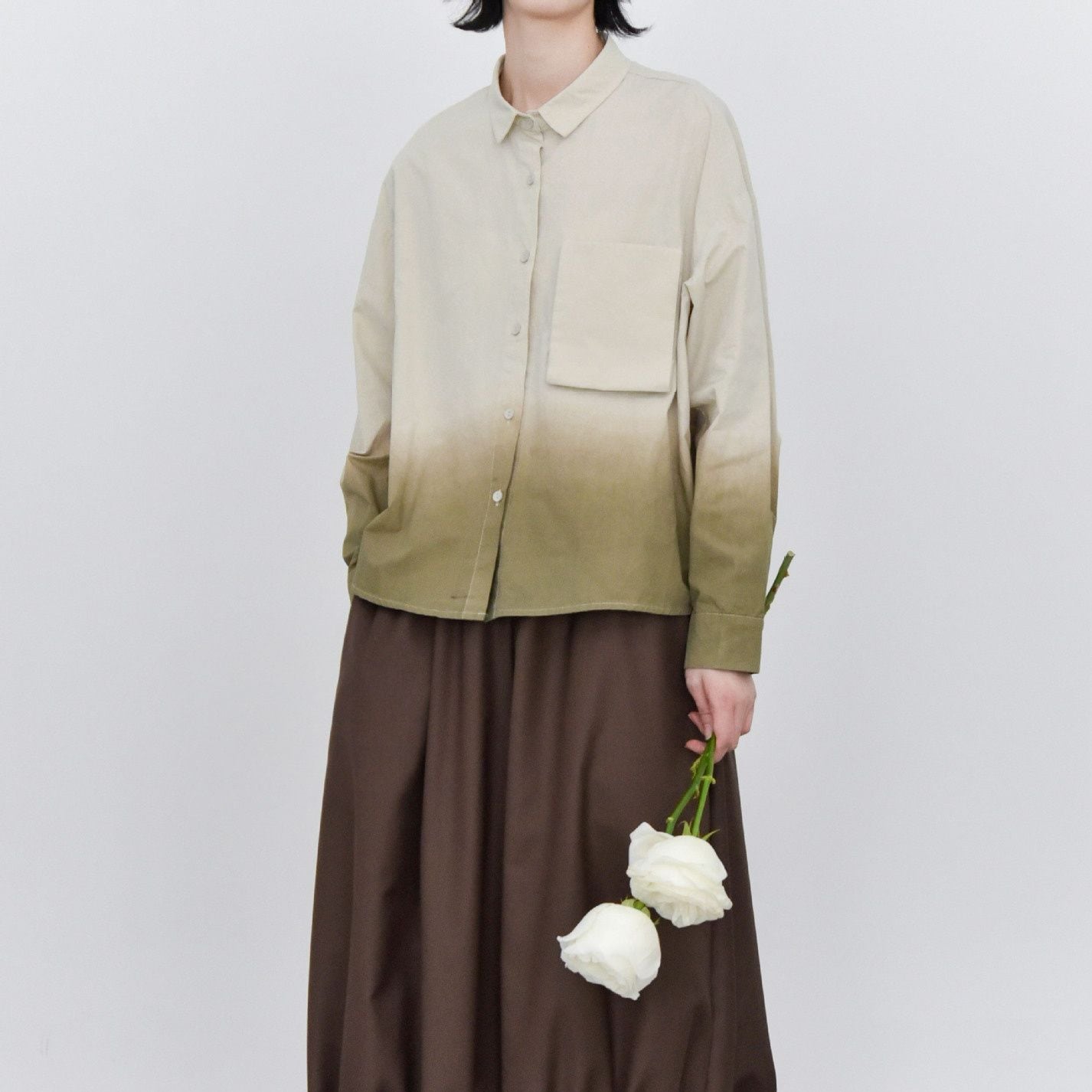 裾のグラデーションや立体デザインの胸ポケットがお洒落な、タイニーカラー・長袖・ショート丈のシャツジャケットです。ドロップショルダーのゆったりとしたシルエットと落ち着いた色味で使いやすい、春や秋にぴったりのカジュアルアイテムです。色は3色から選べます。