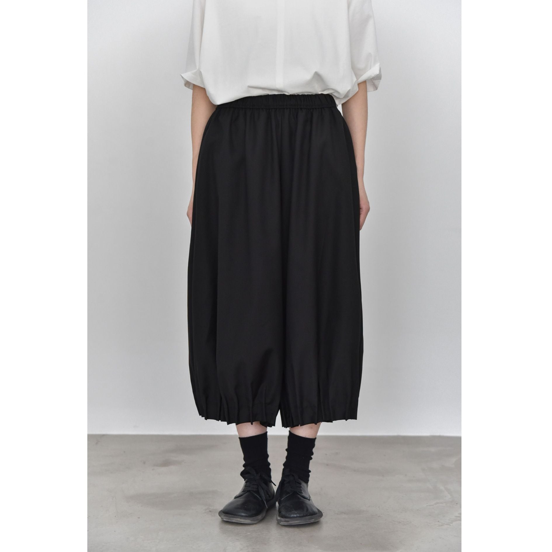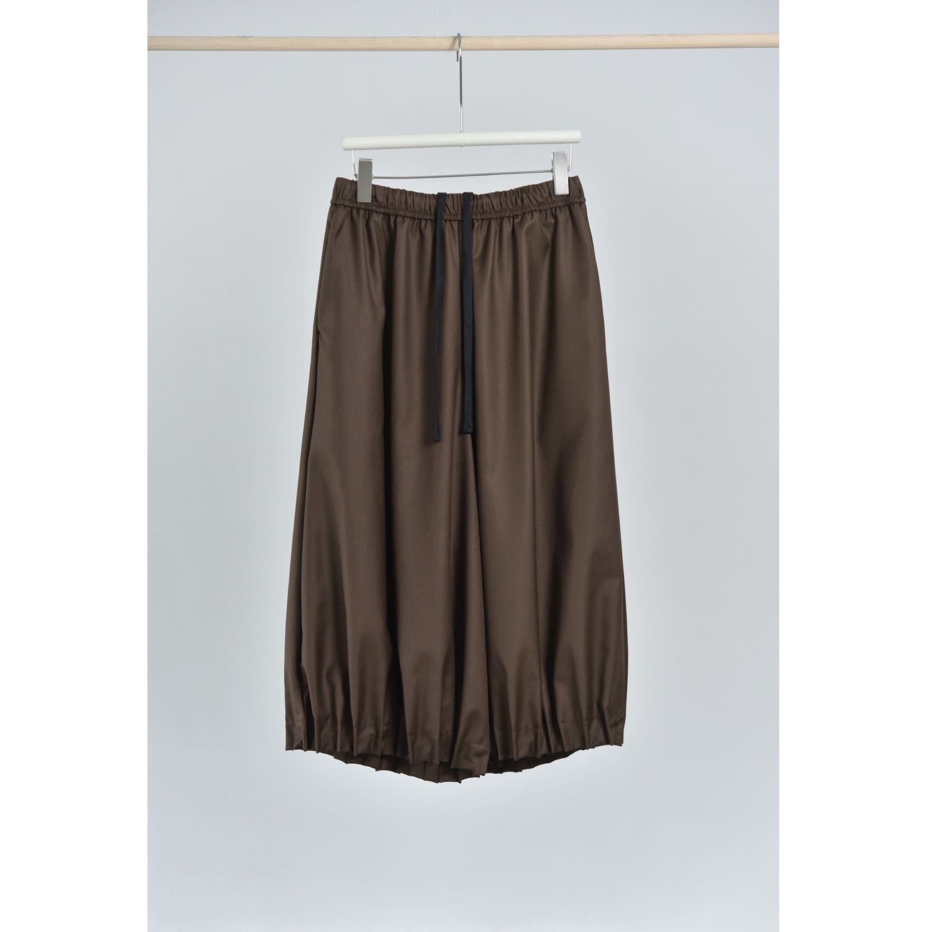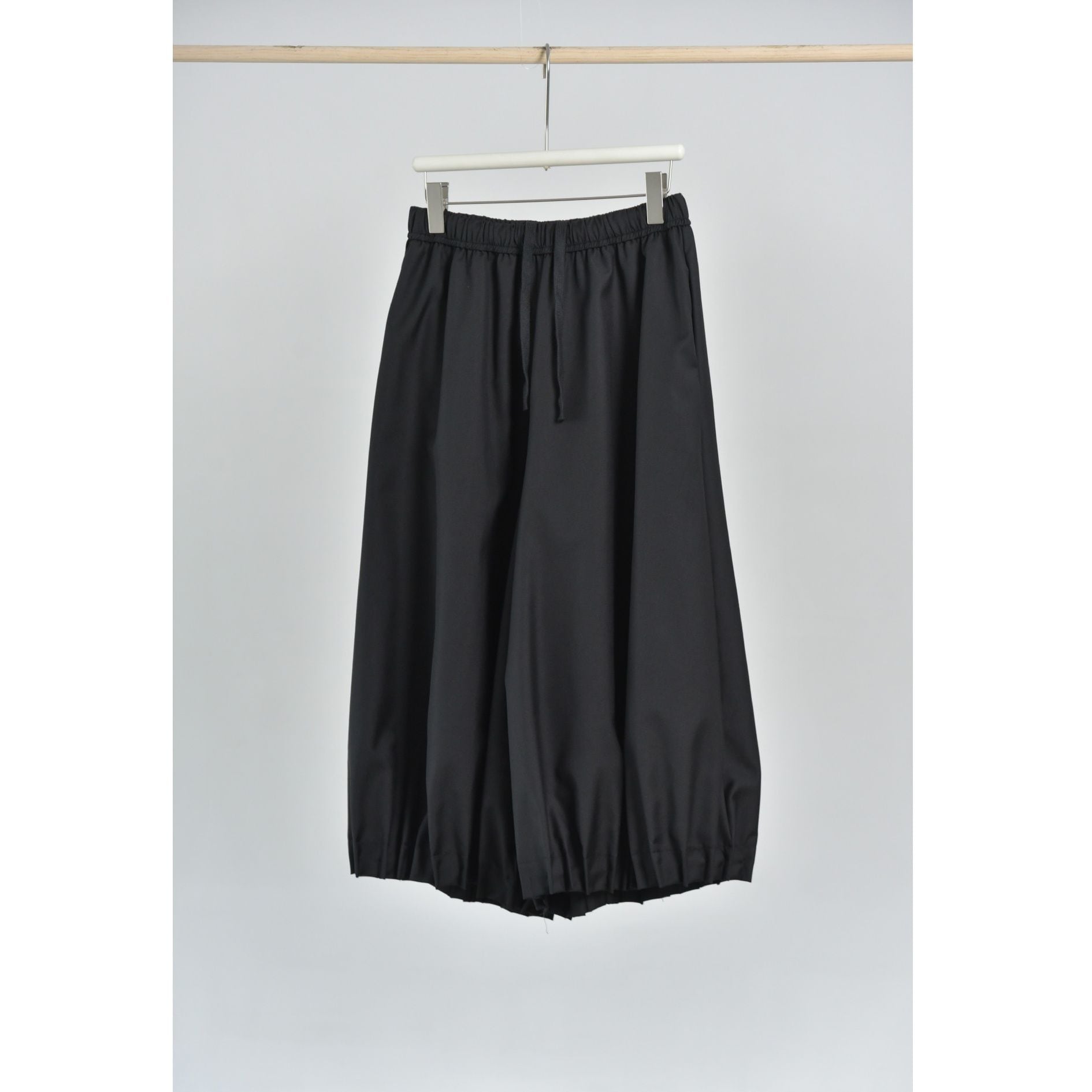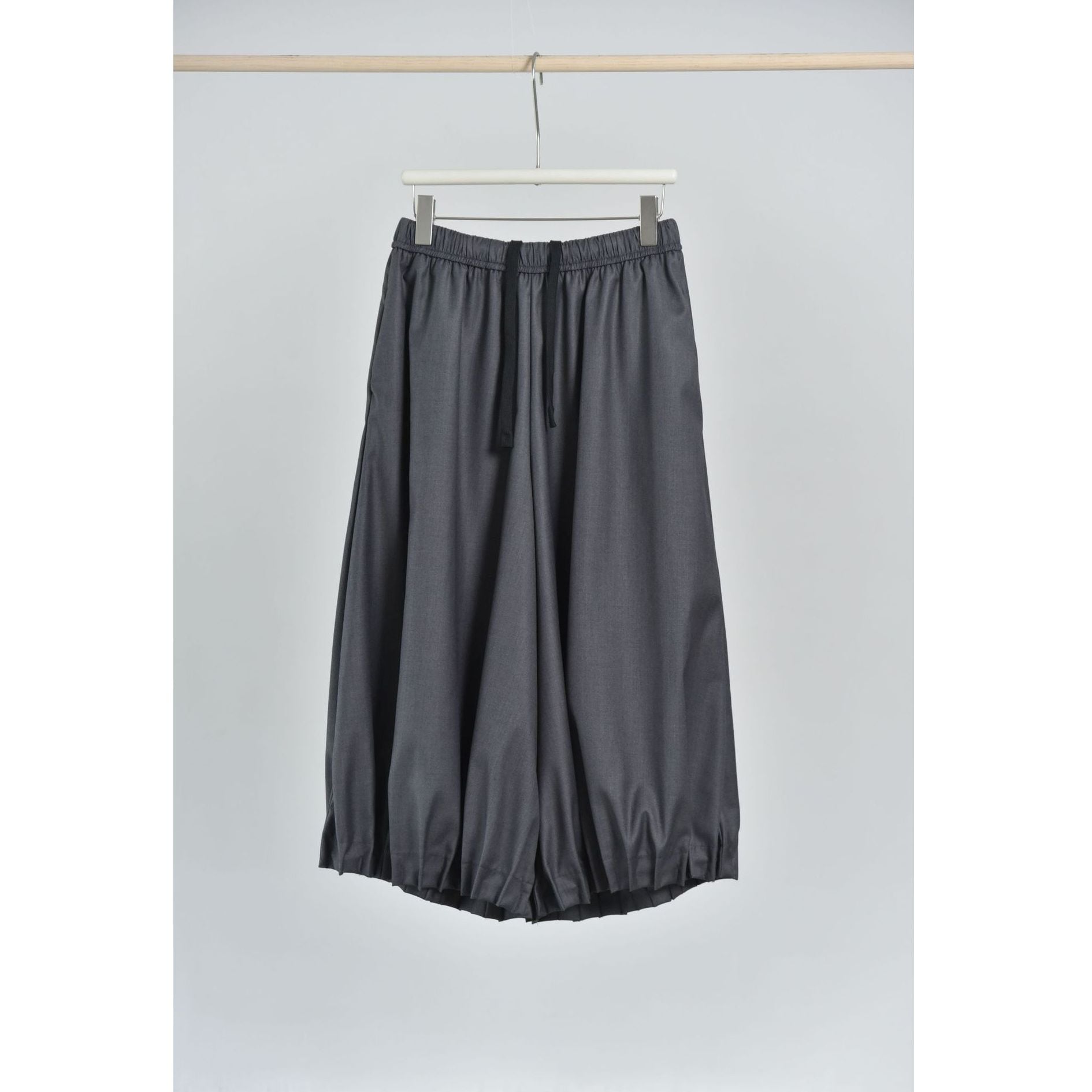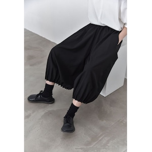 裾がプリーツ加工されたランタンのようなシルエットがお洒落な、ワイドレッグ・クロップドパンツです。ウエストはドローストリングで、履き心地が良いです。レッグラインをカバーする、オンでもオフでも使える着まわし力の高いアイテムです。色は3色から選べます。